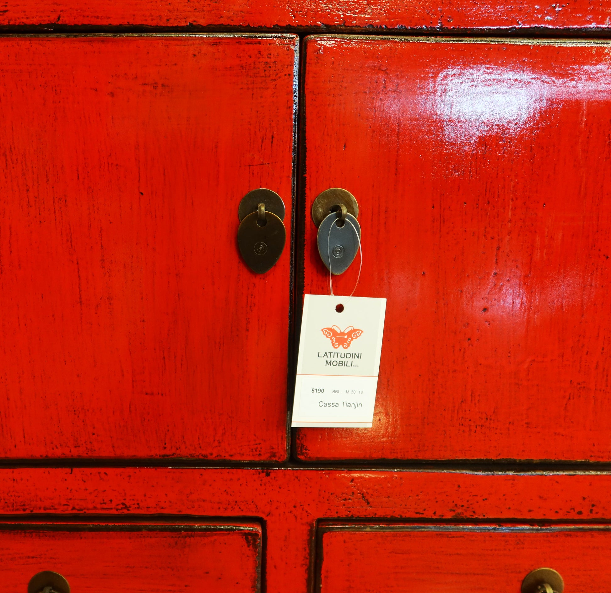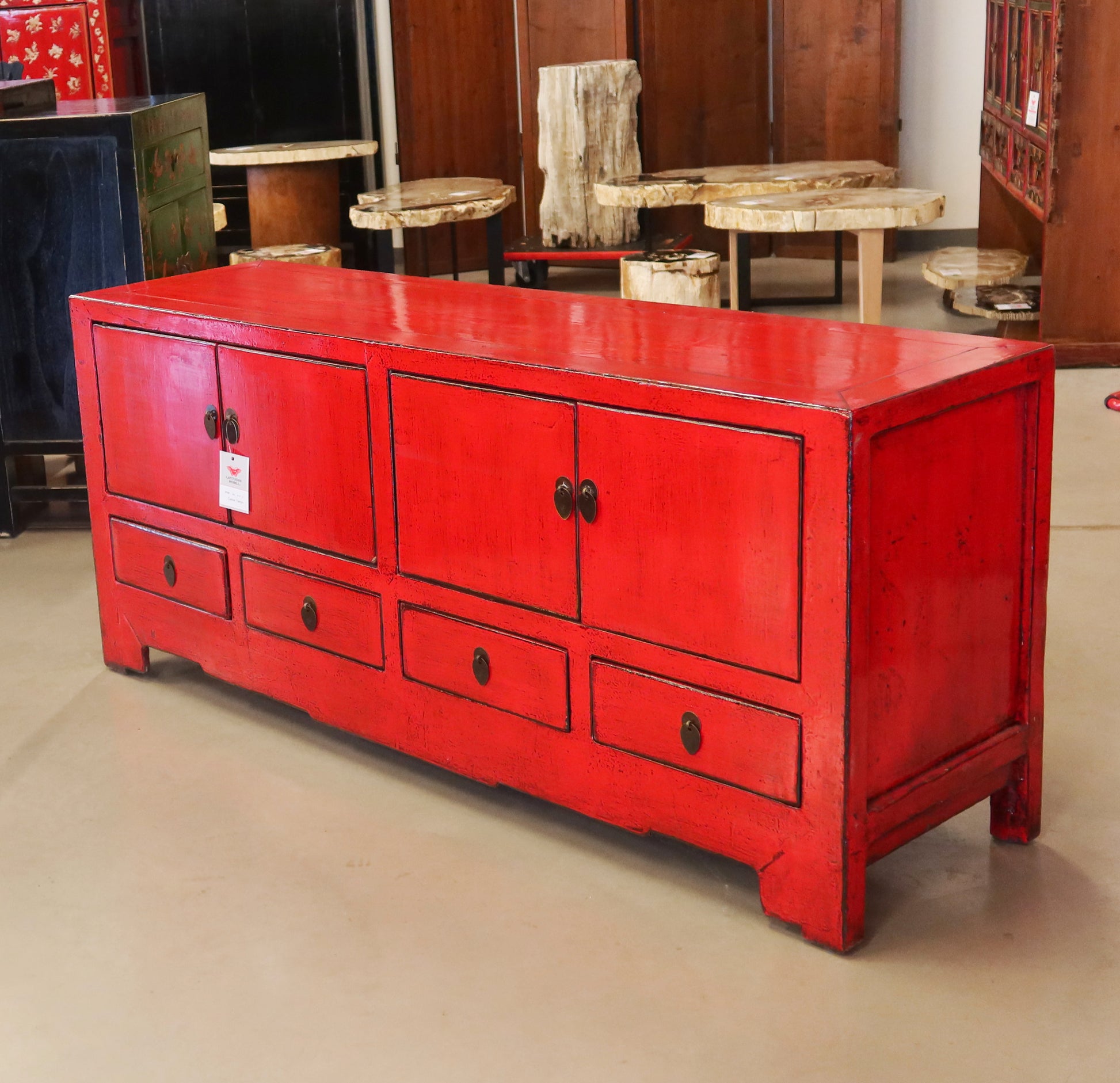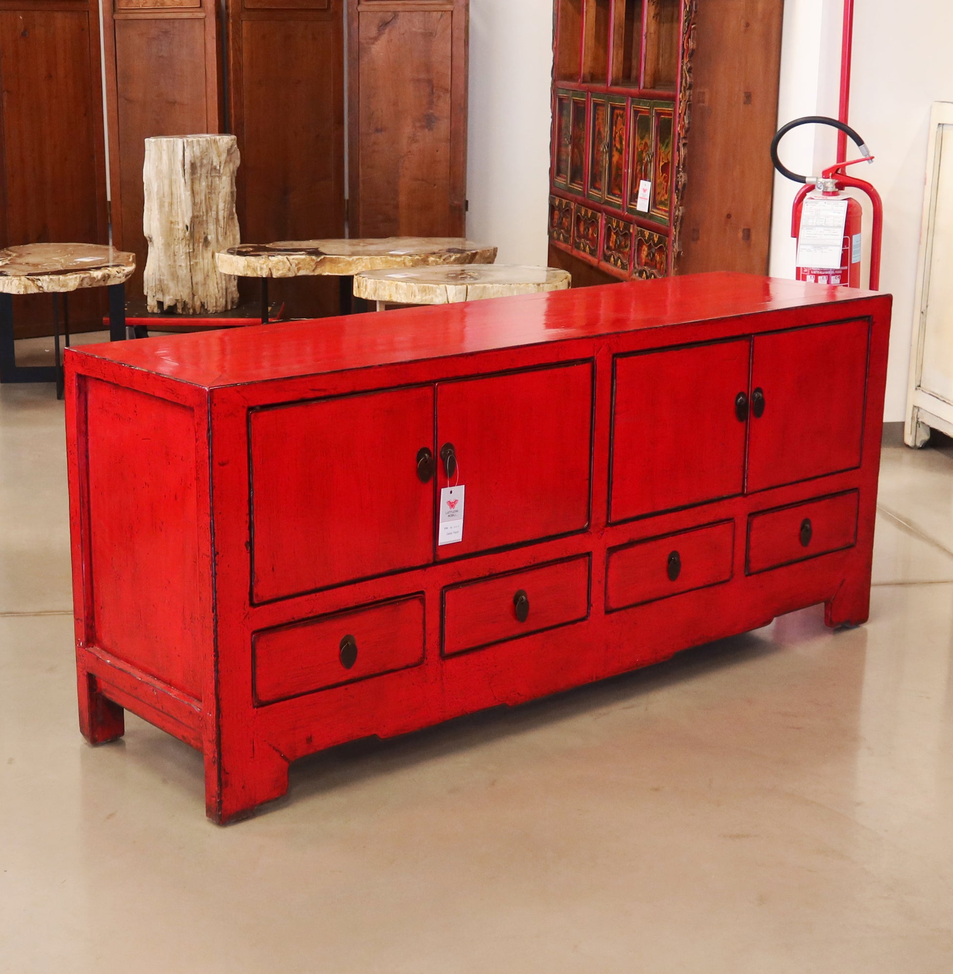 Cassapanca etnica in lacca rossa con ante e cassetti. E' il mobile etnico ideale per la televisione senza rinunciare alla funzionalità del contenimento.