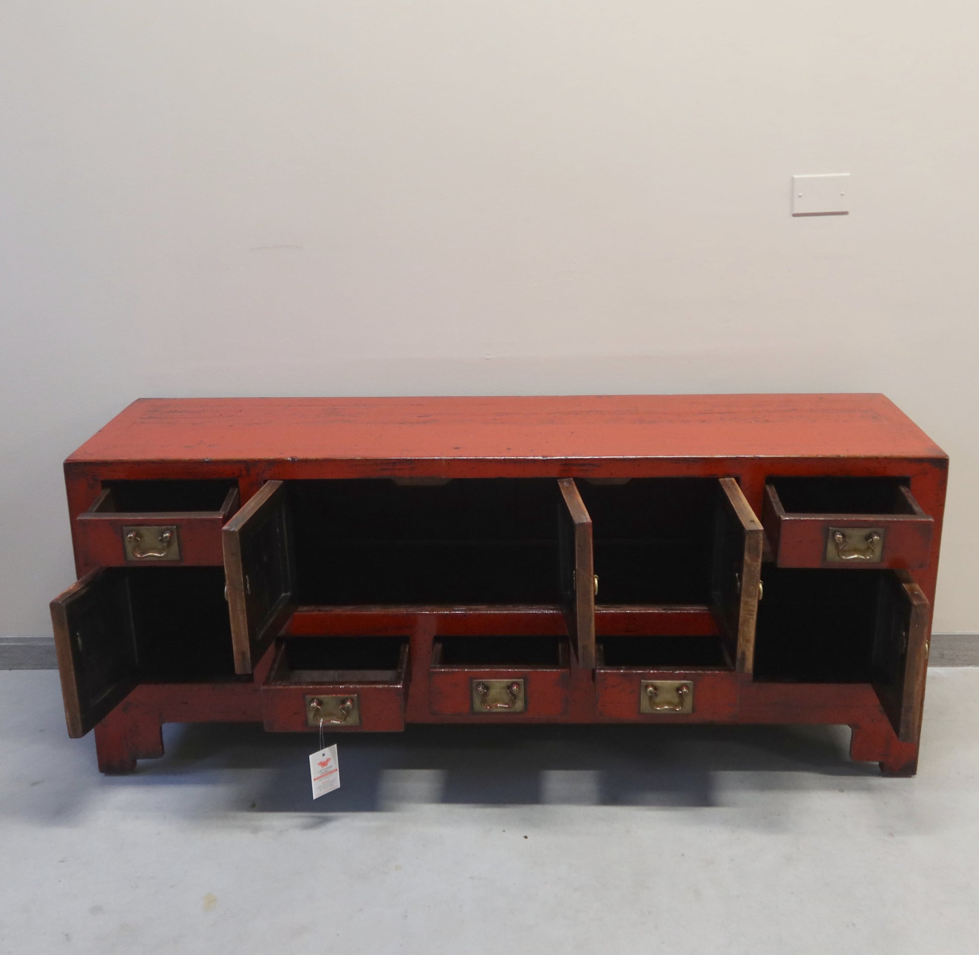 Rigorosa cassapanca etnica con apertura ben articolata di antine e cassetti. Molto bella la finitura in lacca rossa e la metalleria dorata.