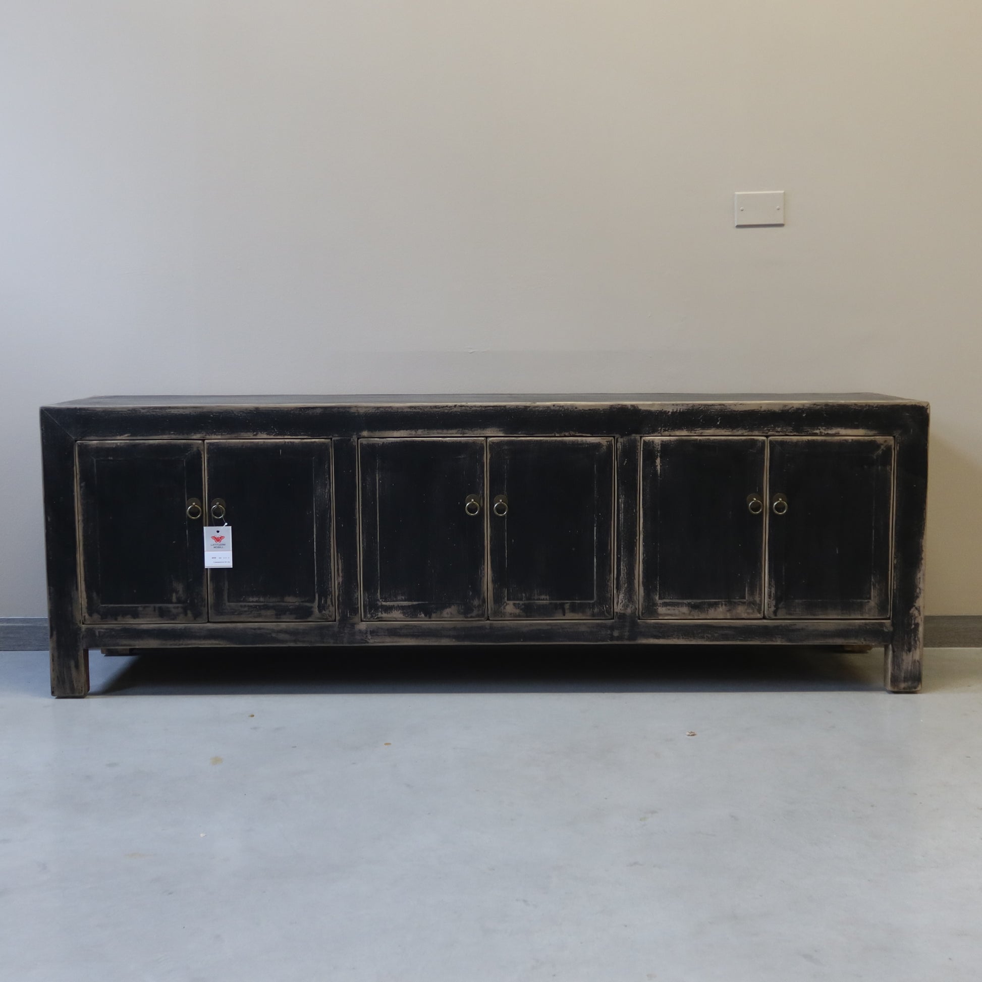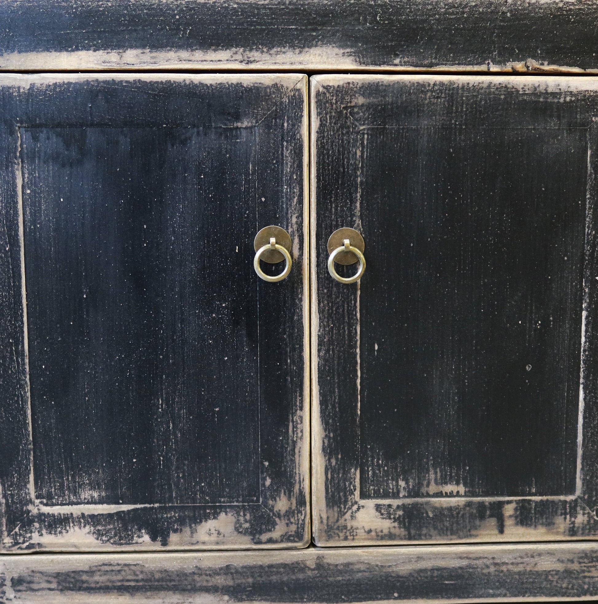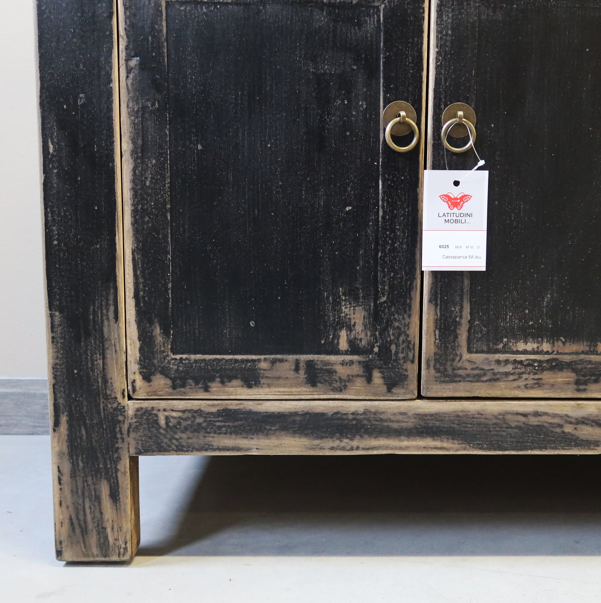 Cassapanca cinese nera con tre vani chiusi da coppie di antine. La finitura è in patina con tracce di essenza naturale originale. Mobile semplice, rigoroso e di grande eleganza.