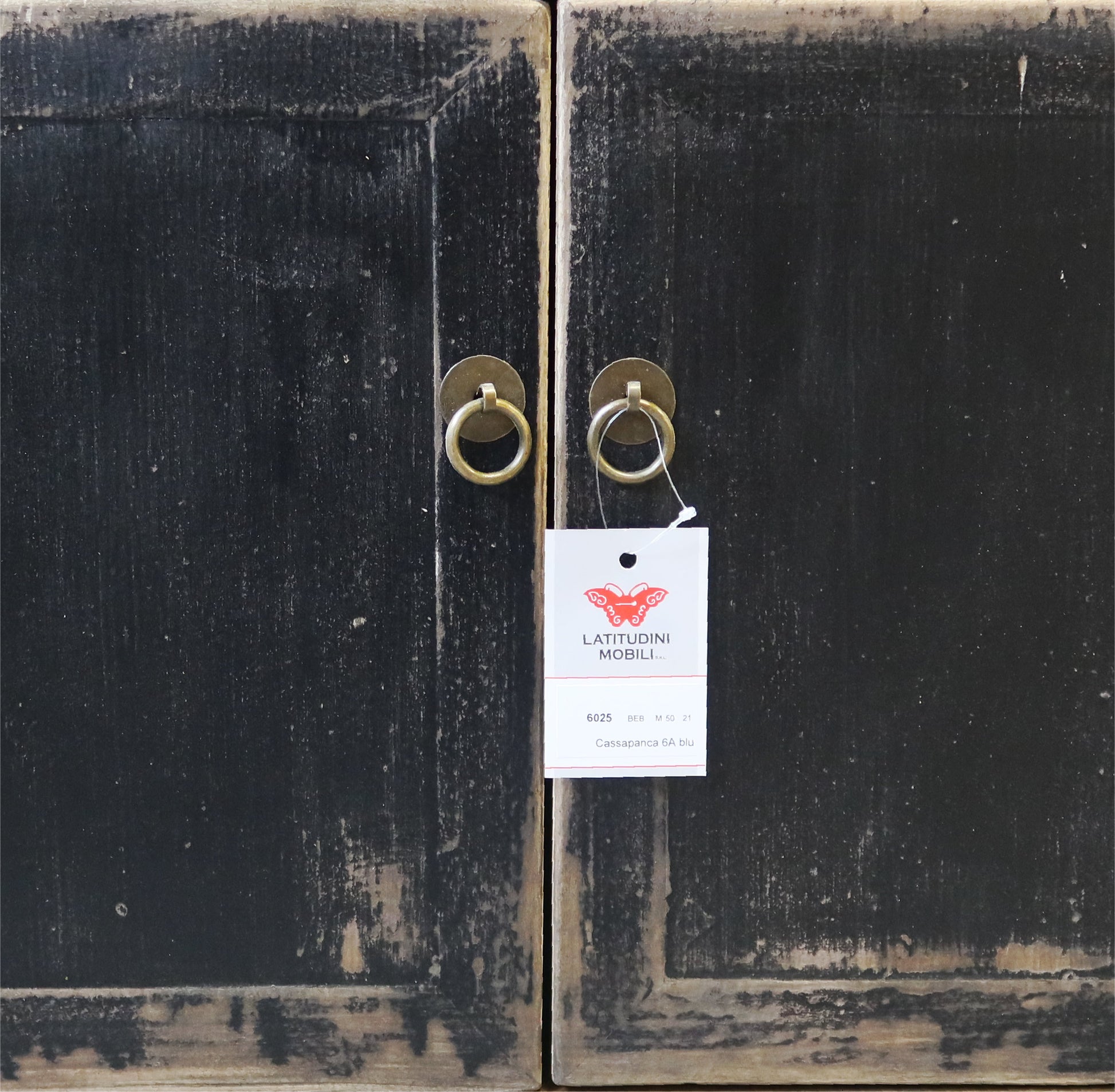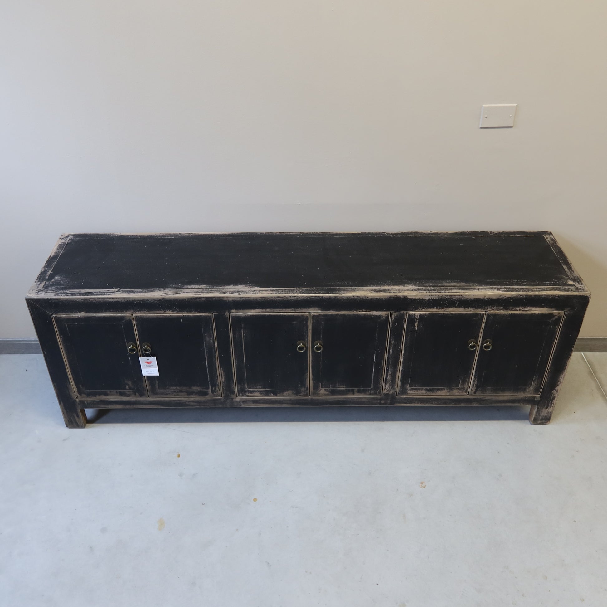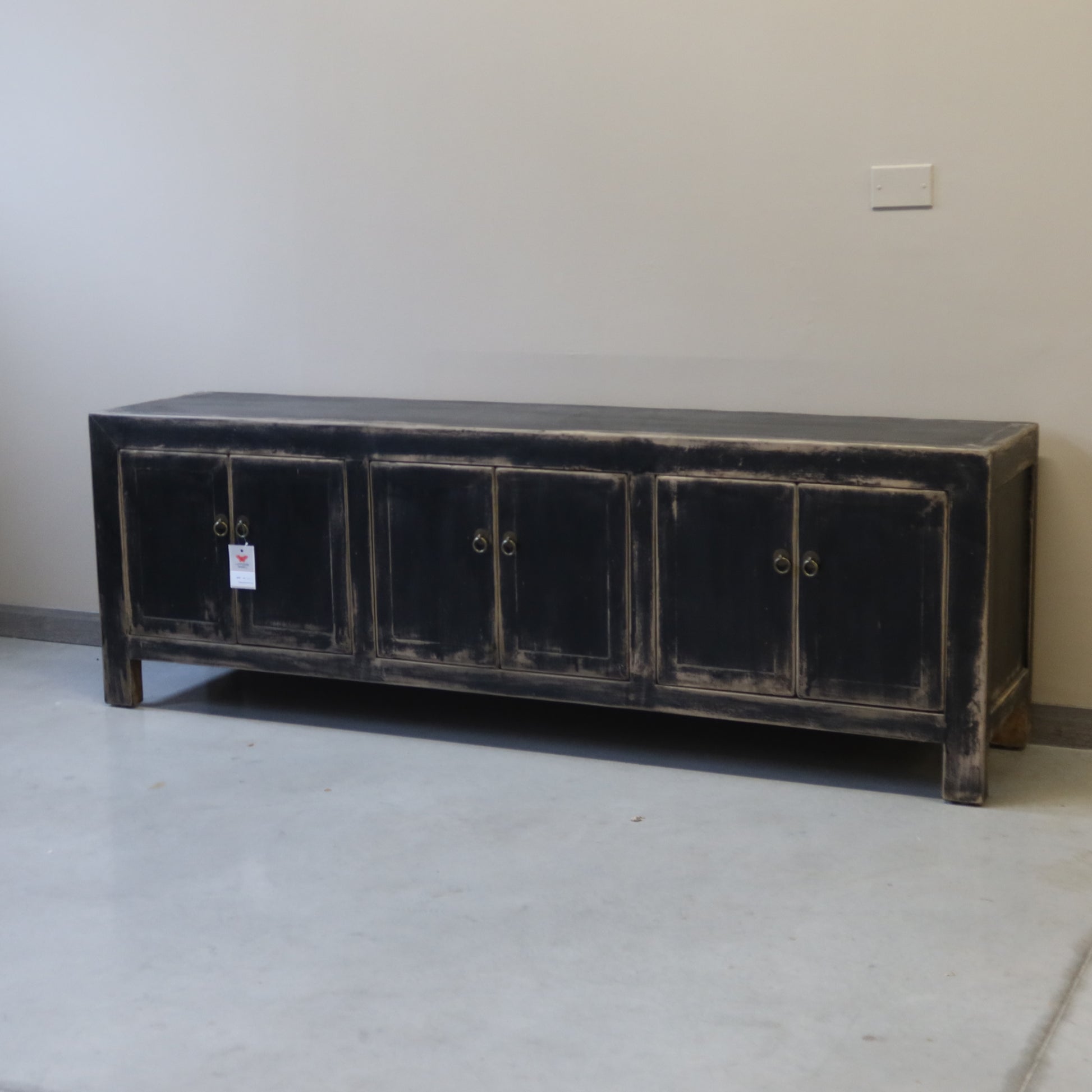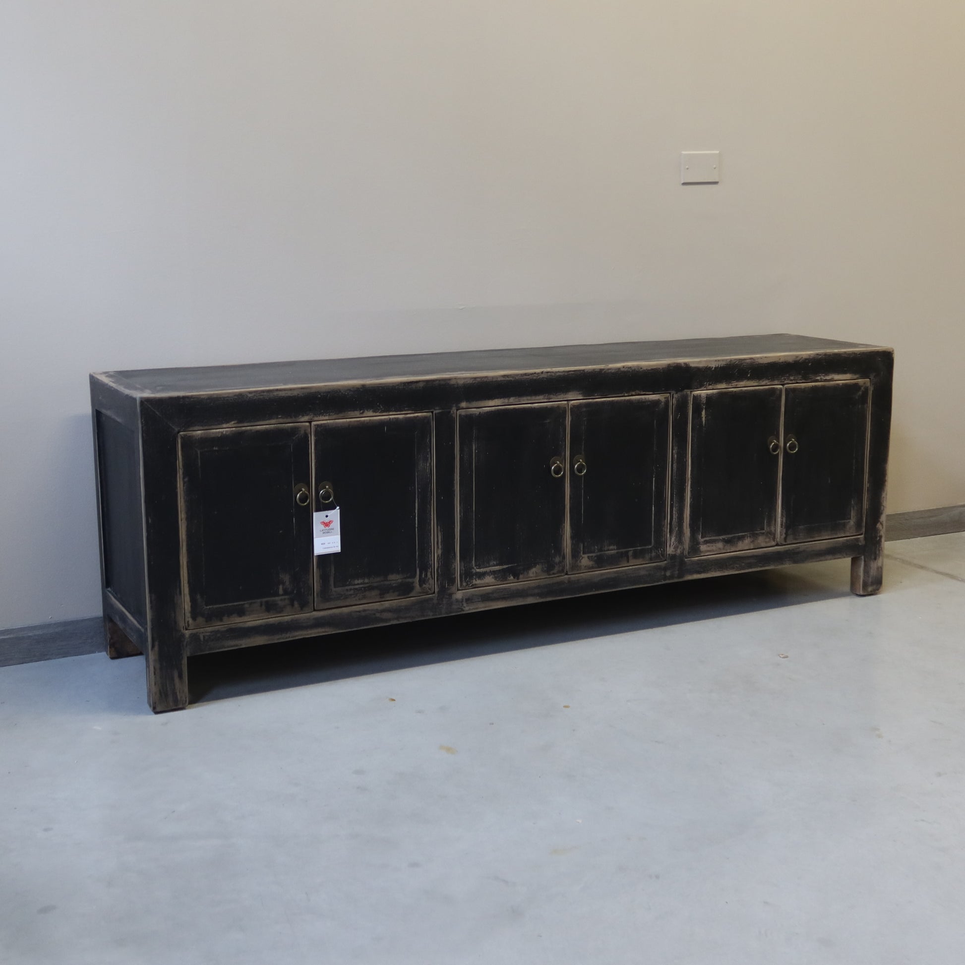 Cassapanca cinese nera con tre vani chiusi da coppie di antine. La finitura è in patina con tracce di essenza naturale originale. Mobile semplice, rigoroso e di grande eleganza.