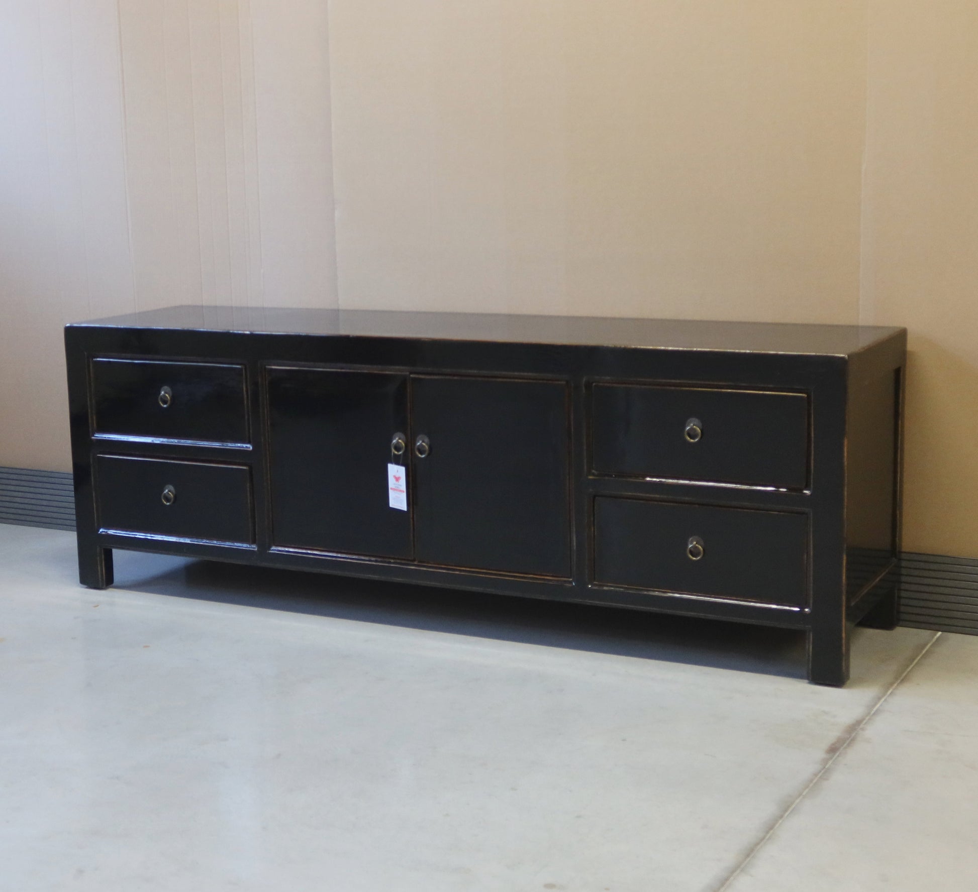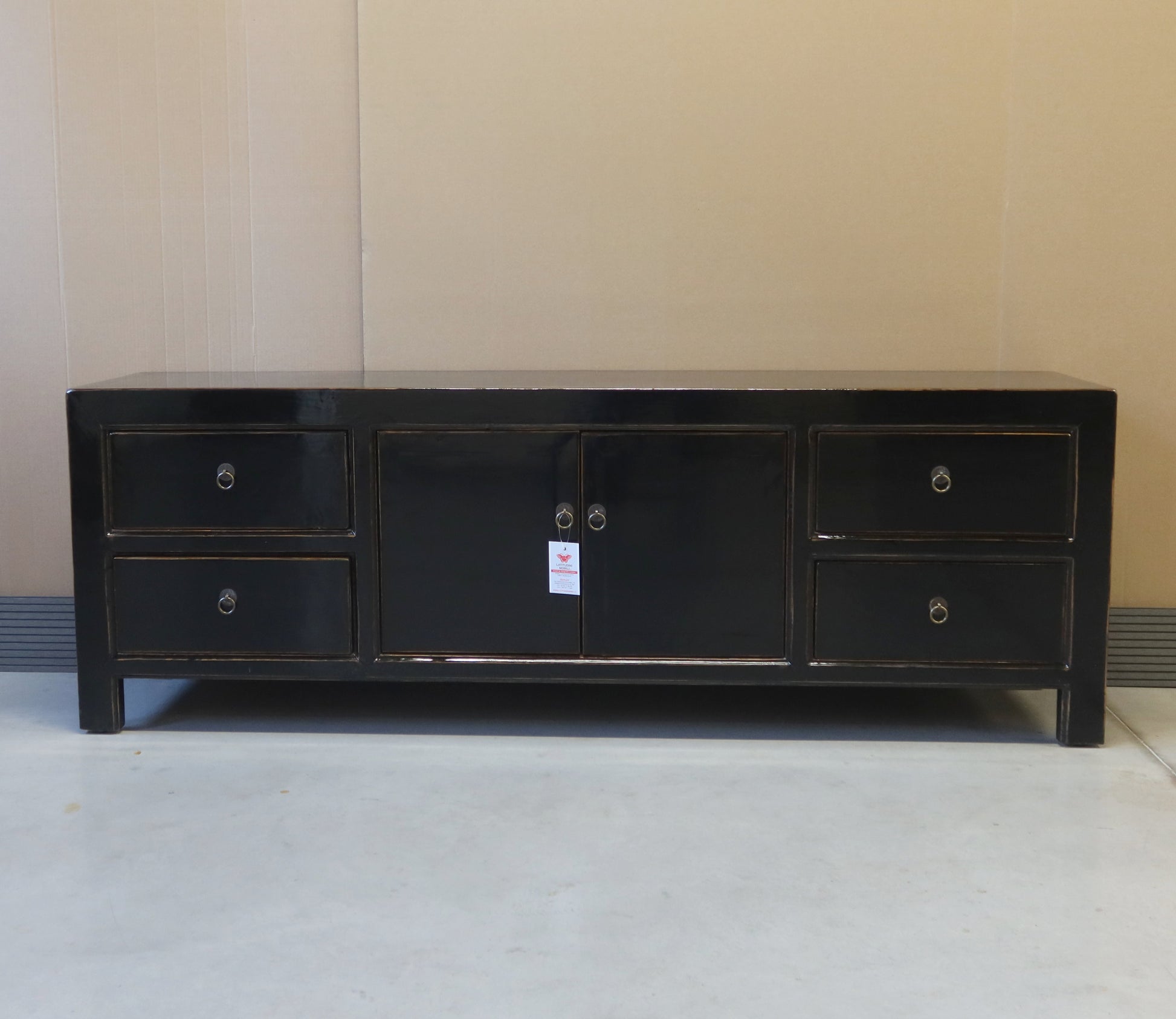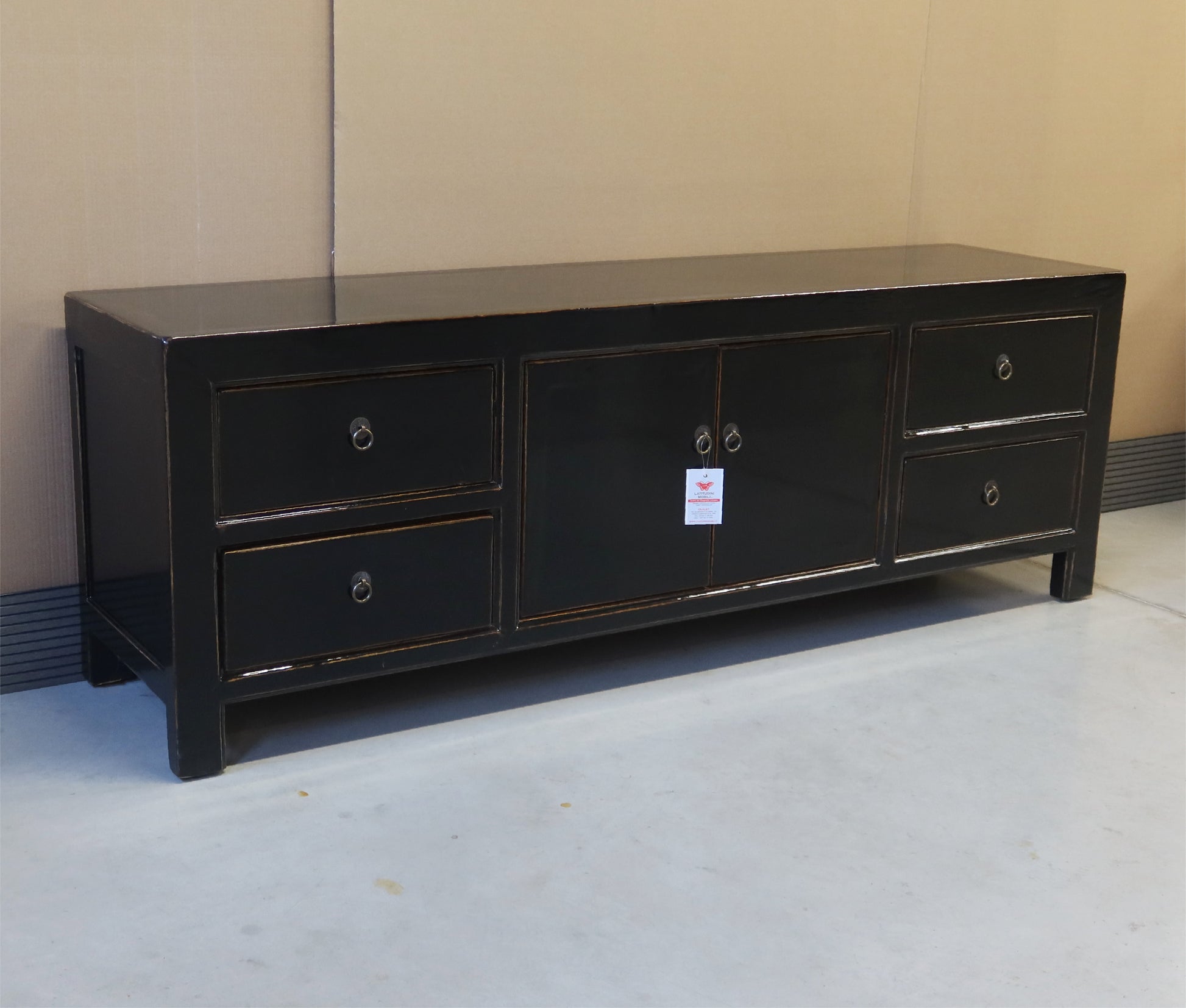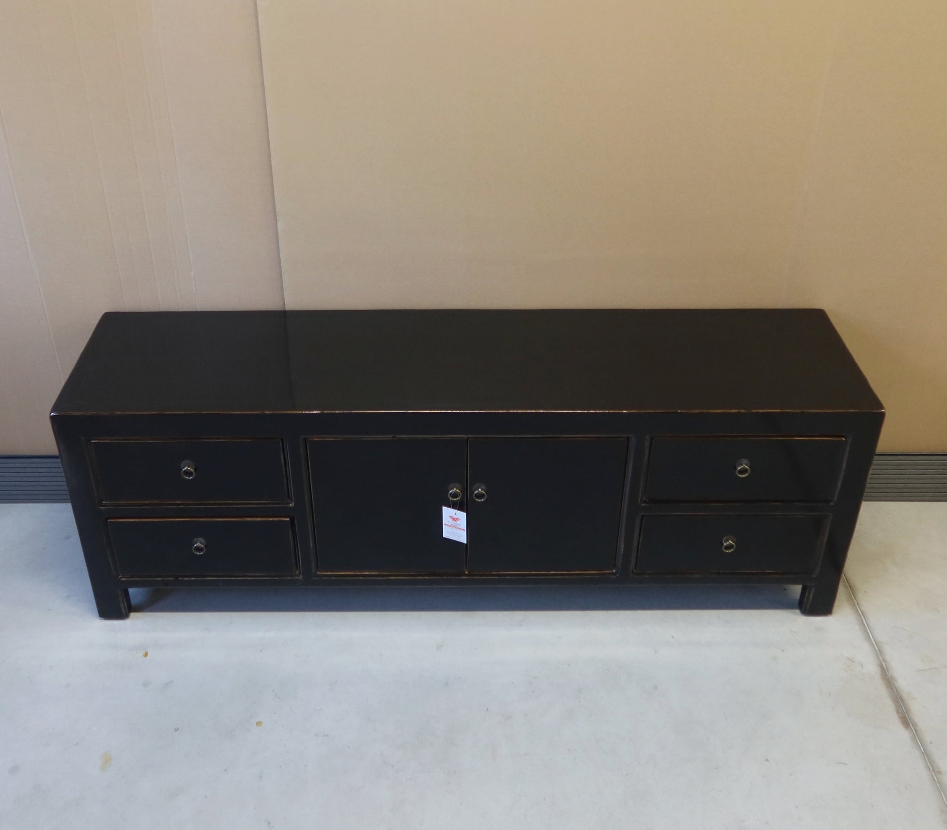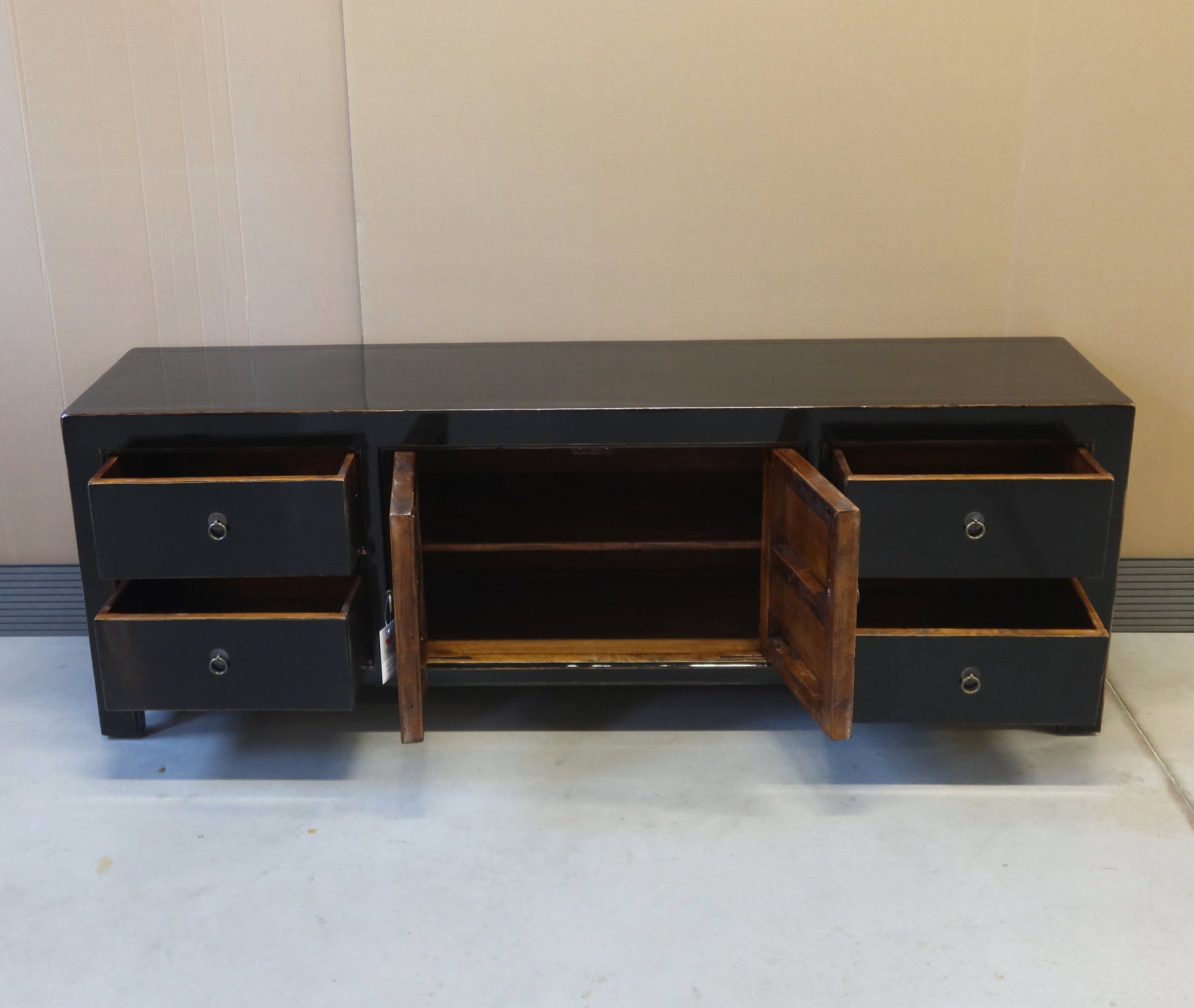Cassapanca etnica molto semplice e rigorosa con due ante simmetriche e due doppi cassetti ai lati: perfetta come porta tv in una zona living funzionale e di personalità.