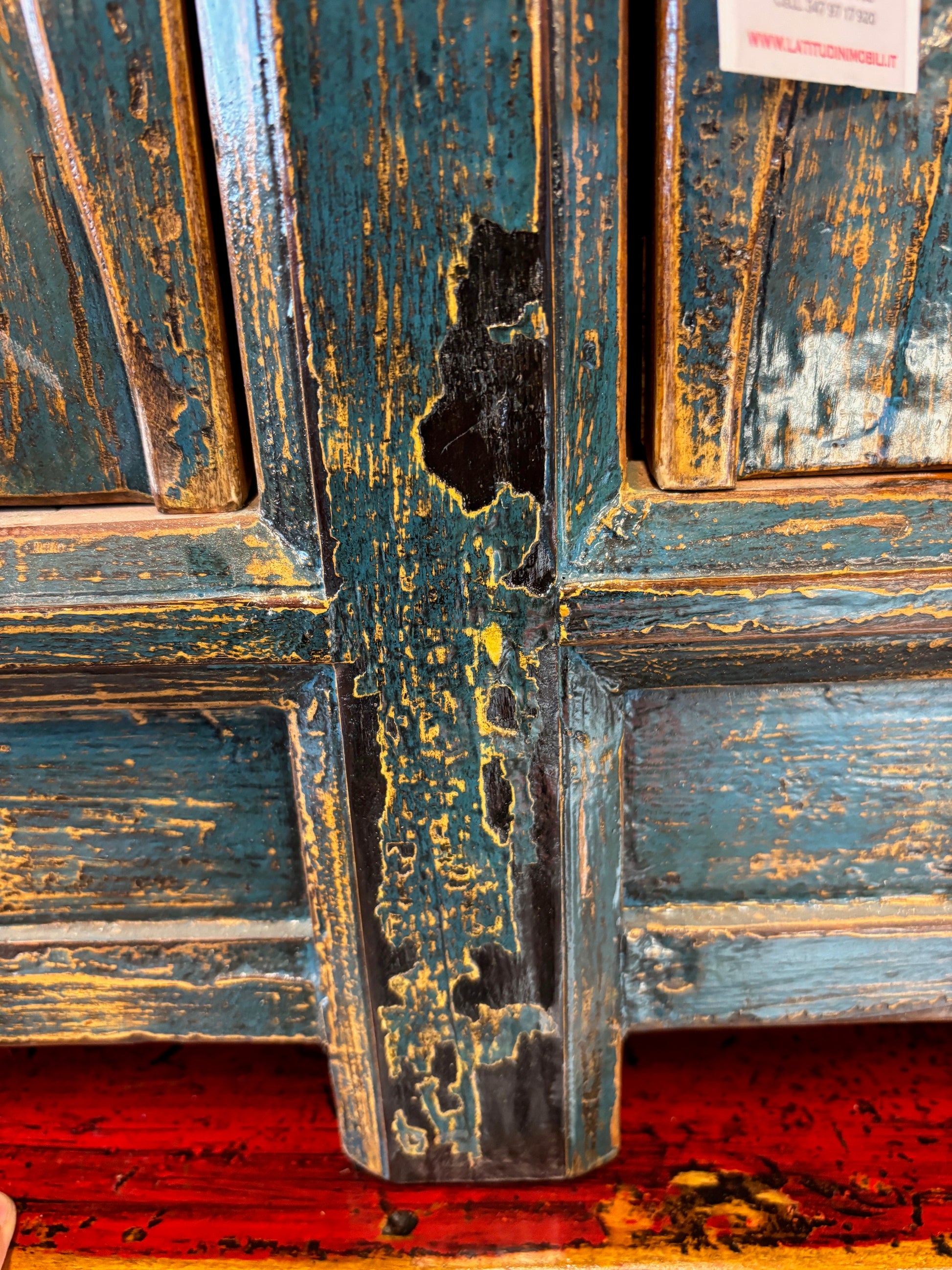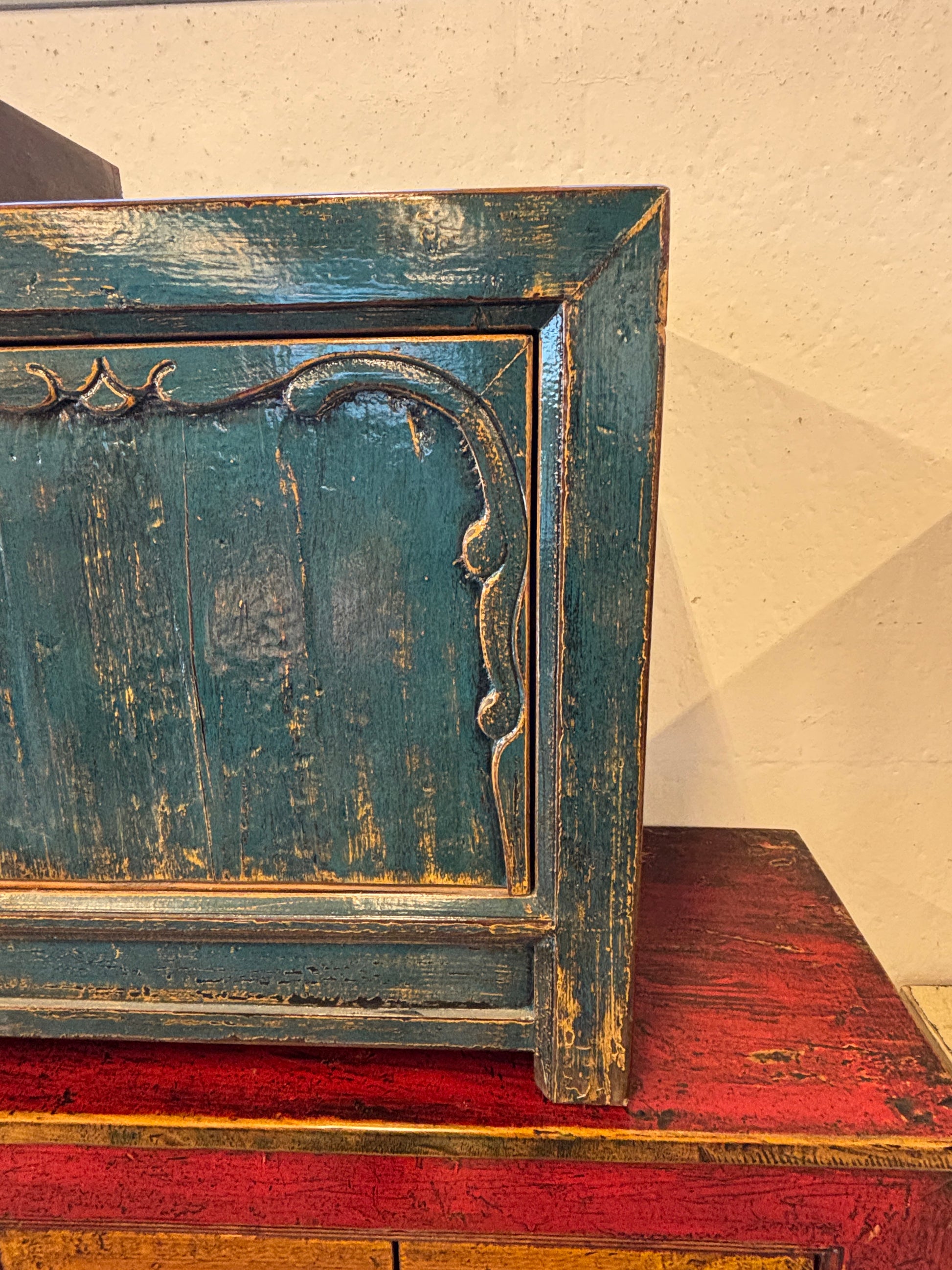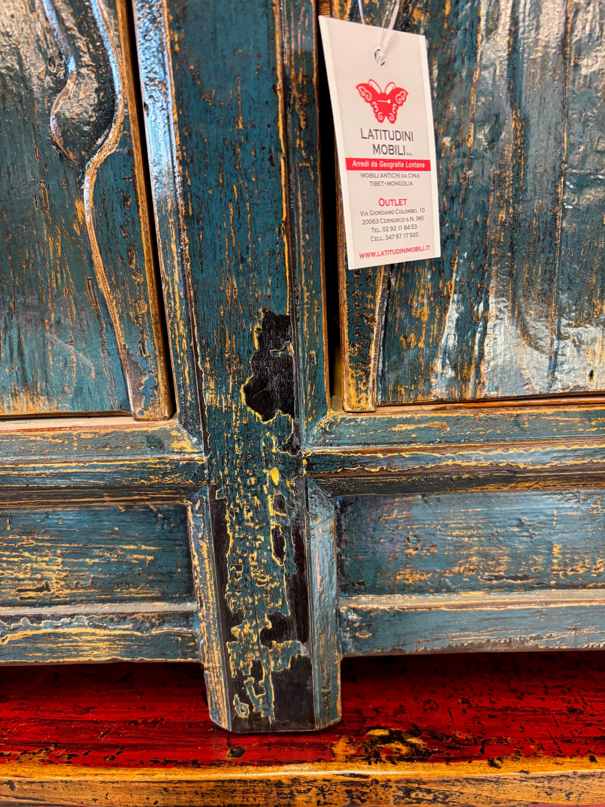 Cassapanca etnica a triplo vano con fronte in lacca monocromatica arricchito da ante con frame a sbalzo. Un triplo grembiulino sagomato di raccordo tra le gambe anch'esso in lacca policroma completa la parte inferiore del fronte. Regione di provenienza Ganzu.