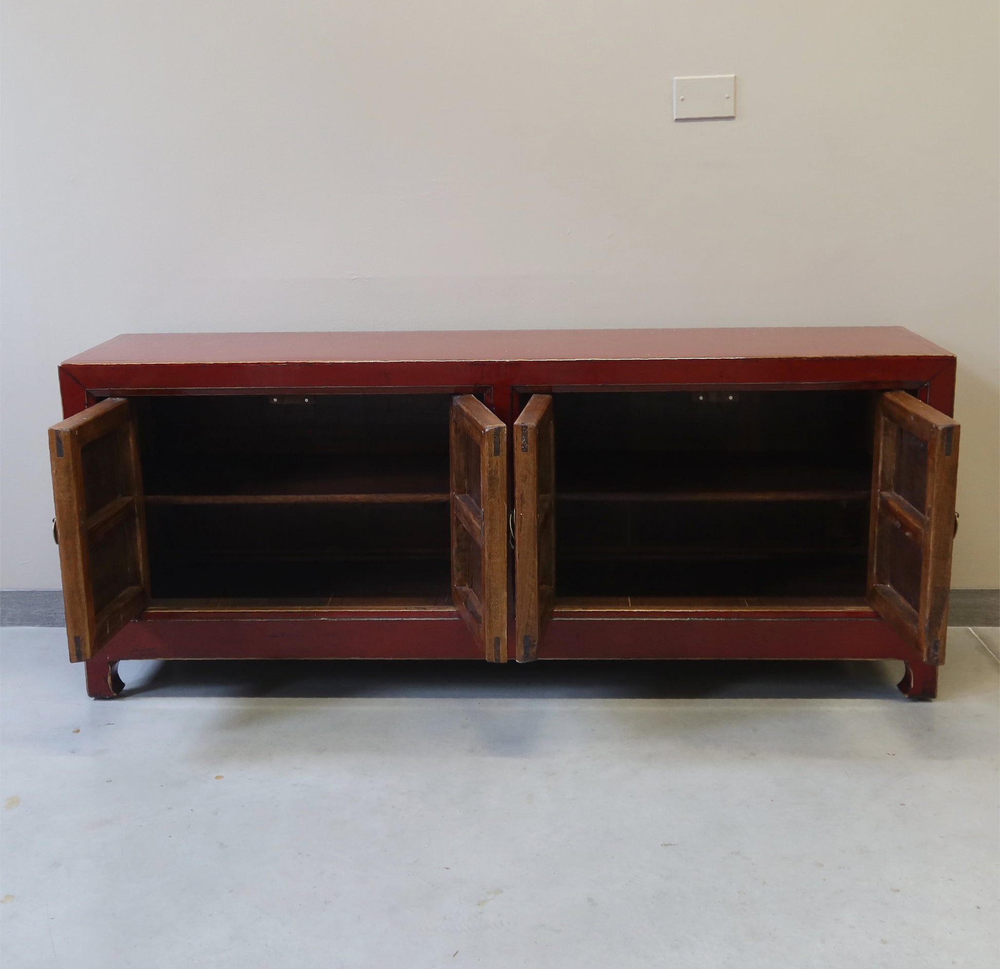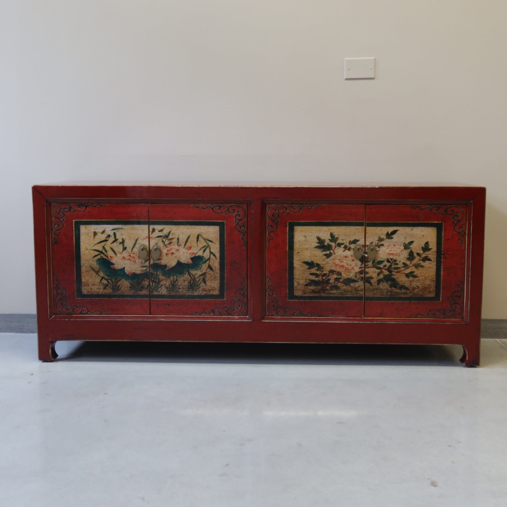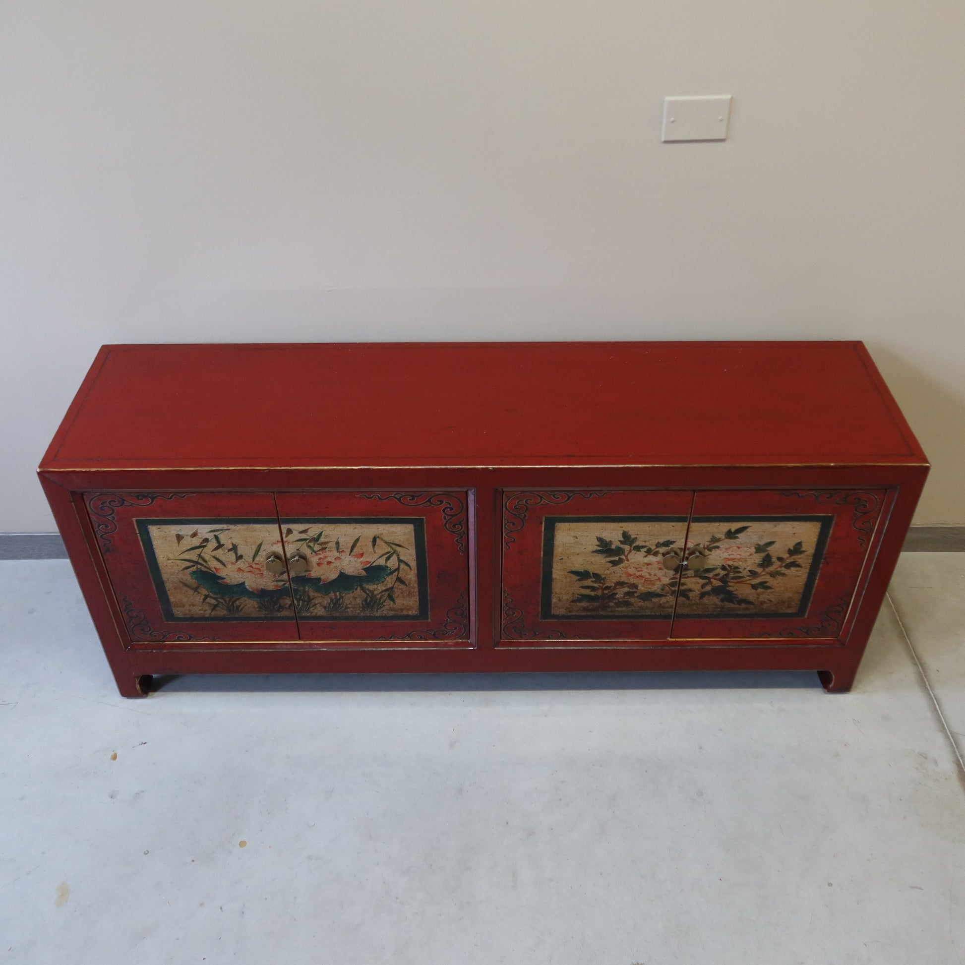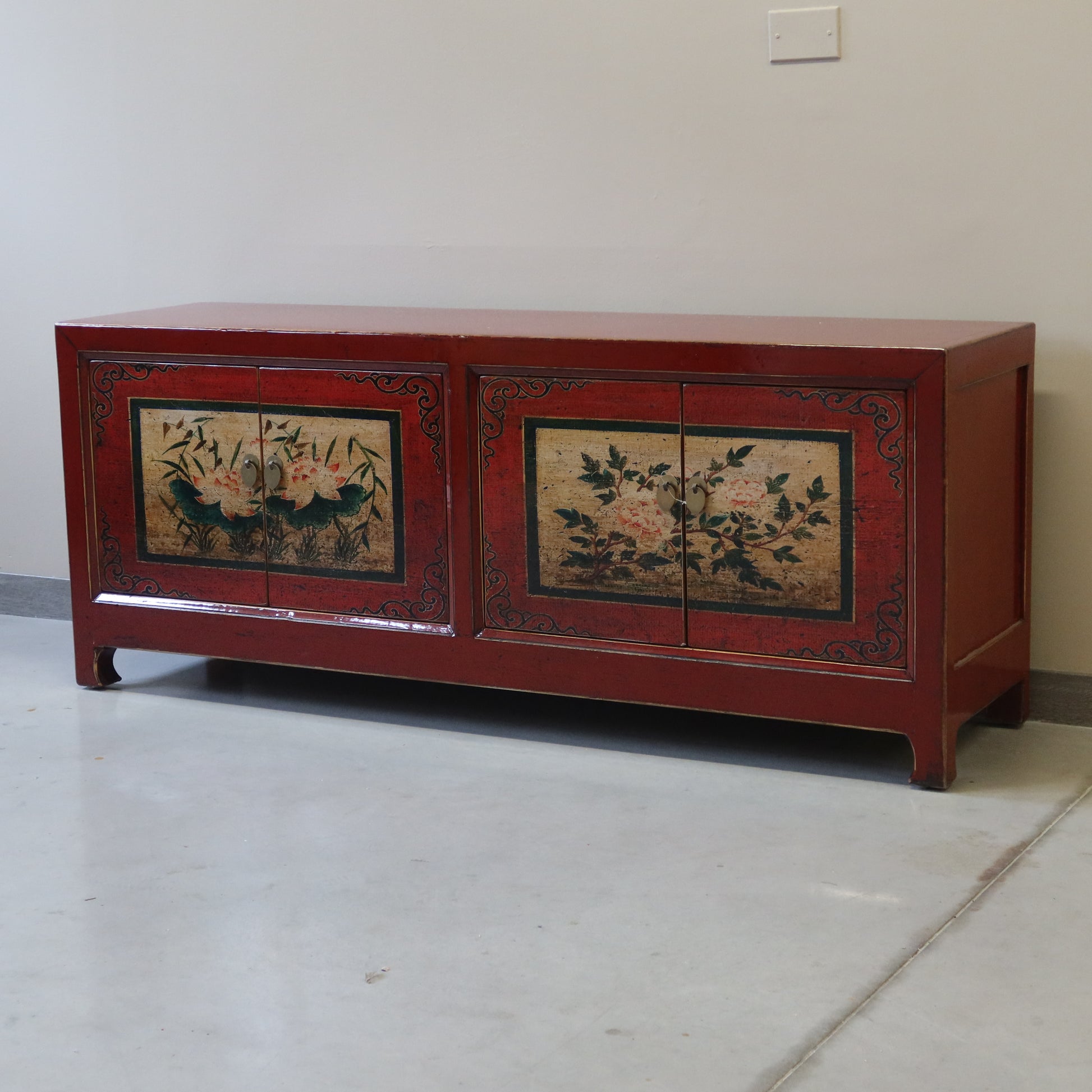 Rigorosa cassapanca a due vani con struttura in lacca rossa e doppia coppia di ante decorate caratterizzate da motivi di tipo floreale.