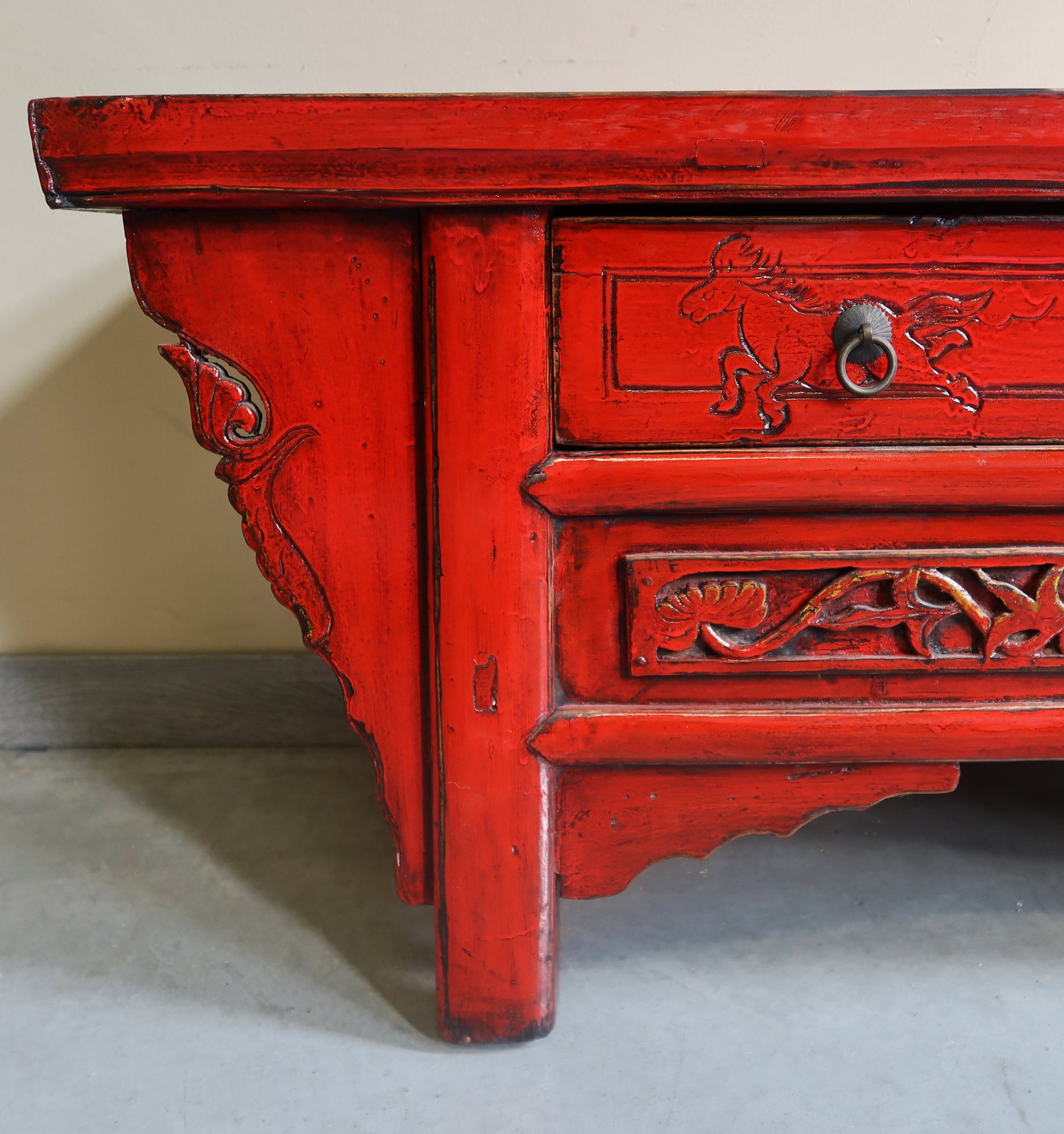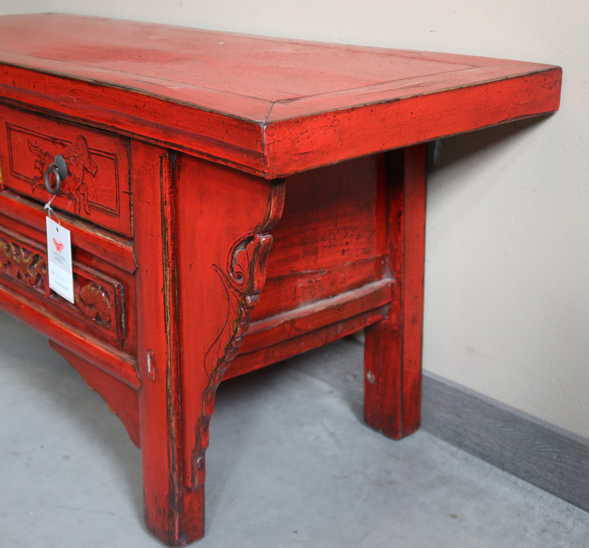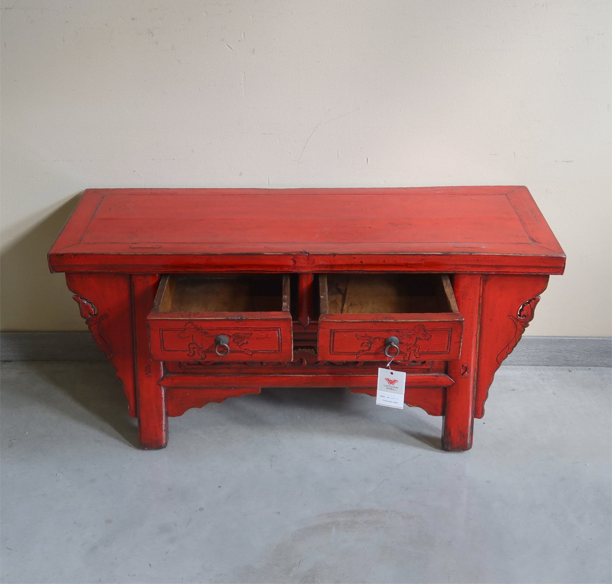 Cassapanchina a due cassetti dal forte sapore etnico con finitura in lacca rossa, con ali di raccordo al piano e delicato intaglio sul grembiule nella parte inferiore. Le ali di raccordo al piano aggettante sono sagomate.
