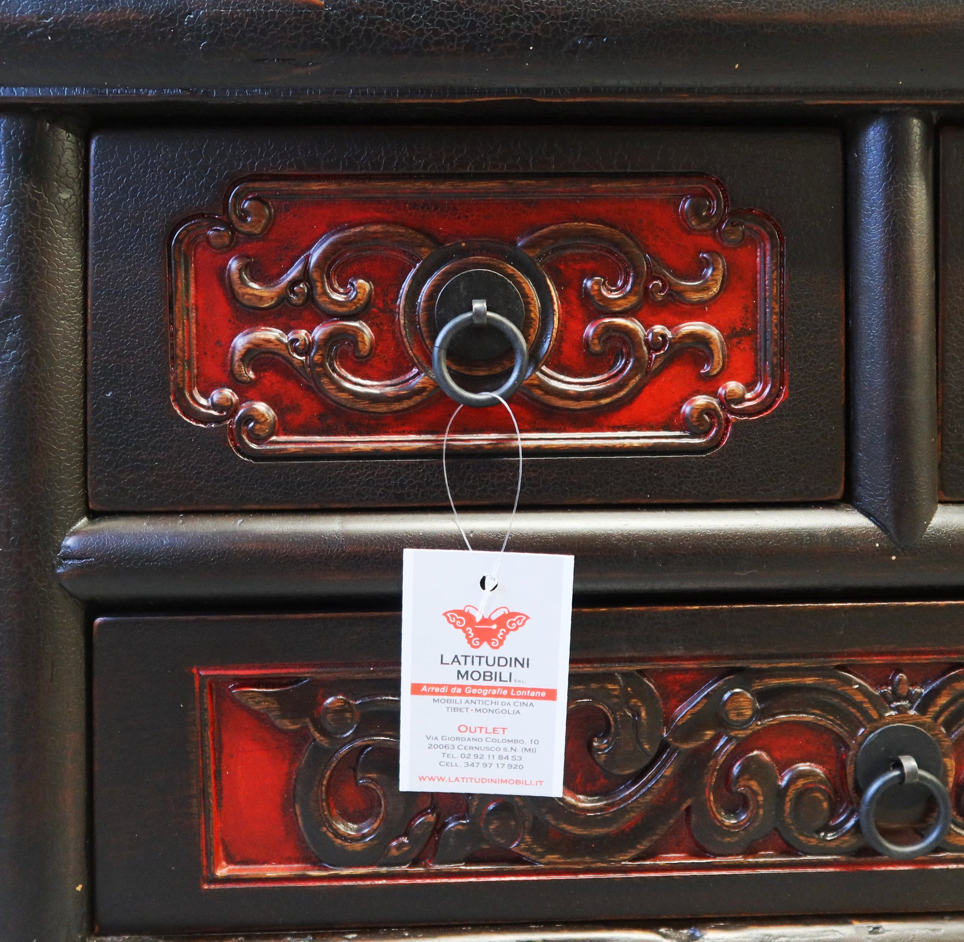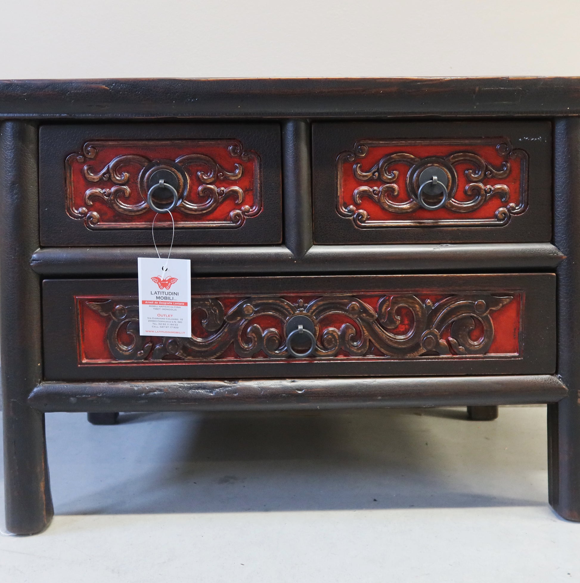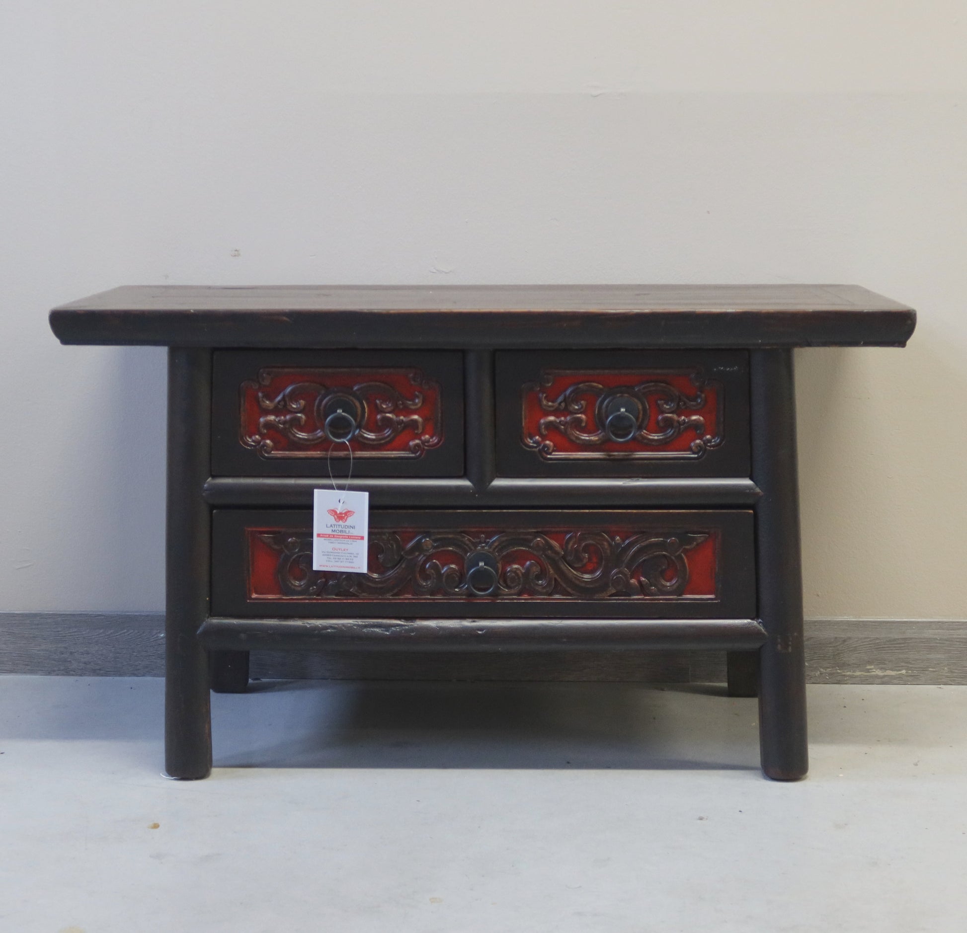 Cassapanchina a due cassetti dal forte sapore etnico con finitura in lacca, con top aggettante e delicato intaglio sui cassetti. Essenza olmo cinese, provenienza regione d Pechino.