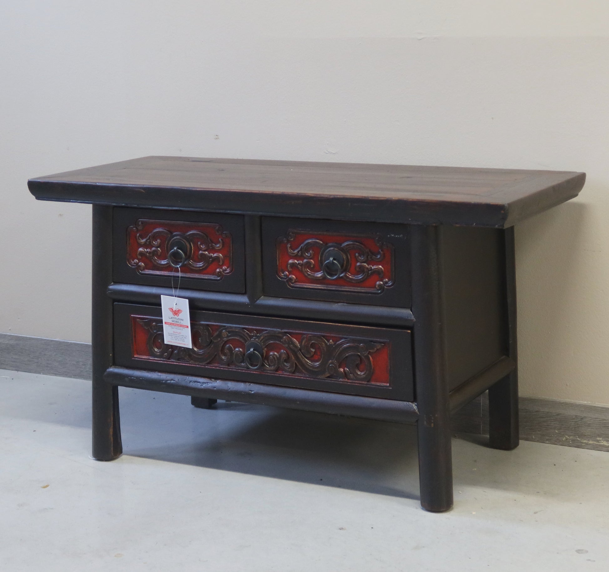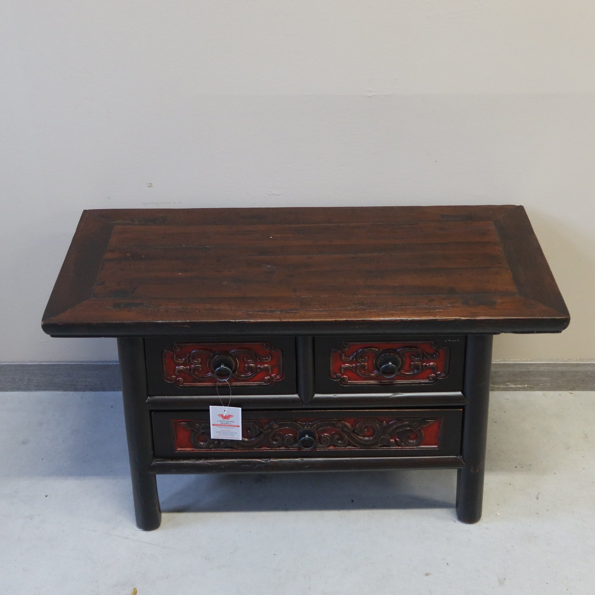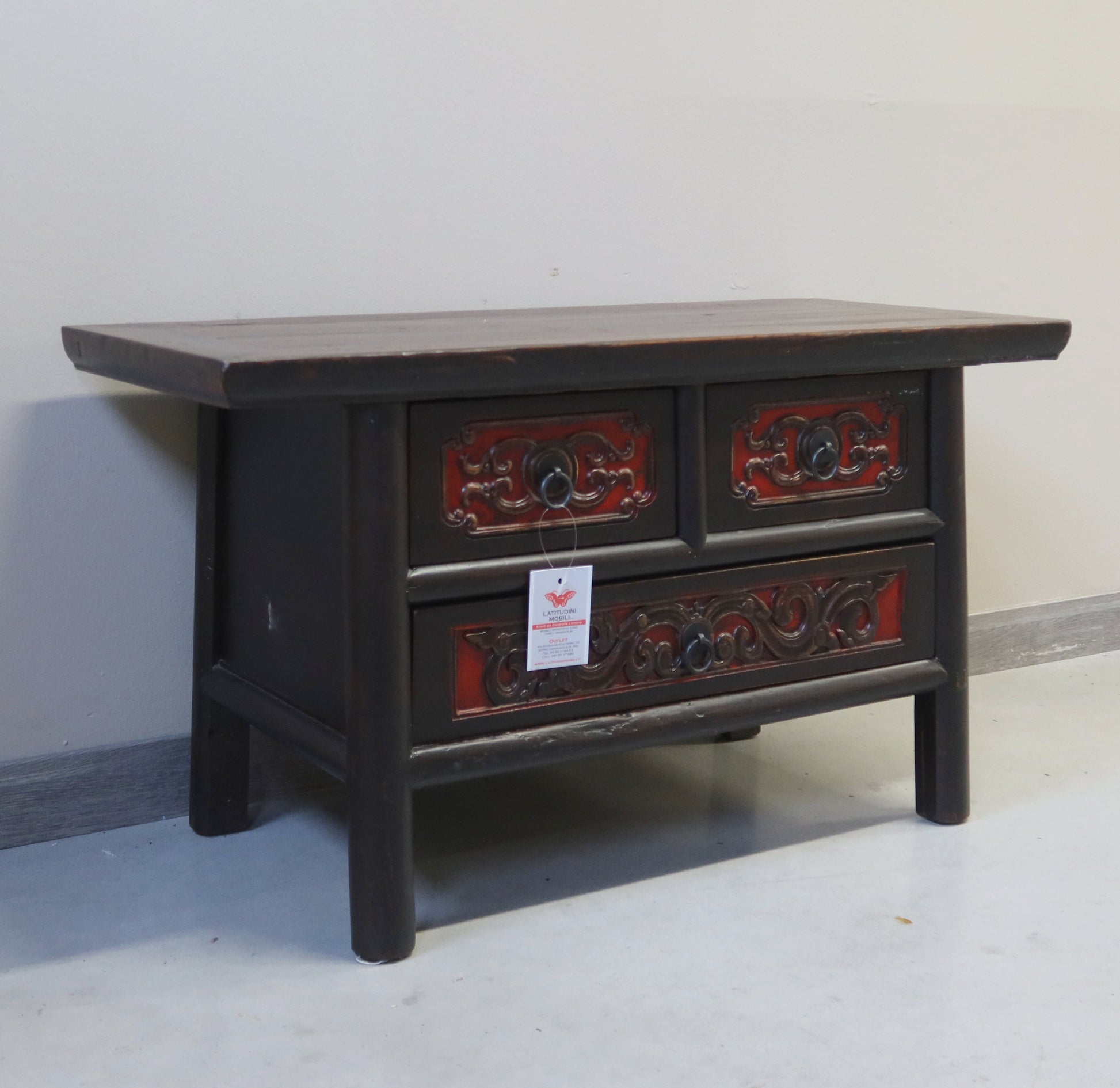 Cassapanchina a due cassetti dal forte sapore etnico con finitura in lacca, con top aggettante e delicato intaglio sui cassetti. Essenza olmo cinese, provenienza regione d Pechino.
