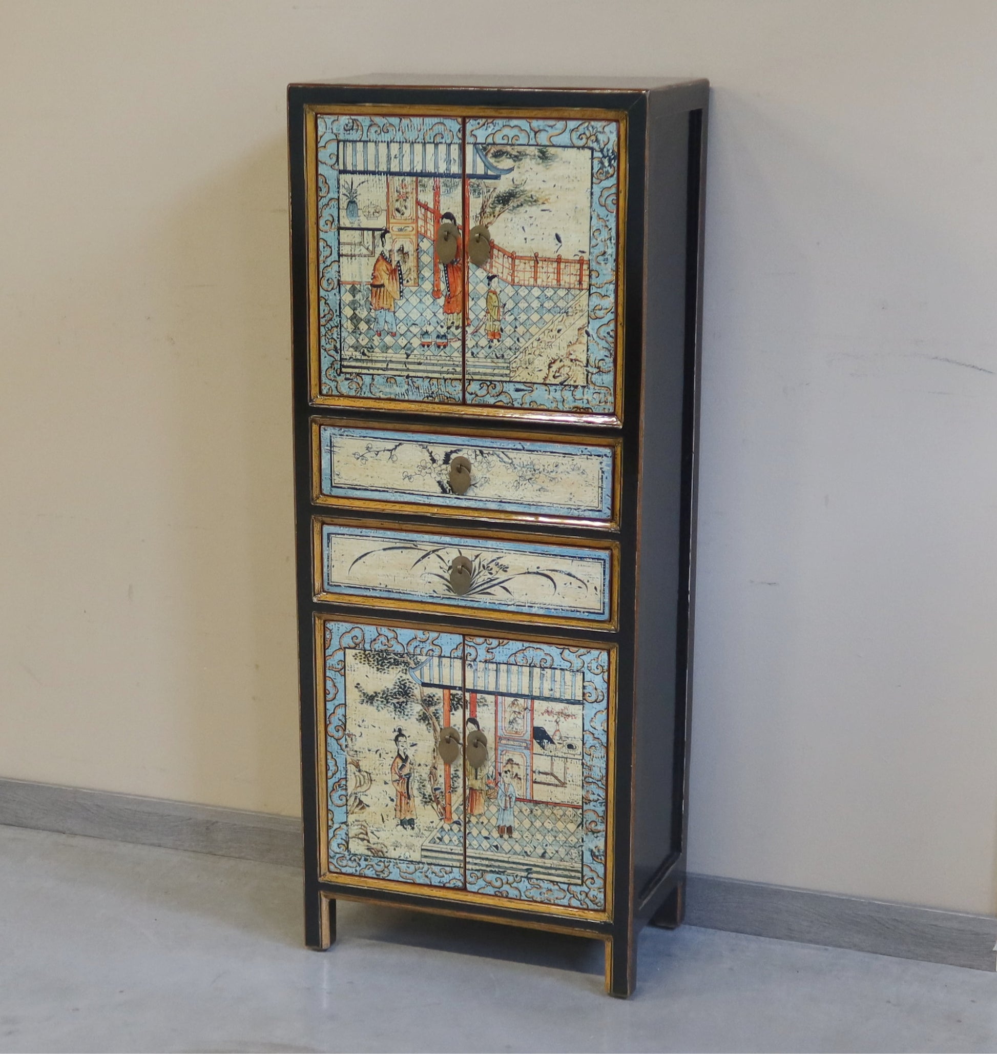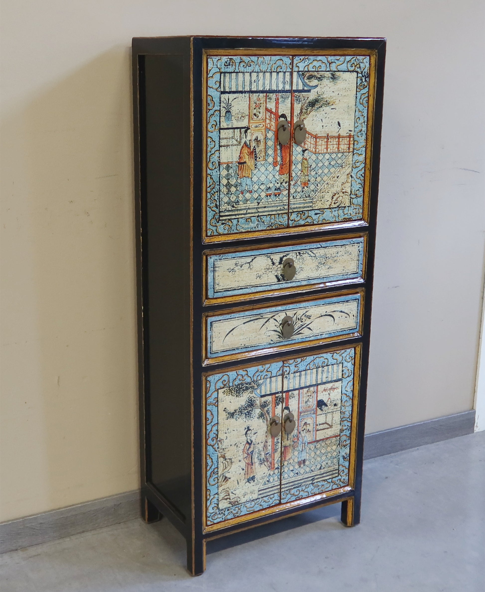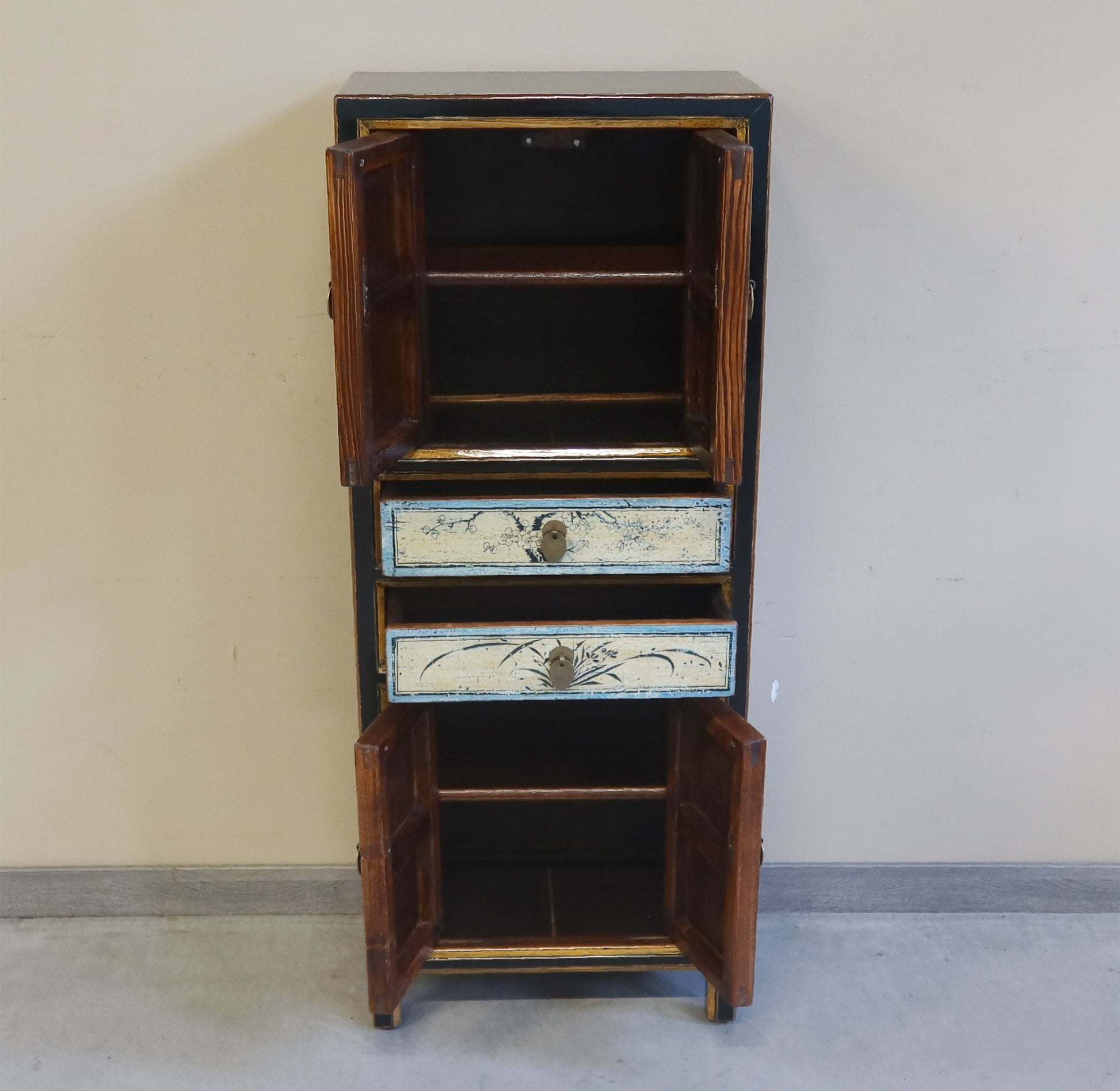 Elegante armadietto stretto cinese a colonna, a doppio vano e doppi cassetti: un graziosissimo mobile adatto sia a contenere sia anche a impreziosire quell'angolino della casa che ha dimensioni troppo ridotte e in cui non possono stare mobili più grandi