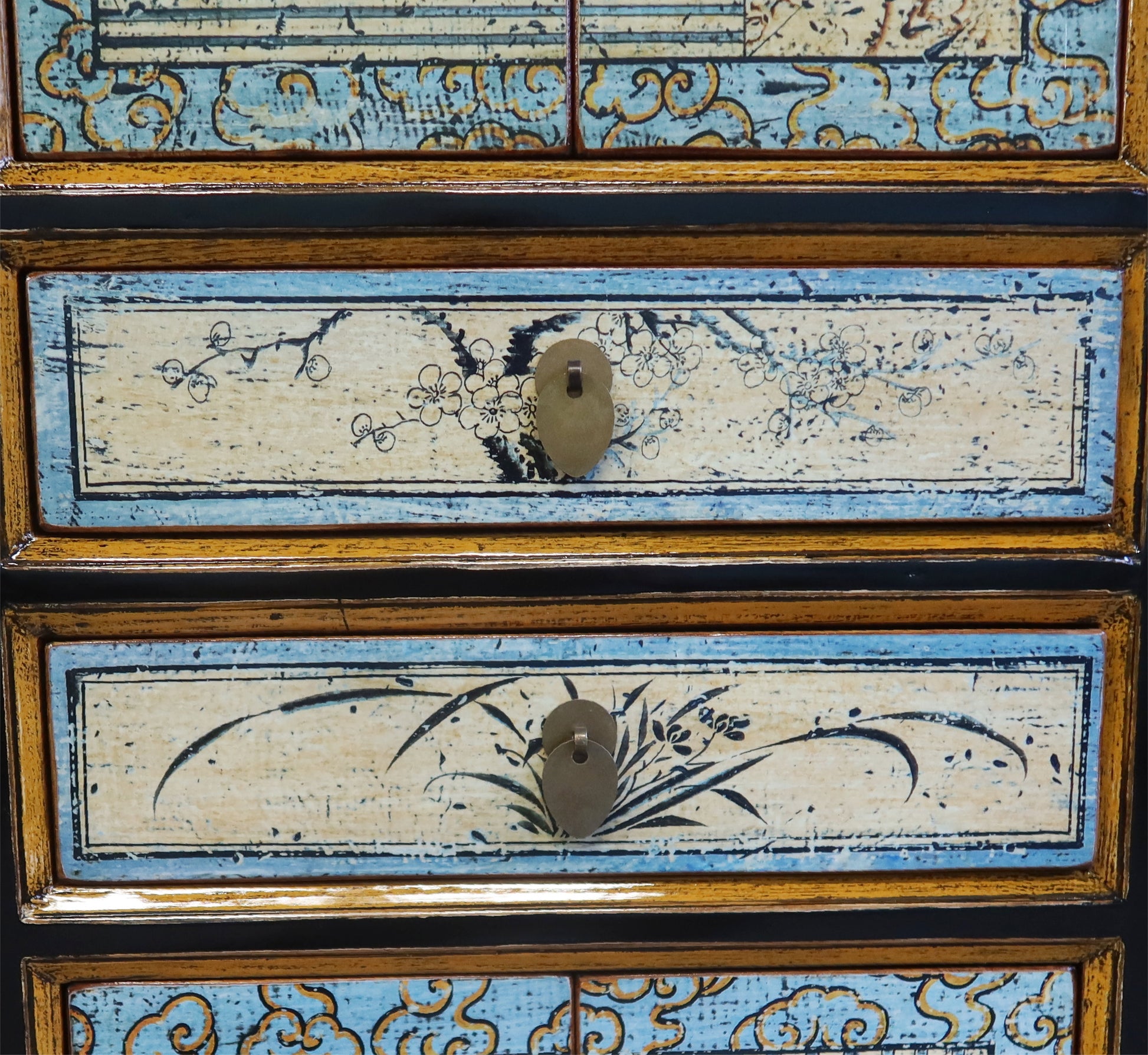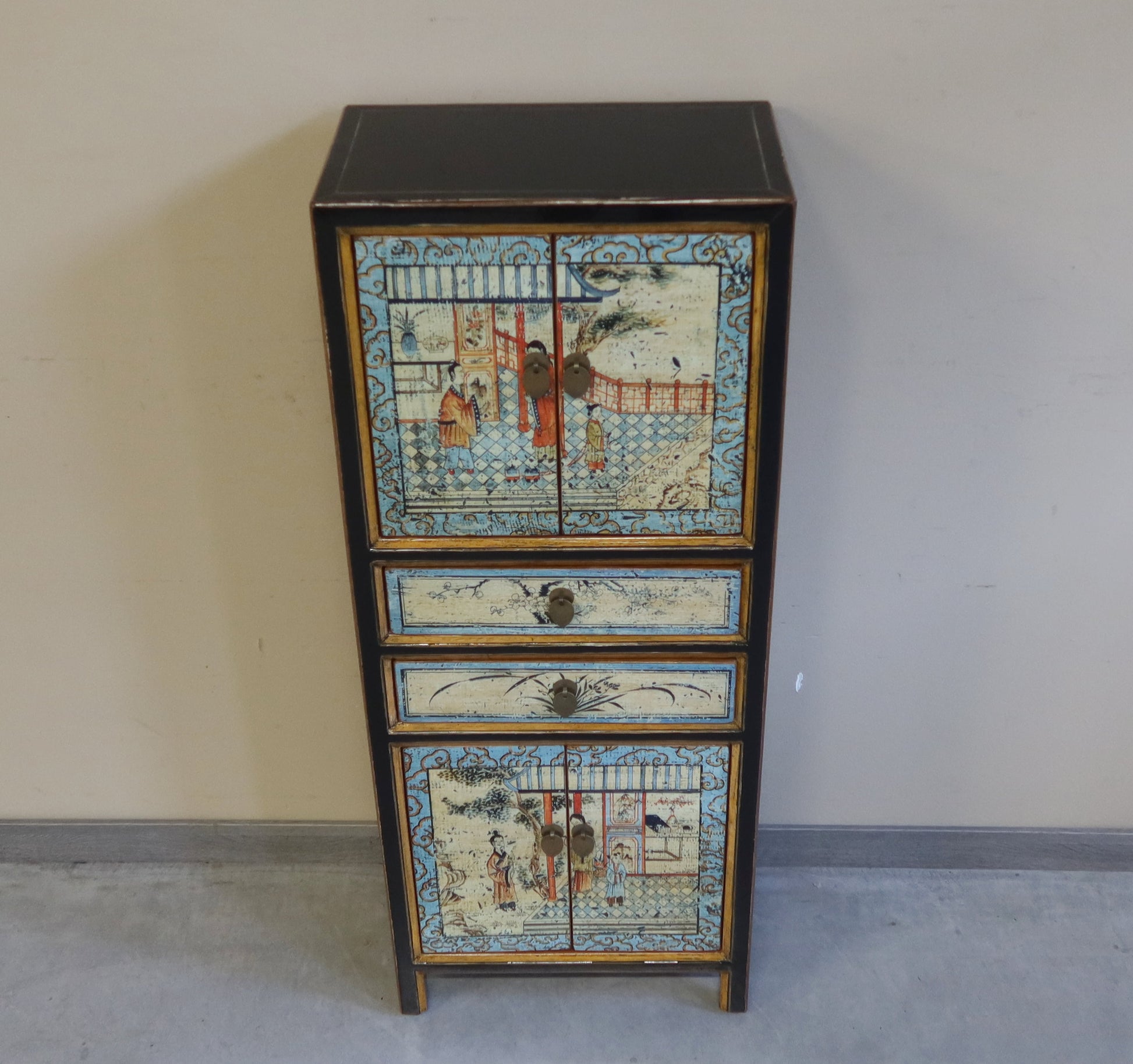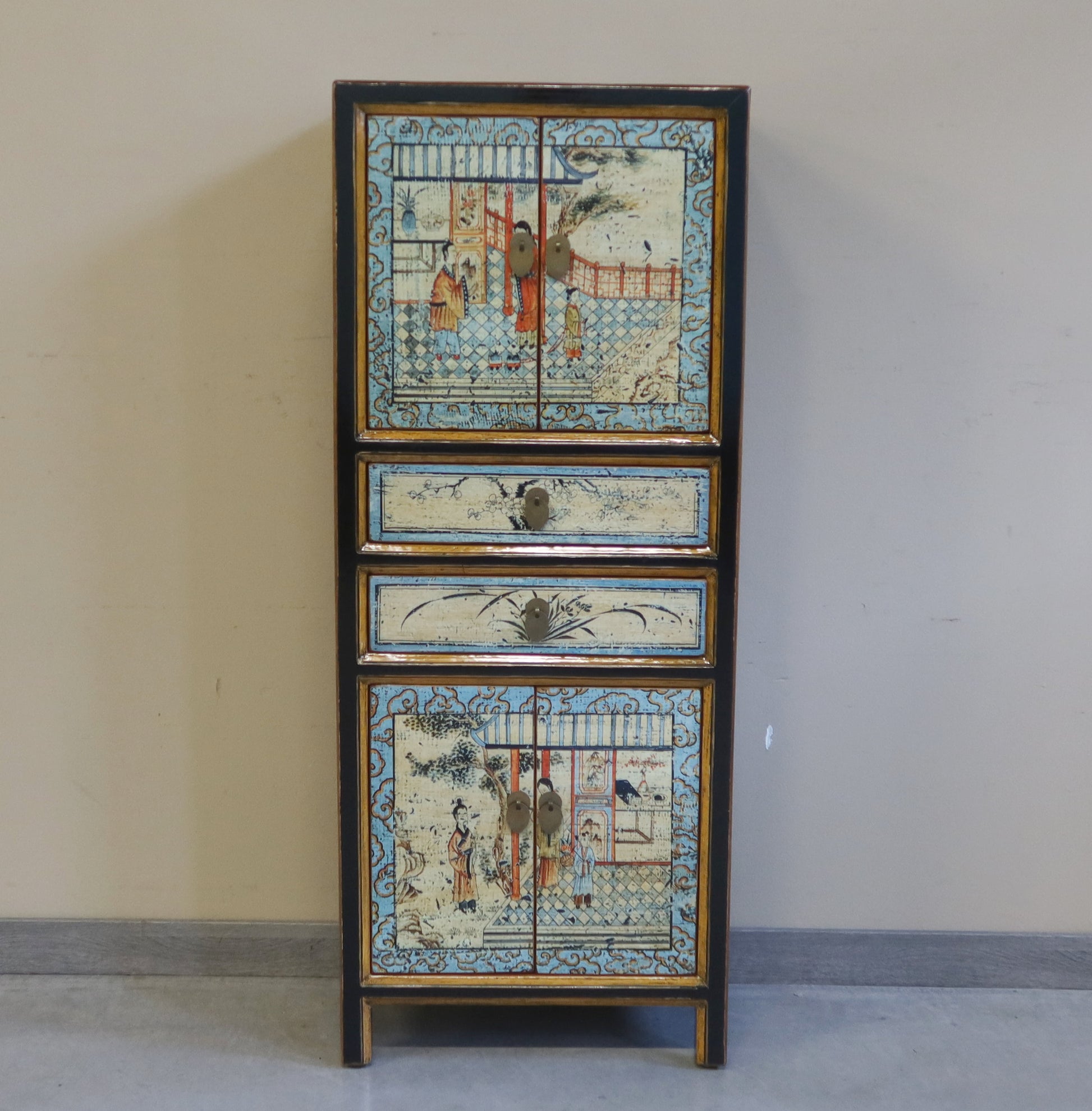 Elegante armadietto stretto cinese a colonna, a doppio vano e doppi cassetti: un graziosissimo mobile adatto sia a contenere sia anche a impreziosire quell'angolino della casa che ha dimensioni troppo ridotte e in cui non possono stare mobili più grandi