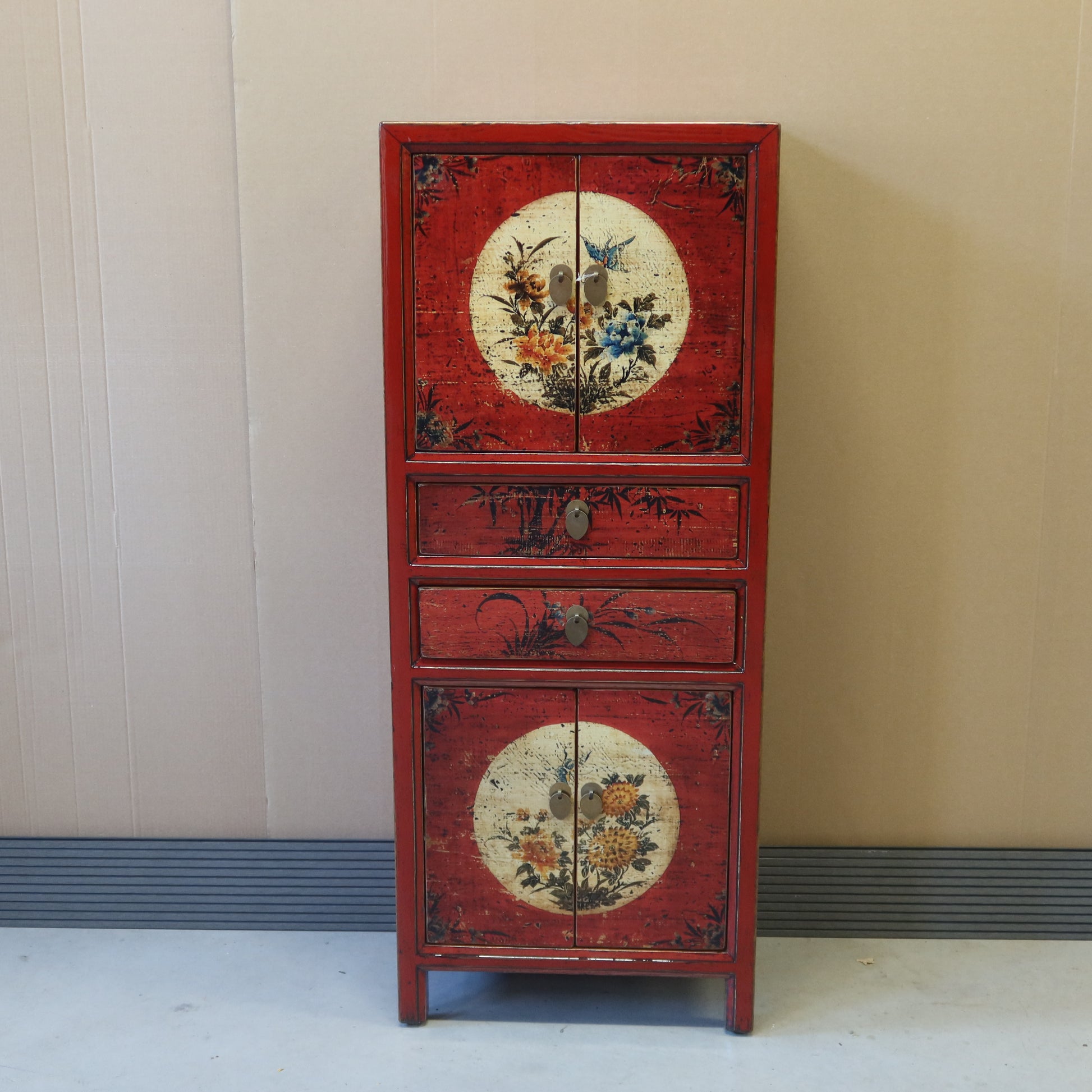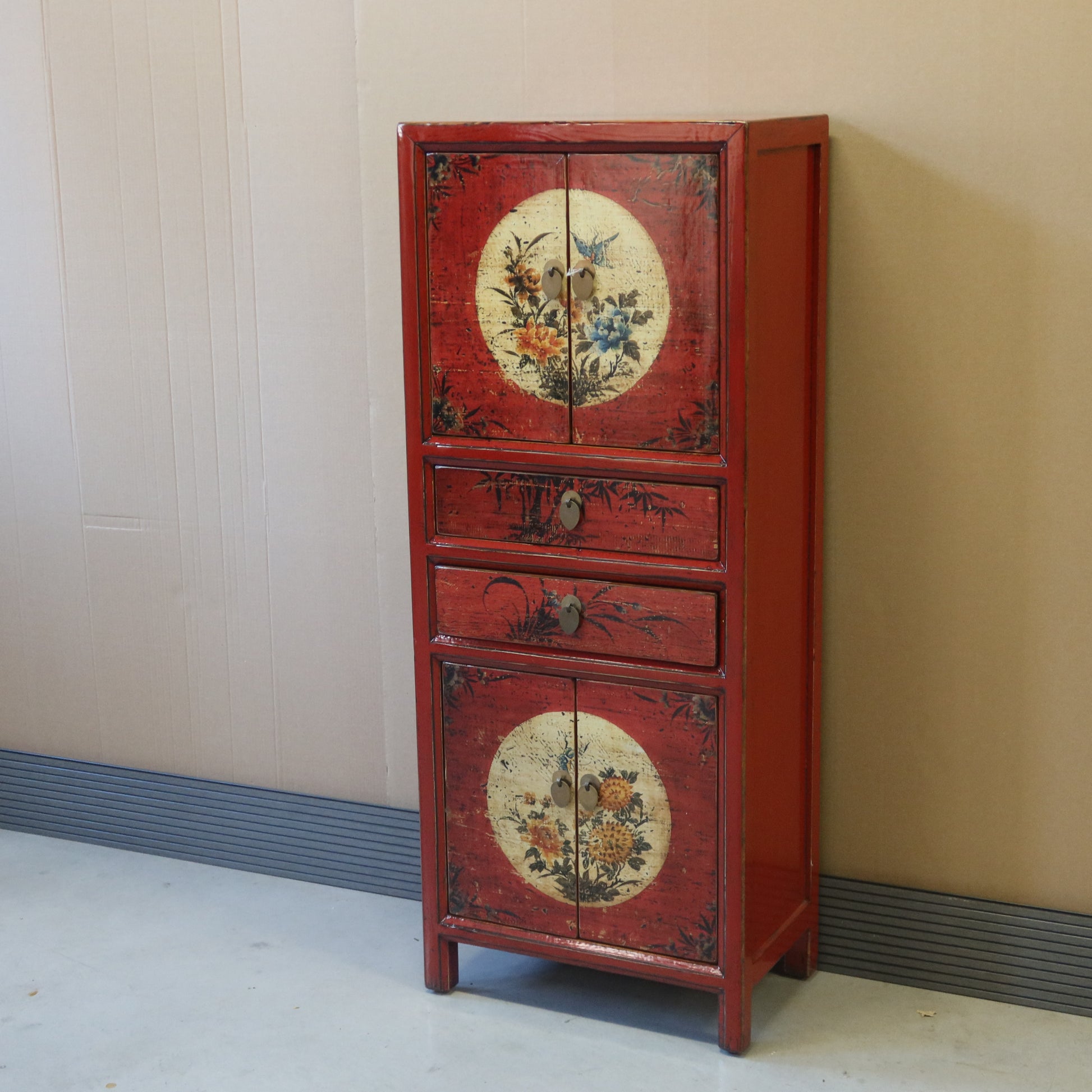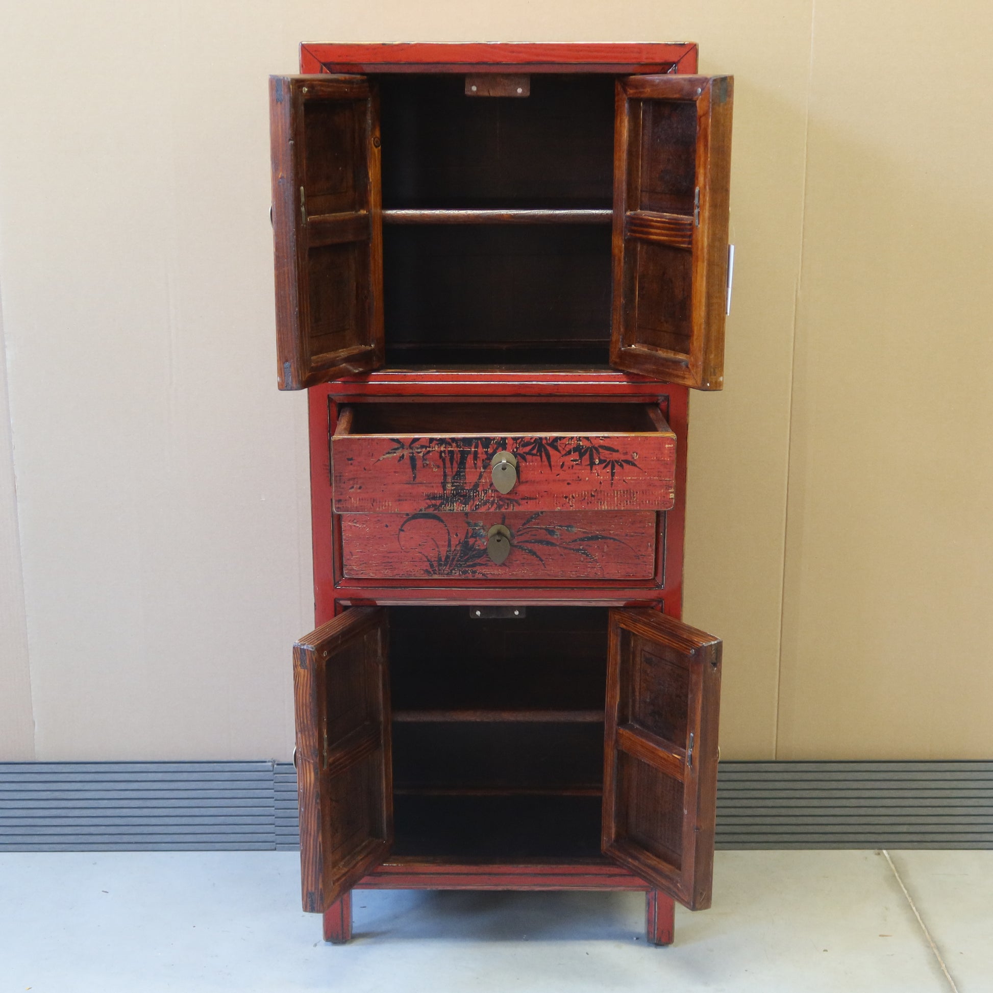 Elegante armadietto stretto cinese a colonna, a doppio vano e doppi cassetti: un graziosissimo mobile adatto sia a contenere sia anche a impreziosire quell'angolino della casa che ha dimensioni troppo ridotte e in cui non possono stare mobili più grandi