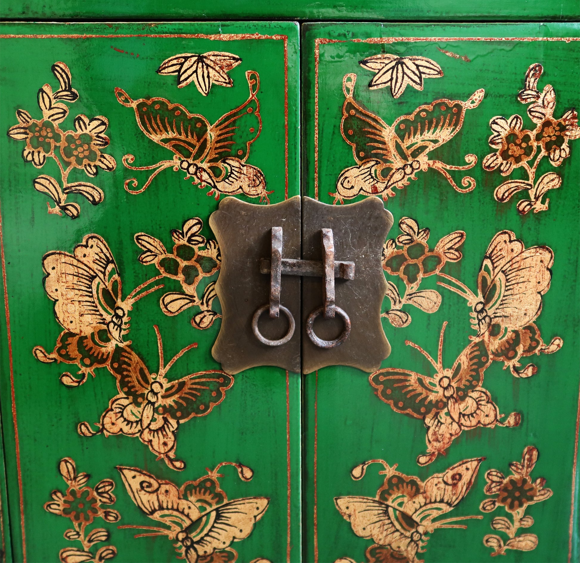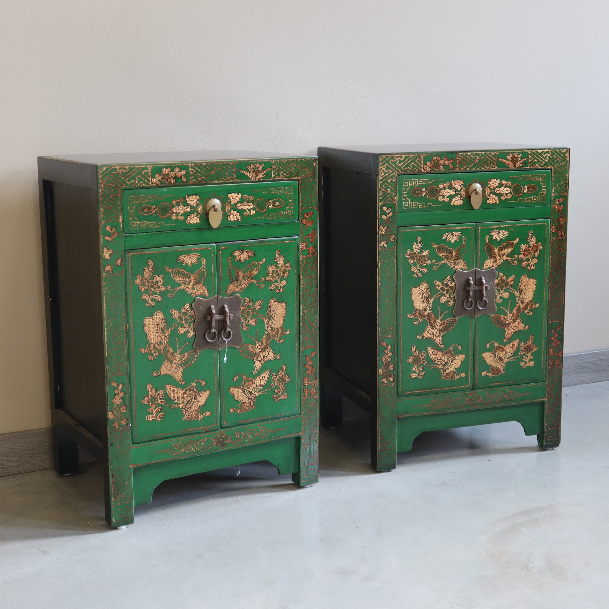 Hanno un gusto estremamente particolare questi comodini in lacca verde decorata provenienti dalla Cina, in particolare dalle regione dello Shanxi. Il decoro in oro è molto ricco. Il prezzo è per singolo oggetto se acquistato in coppia.