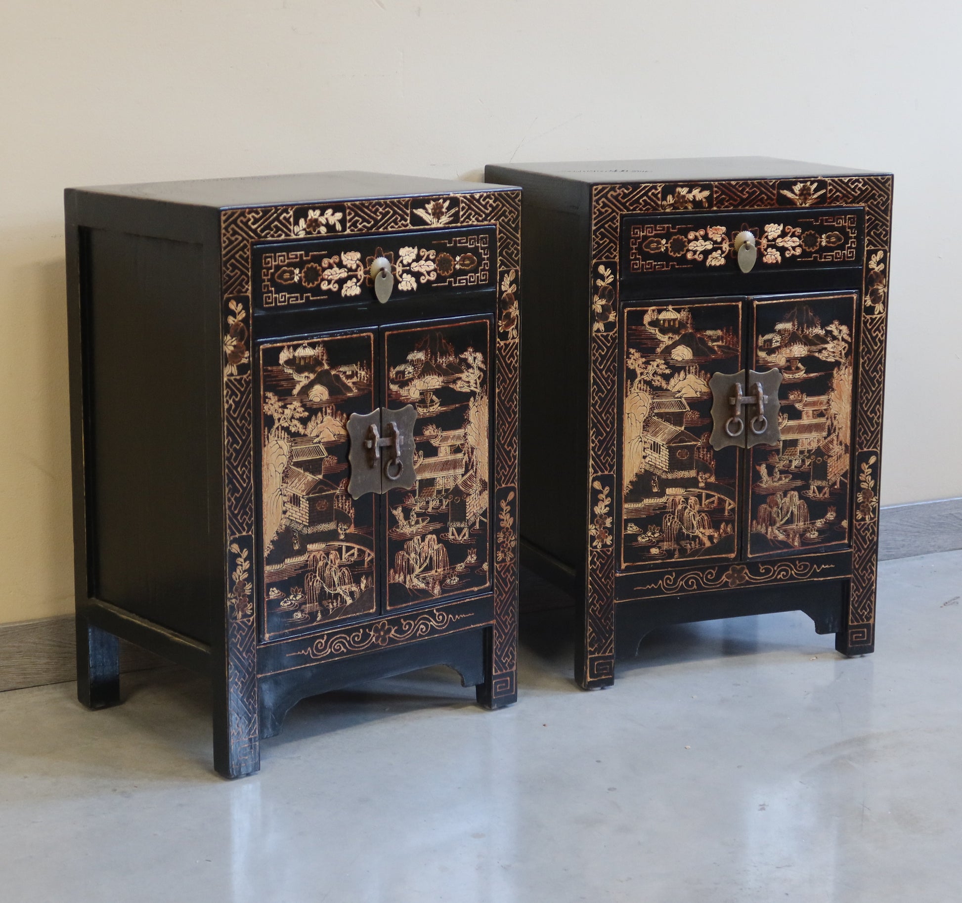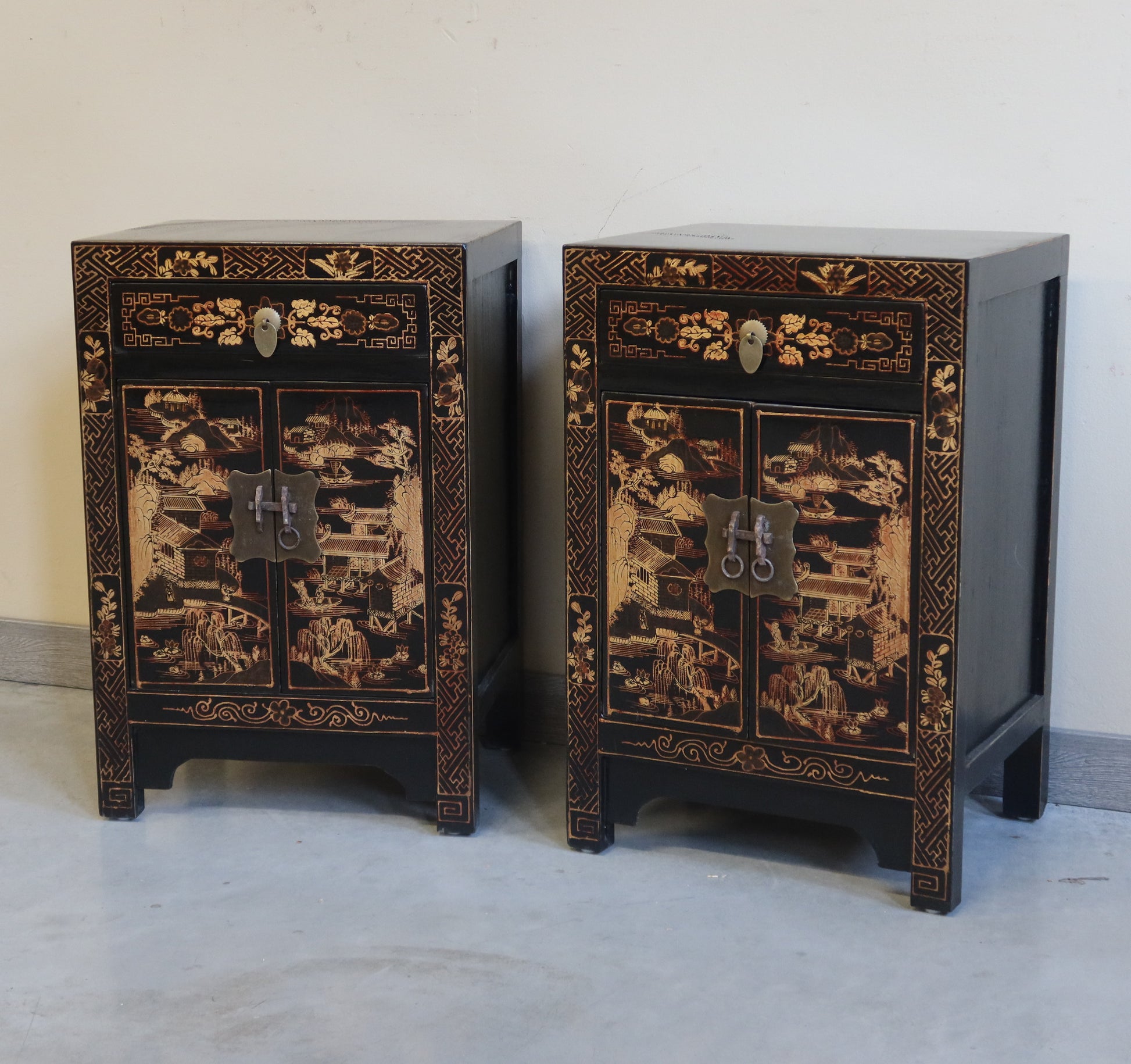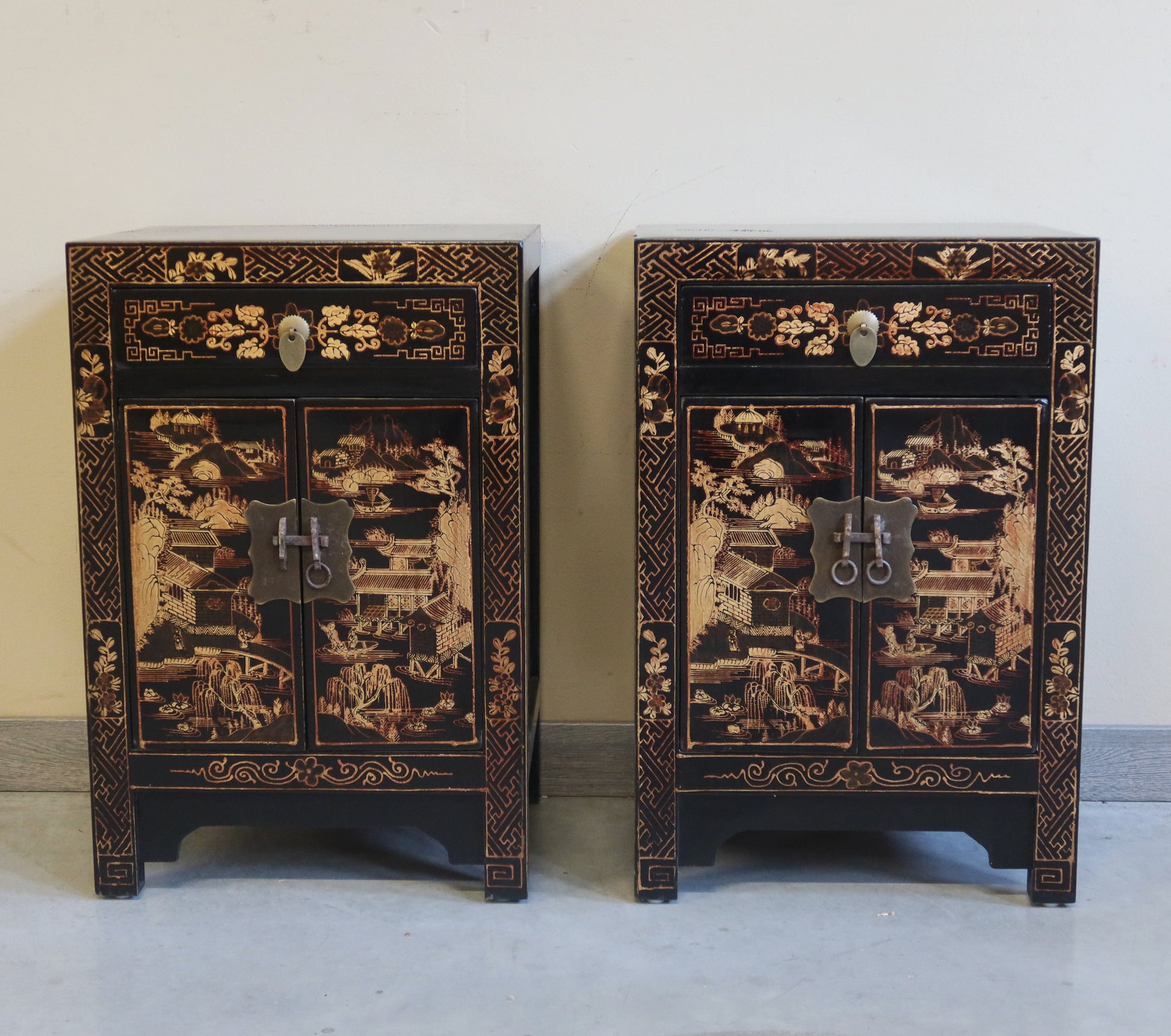 Coppia di comodini in lacca nera con decoro dorato a tema paesaggistico. Si possono acquistare anche singolarmente. Il prezzo è per singolo comodino se si acquista la coppia.