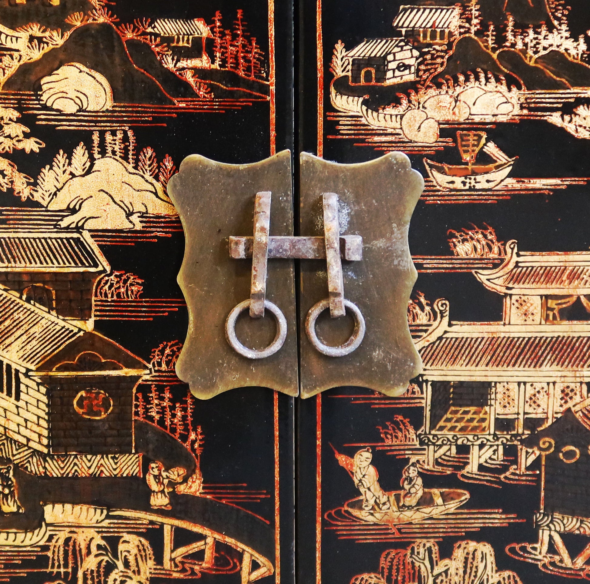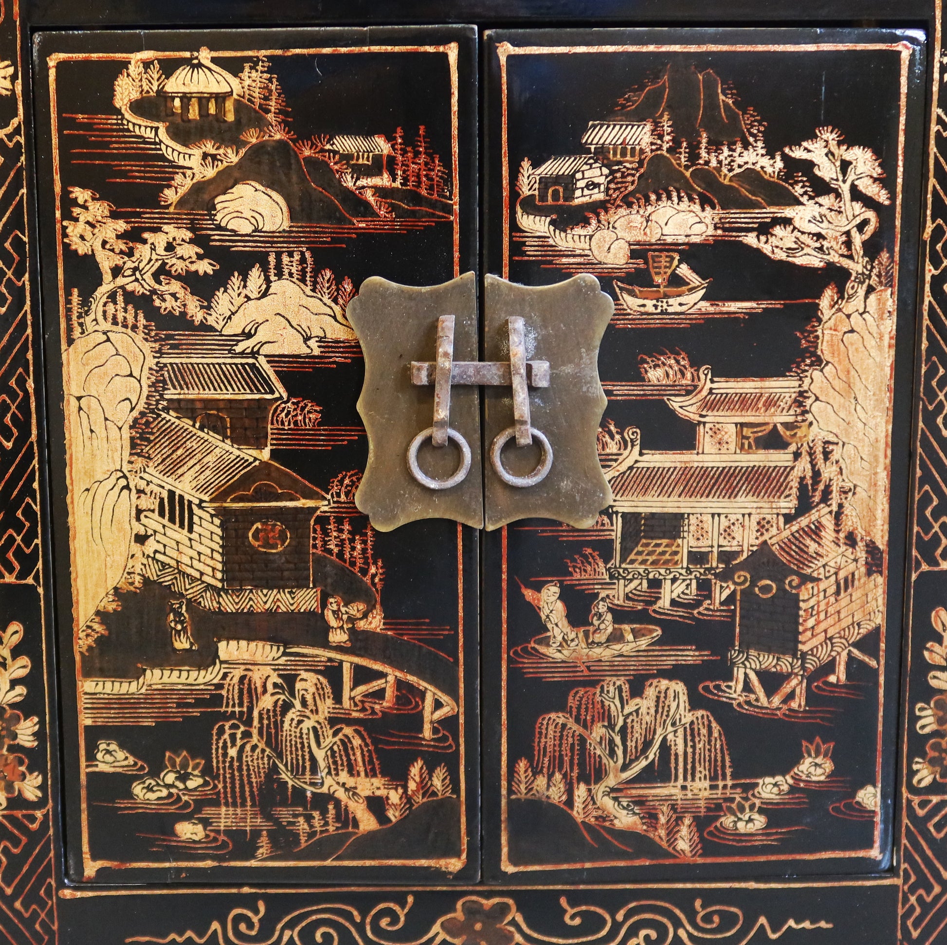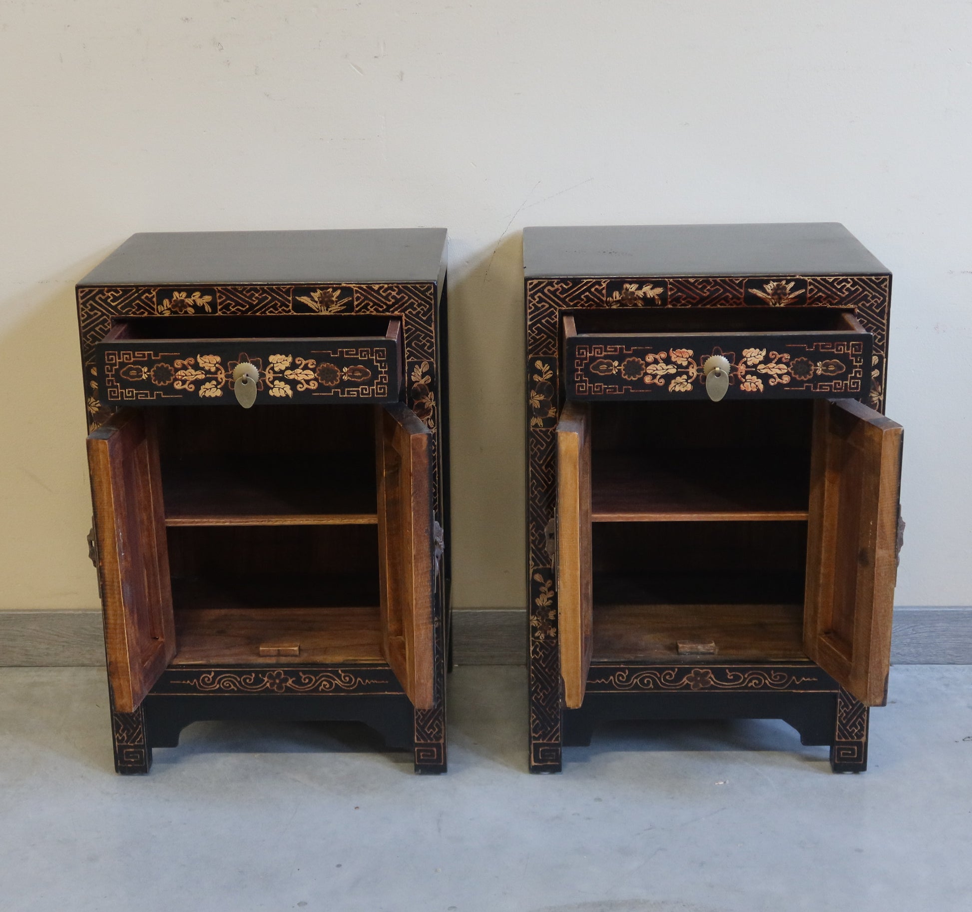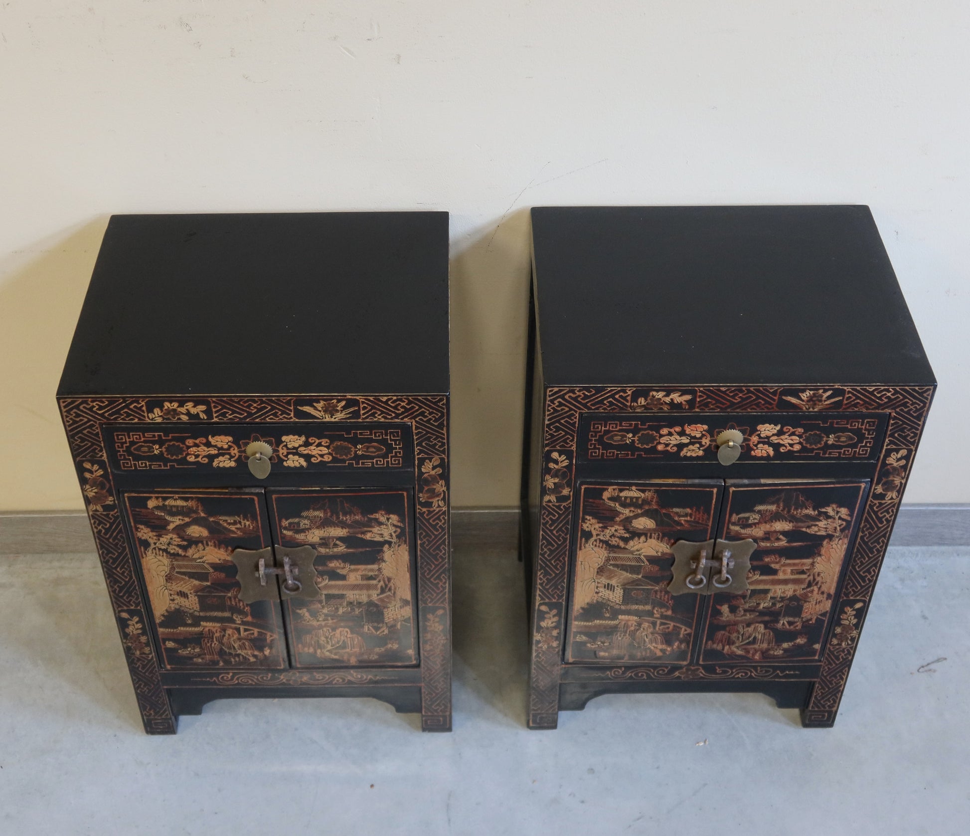 Coppia di comodini in lacca nera con decoro dorato a tema paesaggistico. Si possono acquistare anche singolarmente. Il prezzo è per singolo comodino se si acquista la coppia.