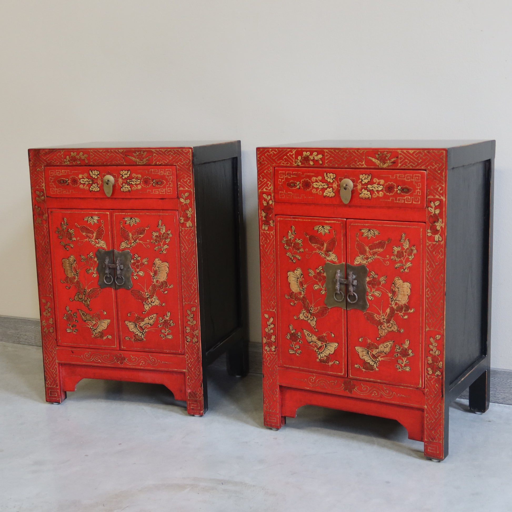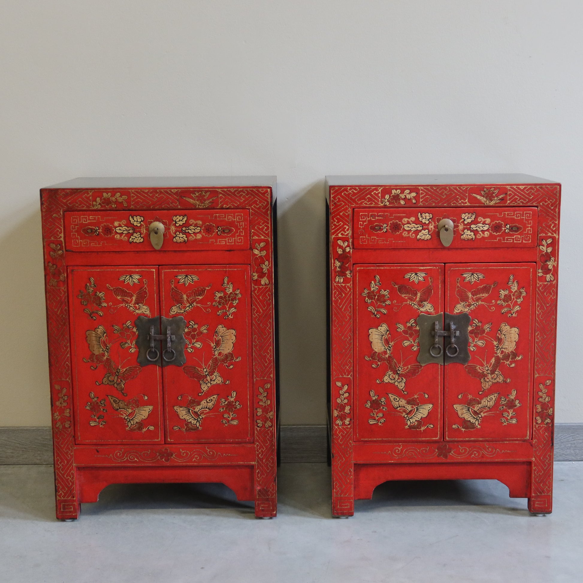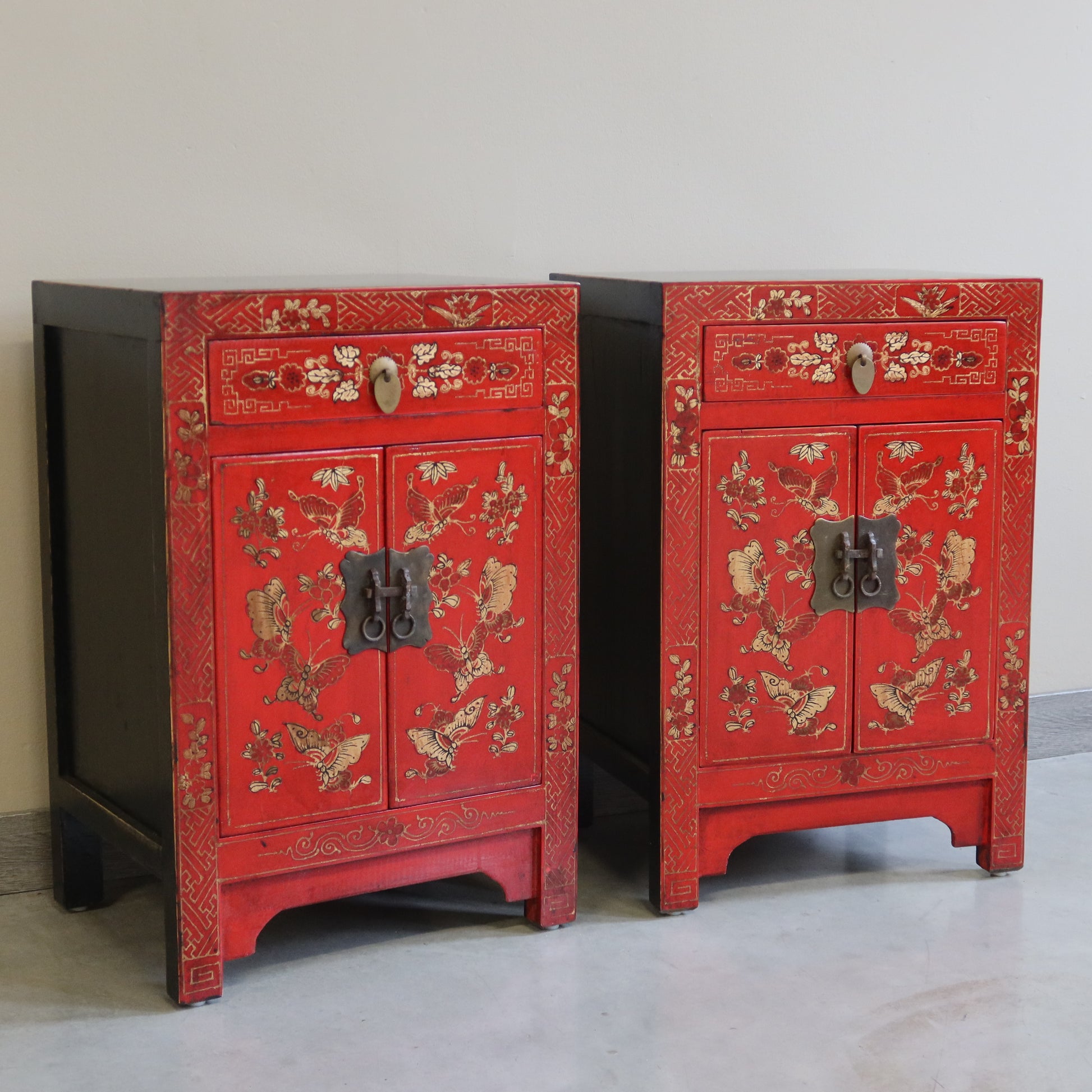 Comodino in lacca rossa con decorazione dorata a tema farfalle. Il prezzo indicato è per singolo comodino