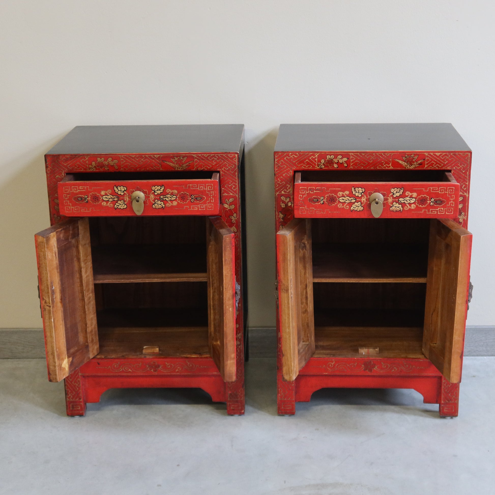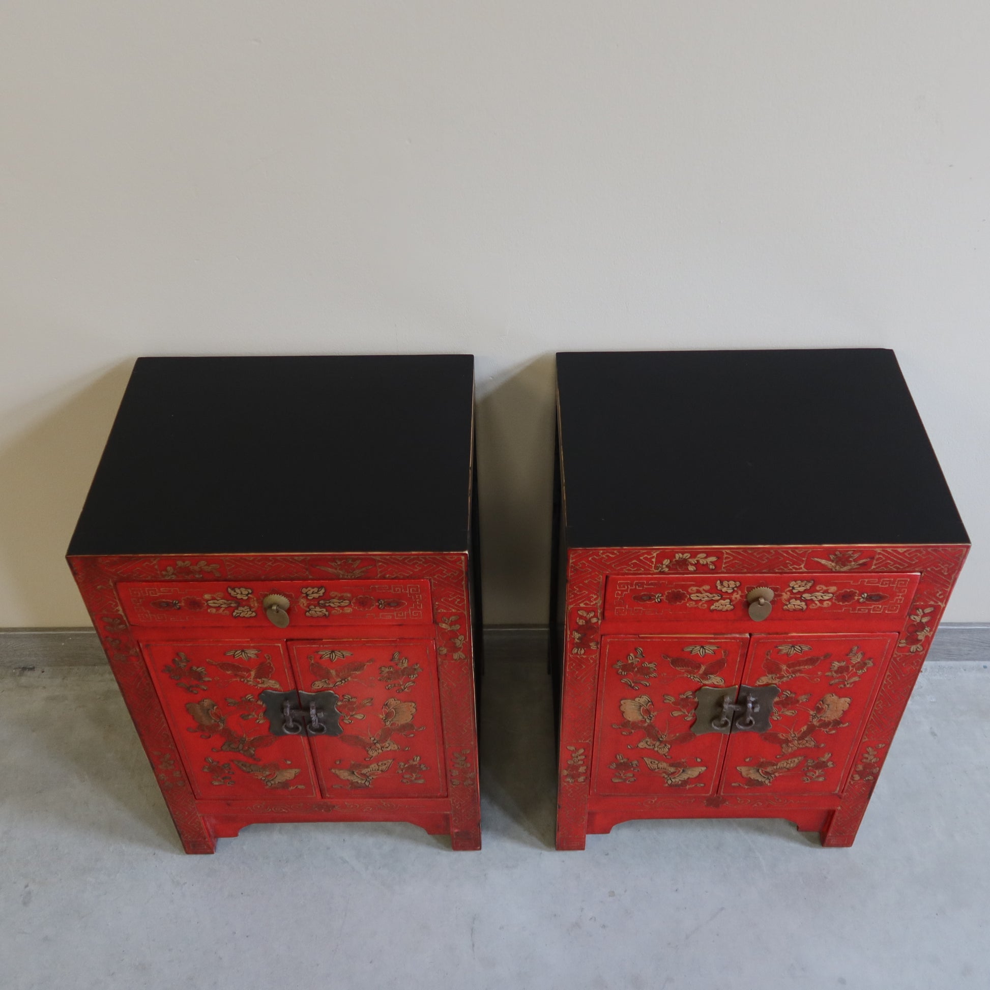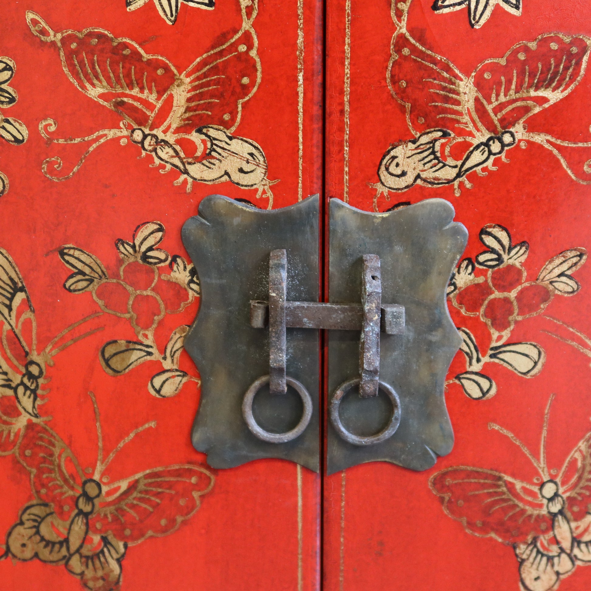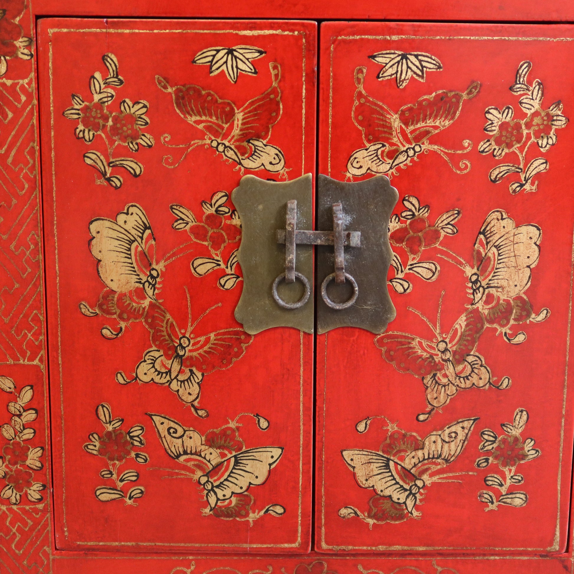 Comodino in lacca rossa con decorazione dorata a tema farfalle. Il prezzo indicato è per singolo comodino