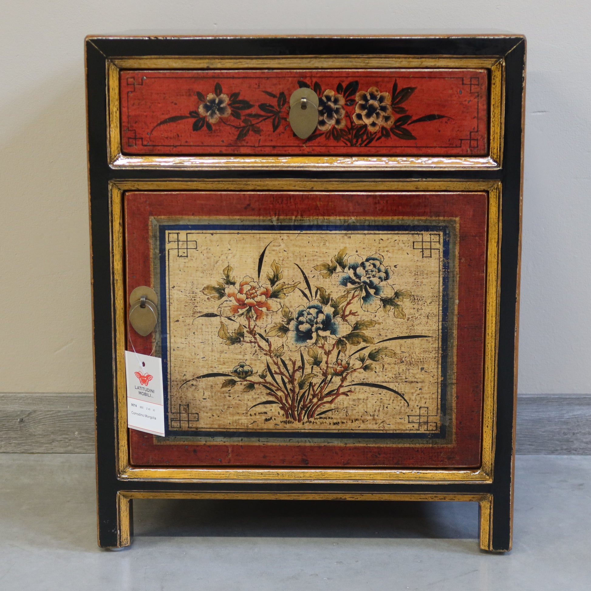 Questo stipetto mongolo, che può fungere anche da comodino, ha un vivace tema decorativo. E' dunque un intrigante complemento d'arredo con il caratteristico sapore etnico della struttura in massello e degli elementi di decoro.