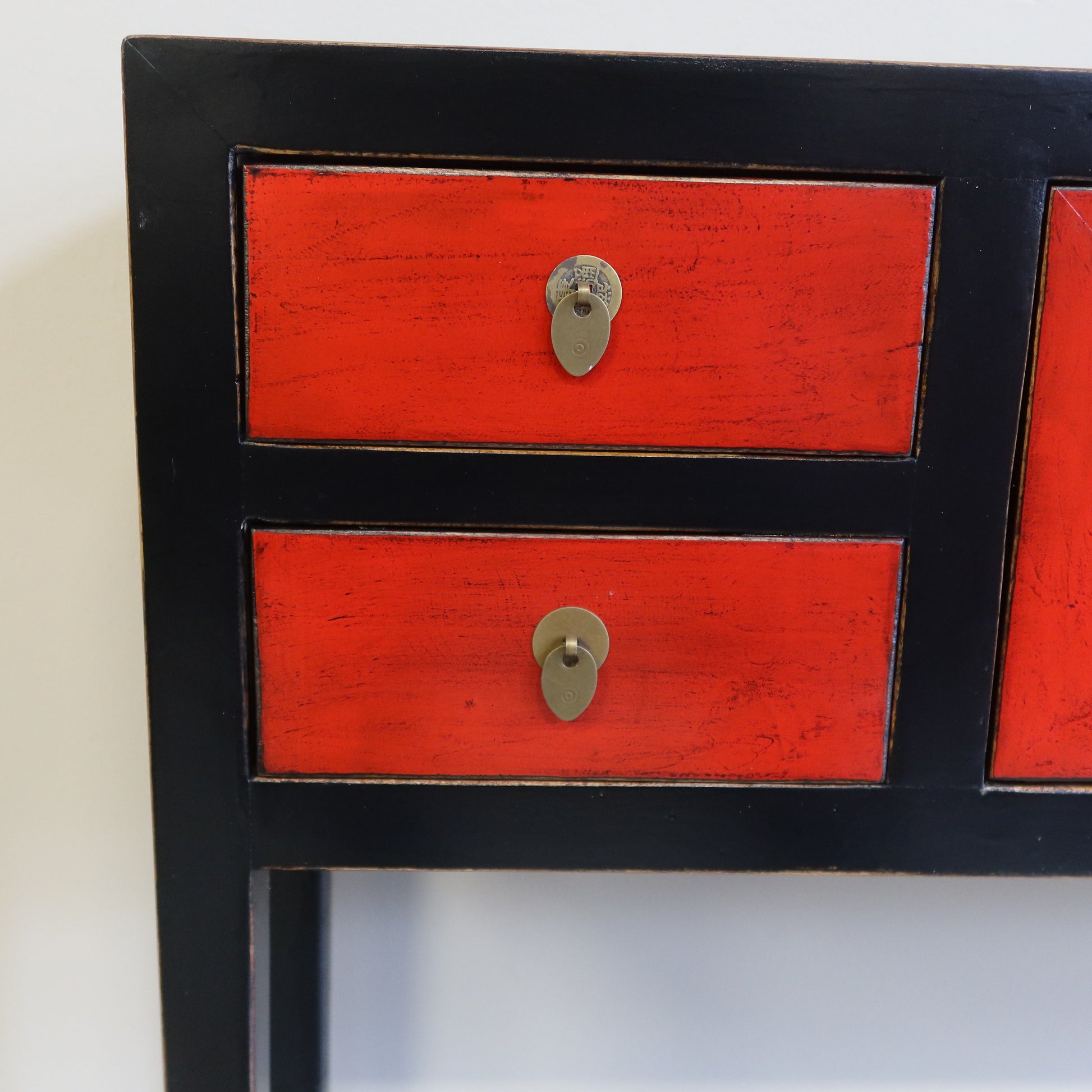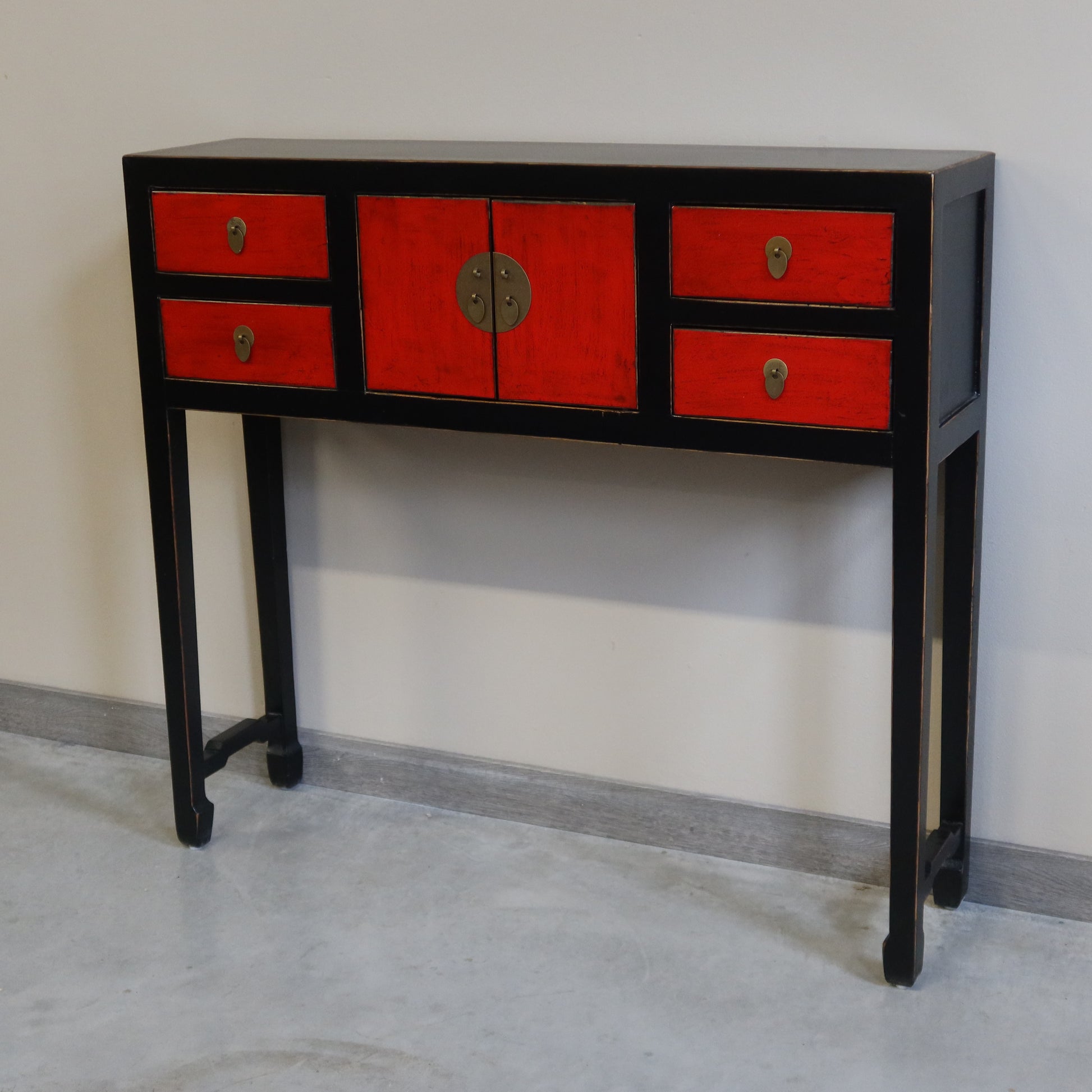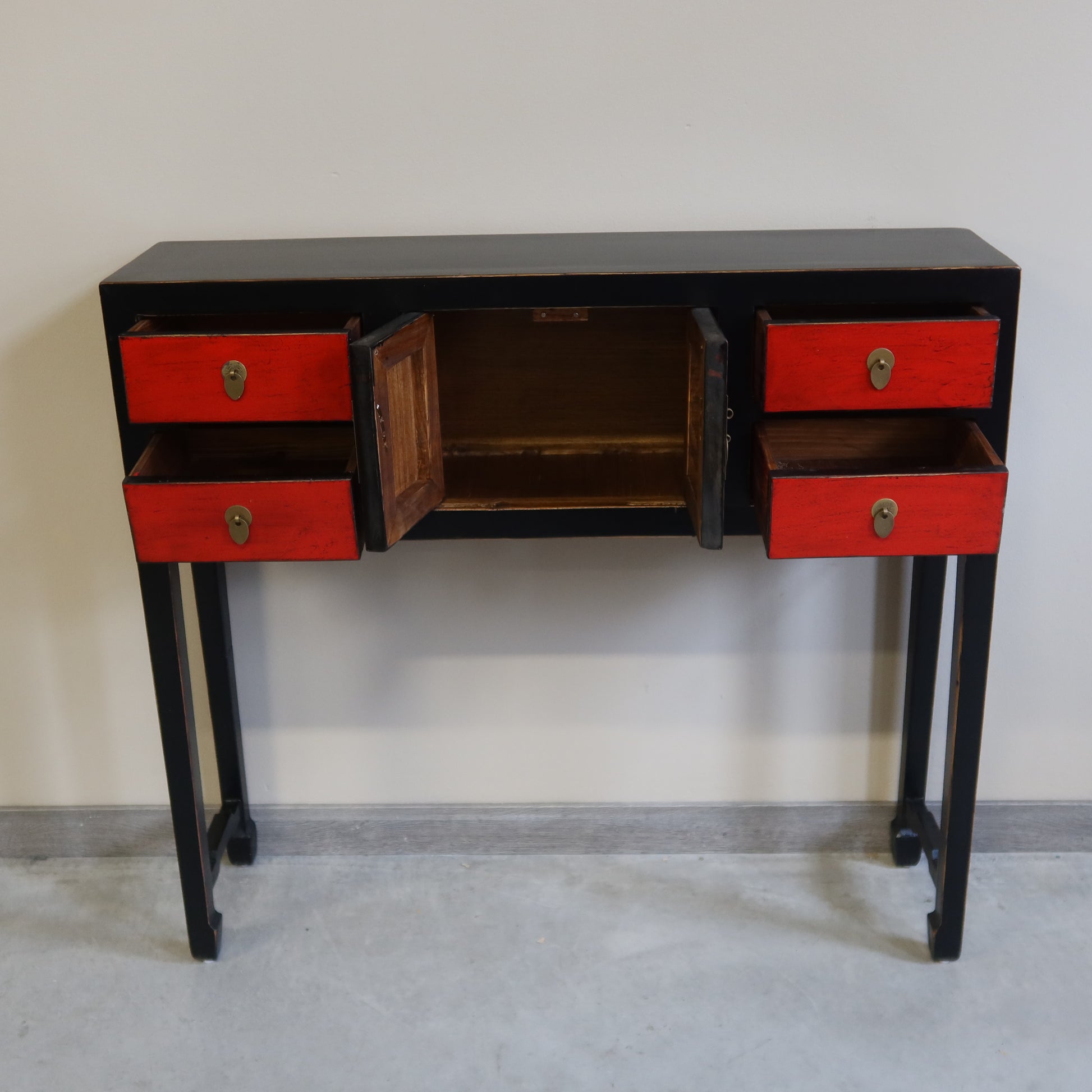 Questa rigorosa consolle in lacca ha un'organizzazione speculare con due ante e quattro cassettini: è un complemento d'arredo etnico elegante, ma anche un mobiletto funzionale e sufficientemente contenitivo.