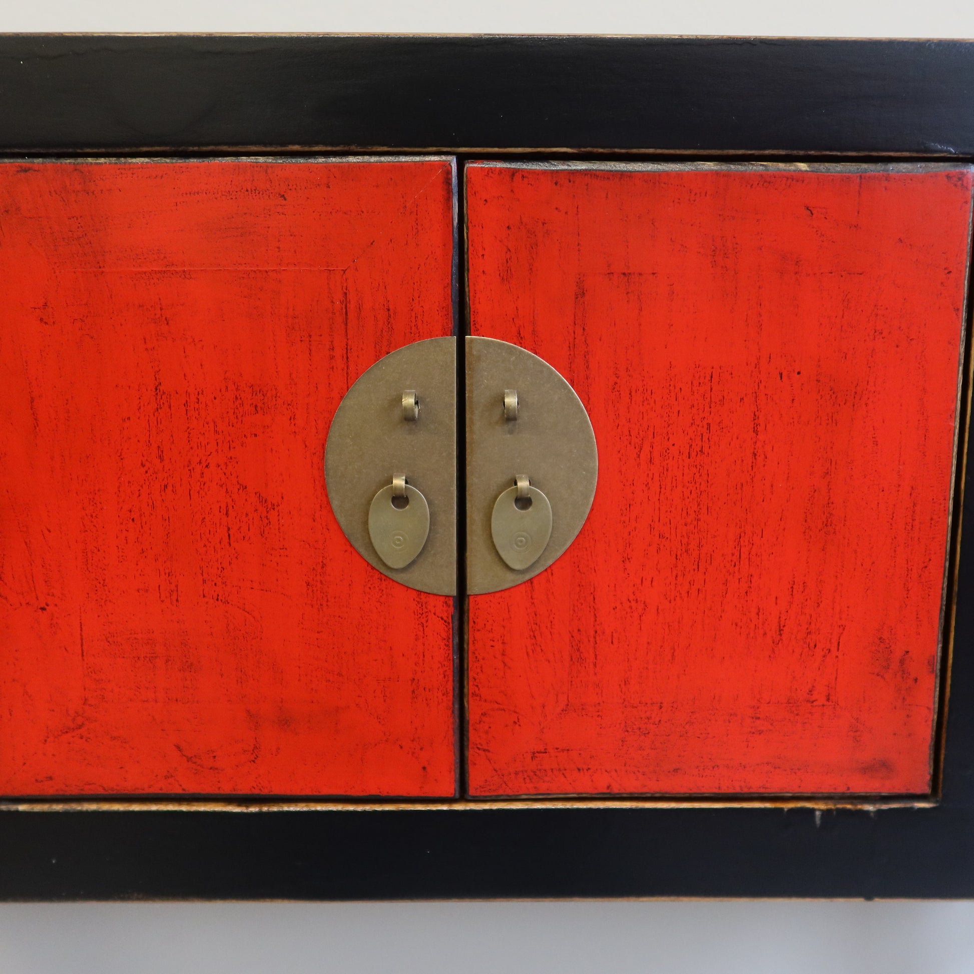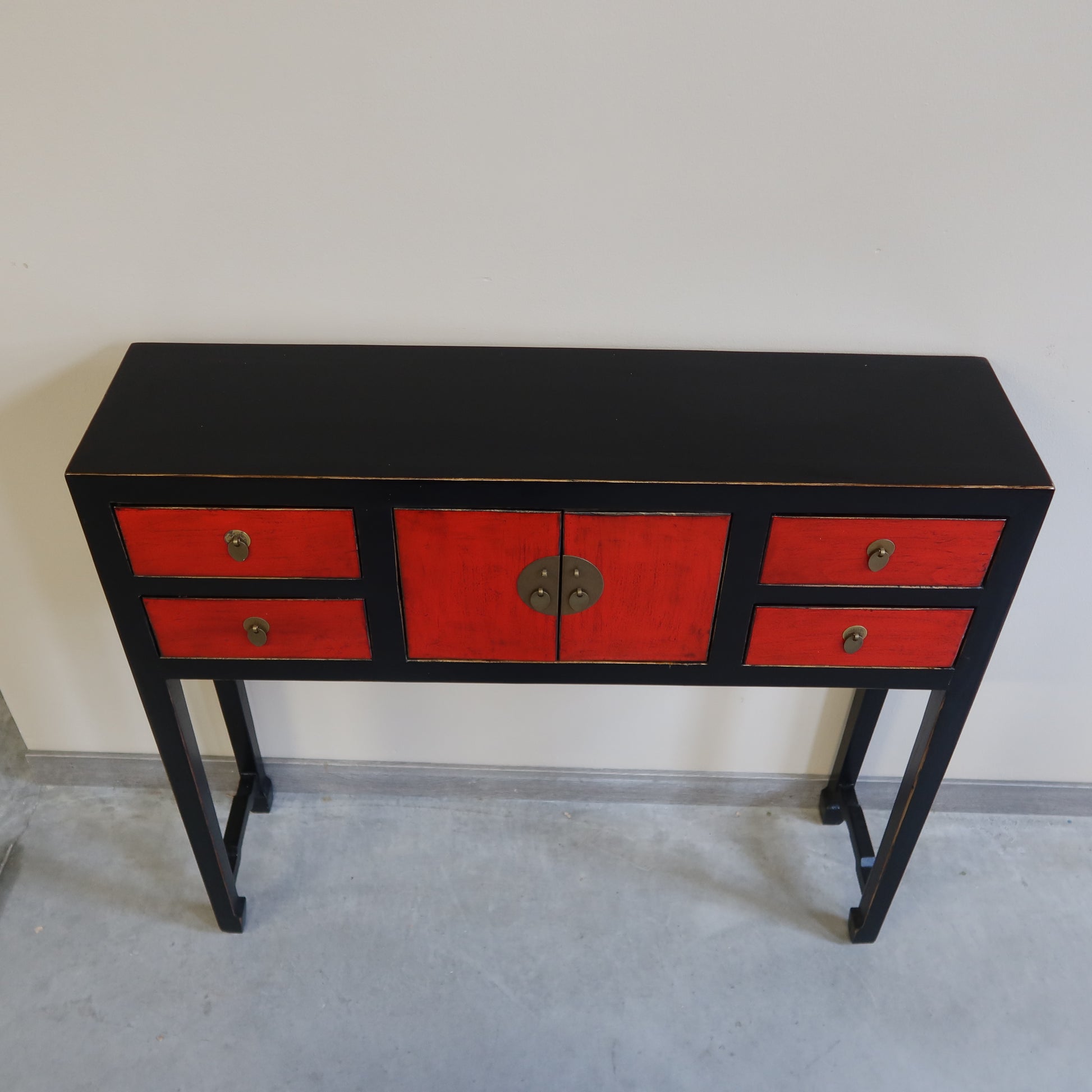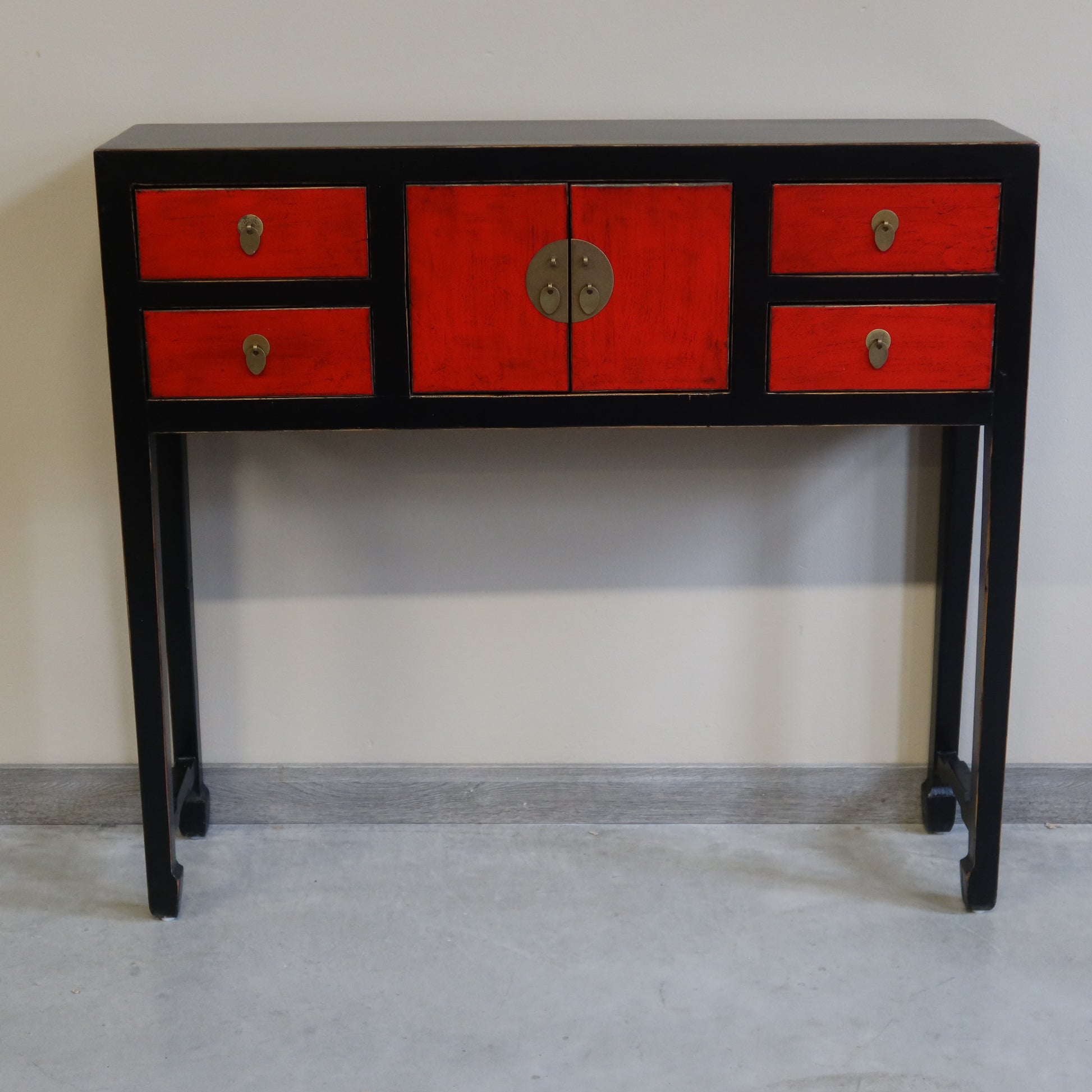 Questa rigorosa consolle in lacca ha un'organizzazione speculare con due ante e quattro cassettini: è un complemento d'arredo etnico elegante, ma anche un mobiletto funzionale e sufficientemente contenitivo.