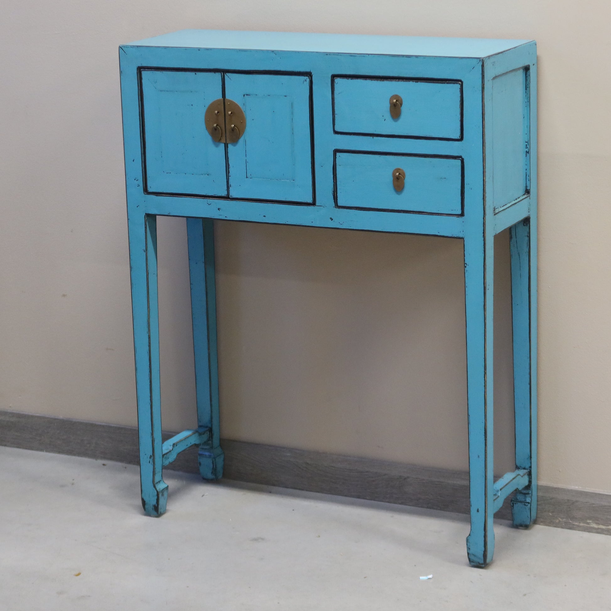 Consolle cinese in lacca celeste monocromatica, asimmetrica, con due antine chiuse da caratteristiche metalleria e pratici cassettini. Un mobile etnico di dimensioni contenute per impreziosire un angolino della tua casa.
