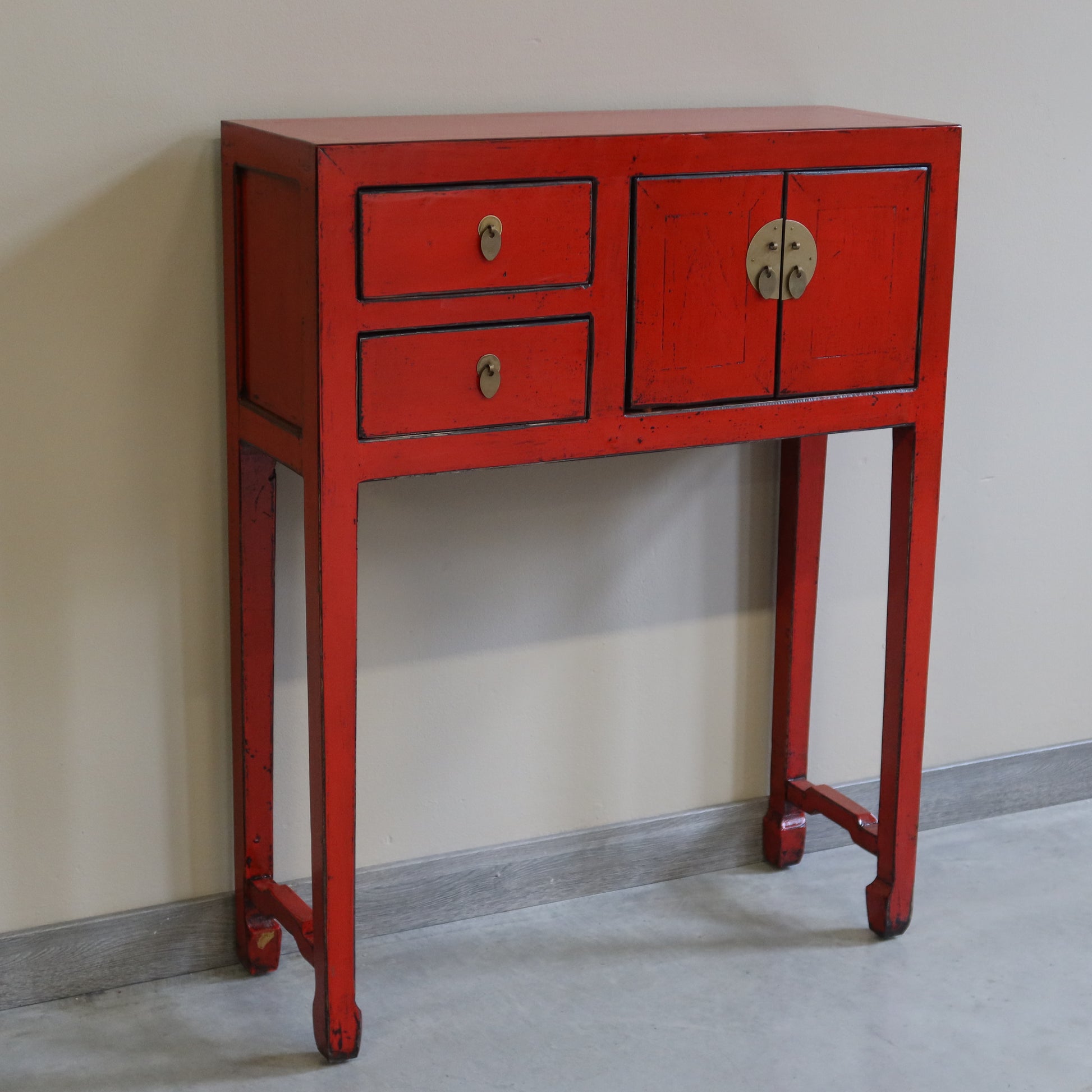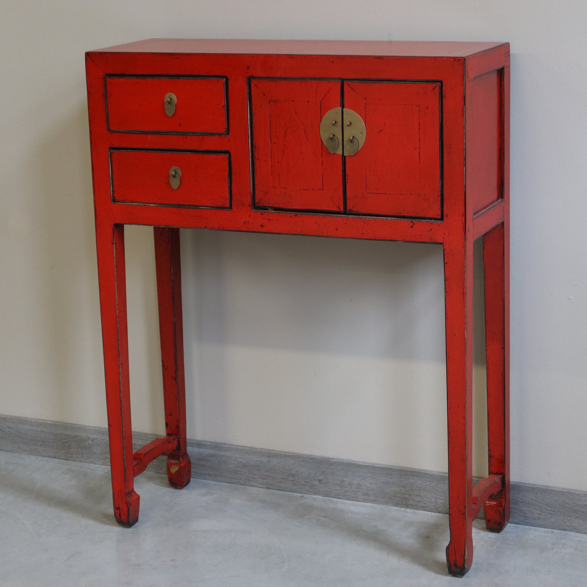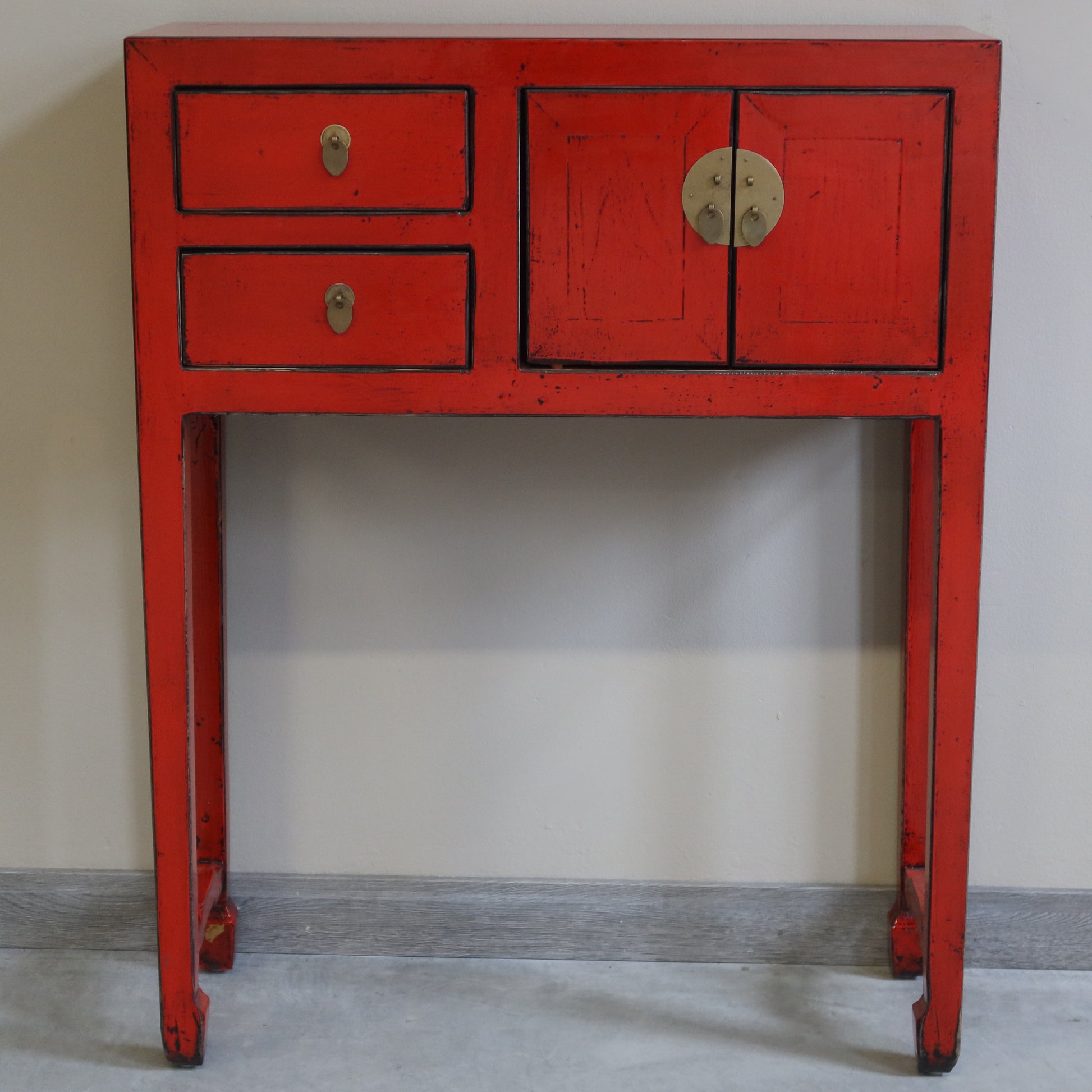 Consolle cinese in lacca rossa monocromatica, asimmetrica, con due antine chiuse da caratteristiche metalleria e pratici cassettini. Un mobile etnico di dimensioni contenute per impreziosire un angolino della tua casa.