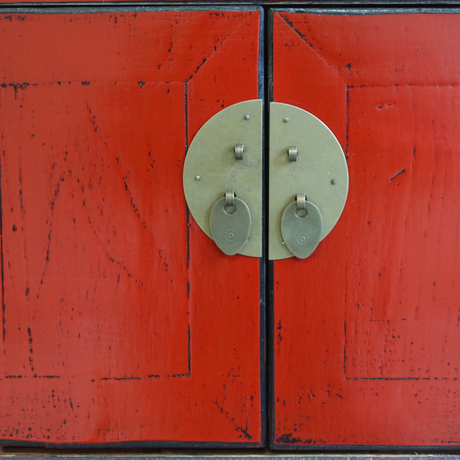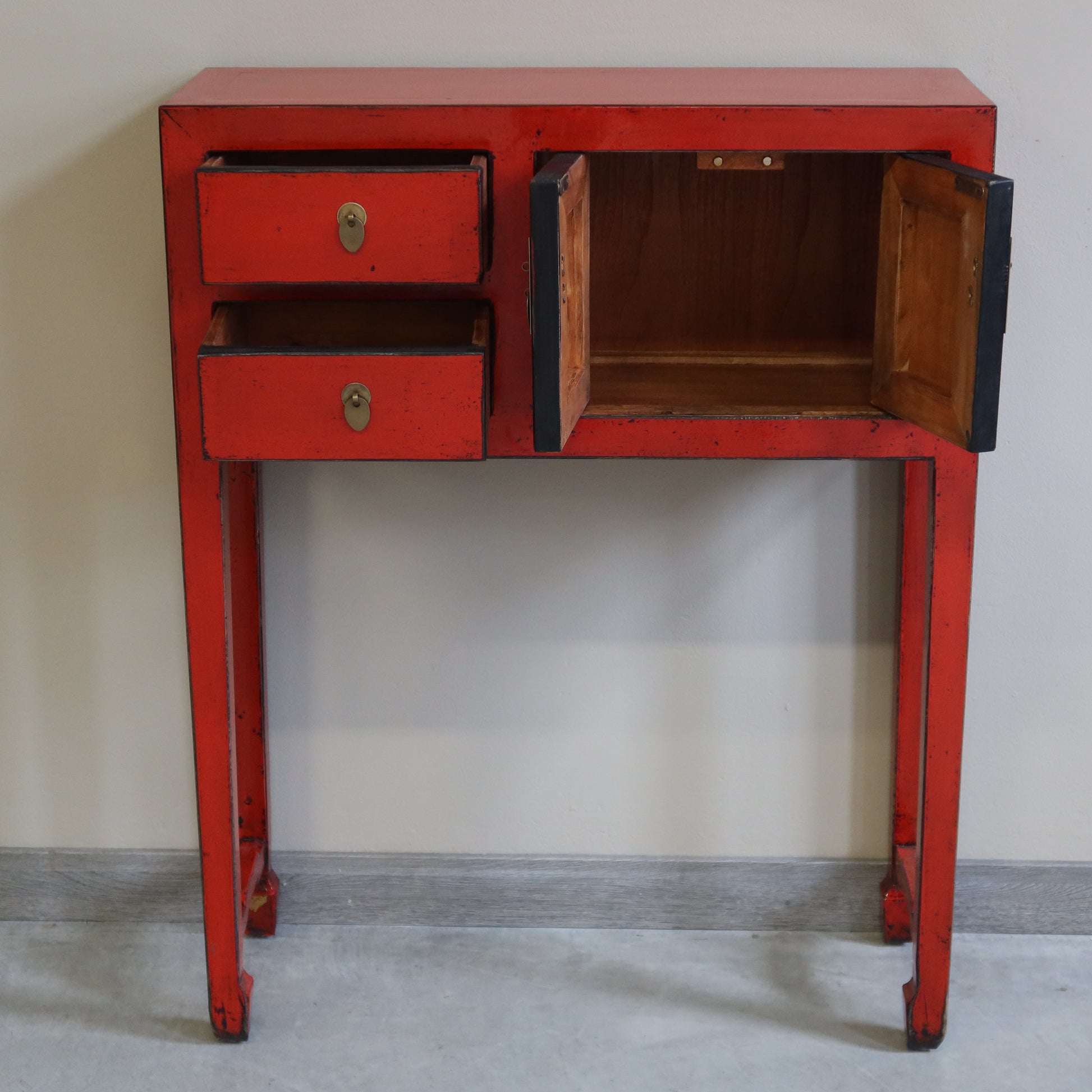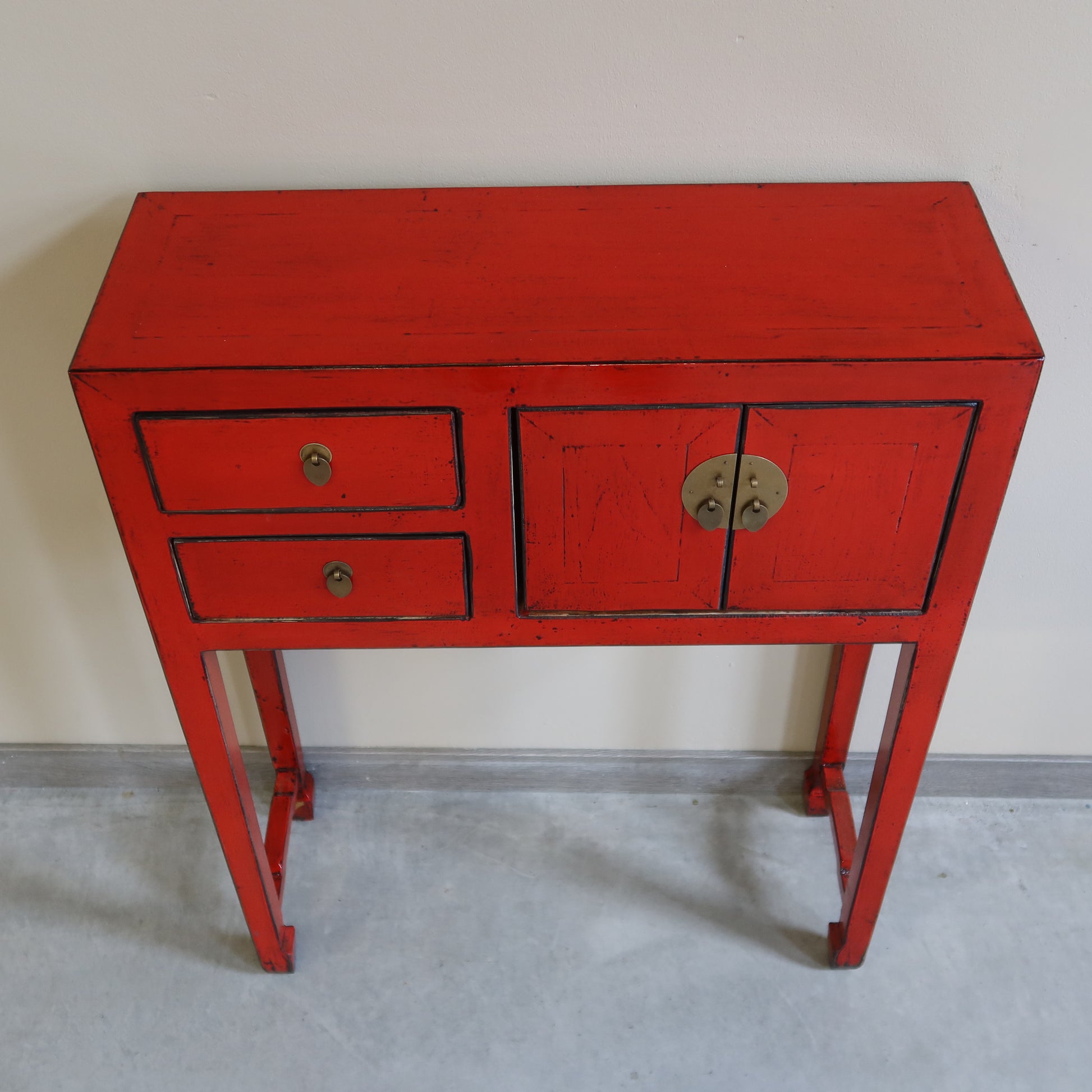 Consolle cinese in lacca rossa monocromatica, asimmetrica, con due antine chiuse da caratteristiche metalleria e pratici cassettini. Un mobile etnico di dimensioni contenute per impreziosire un angolino della tua casa.