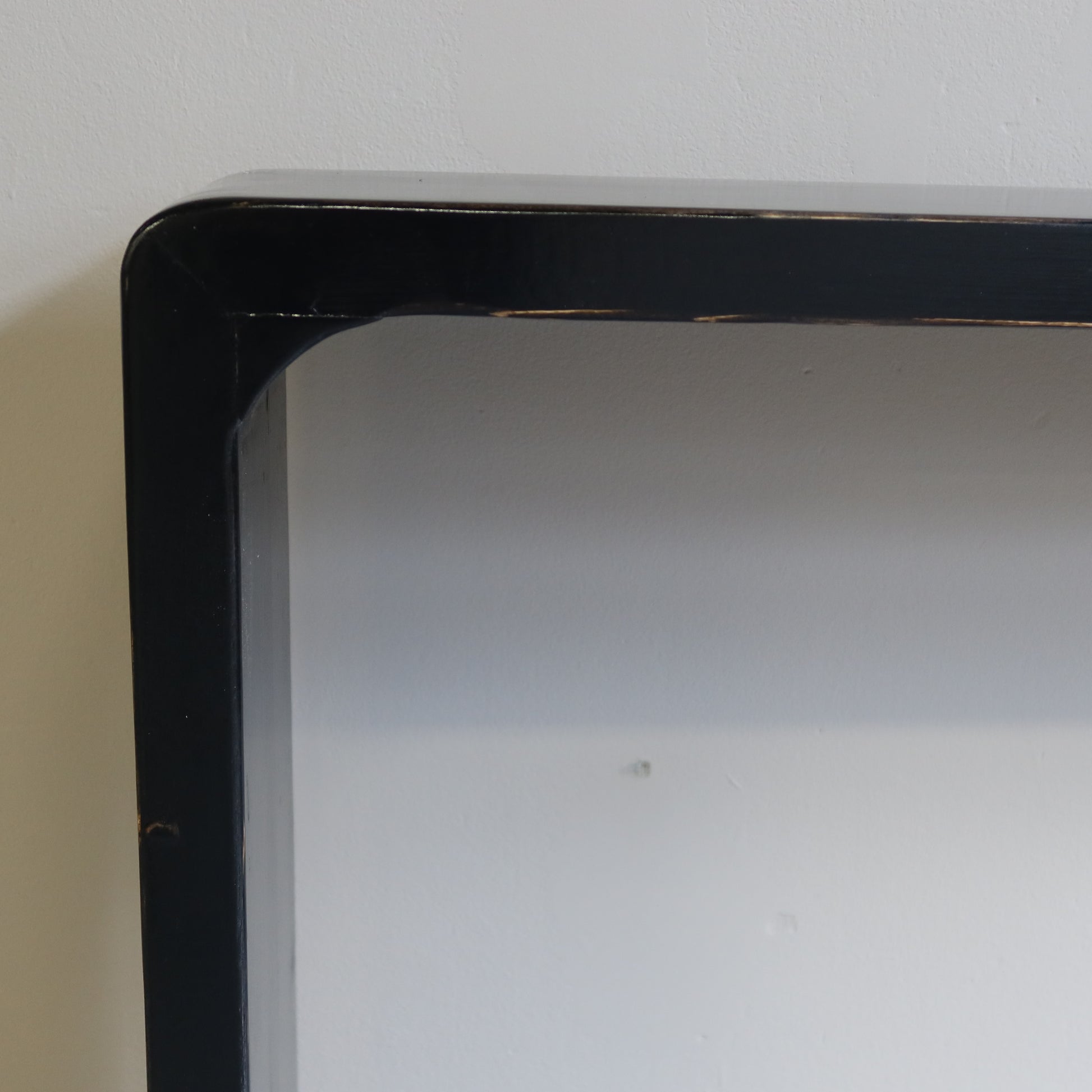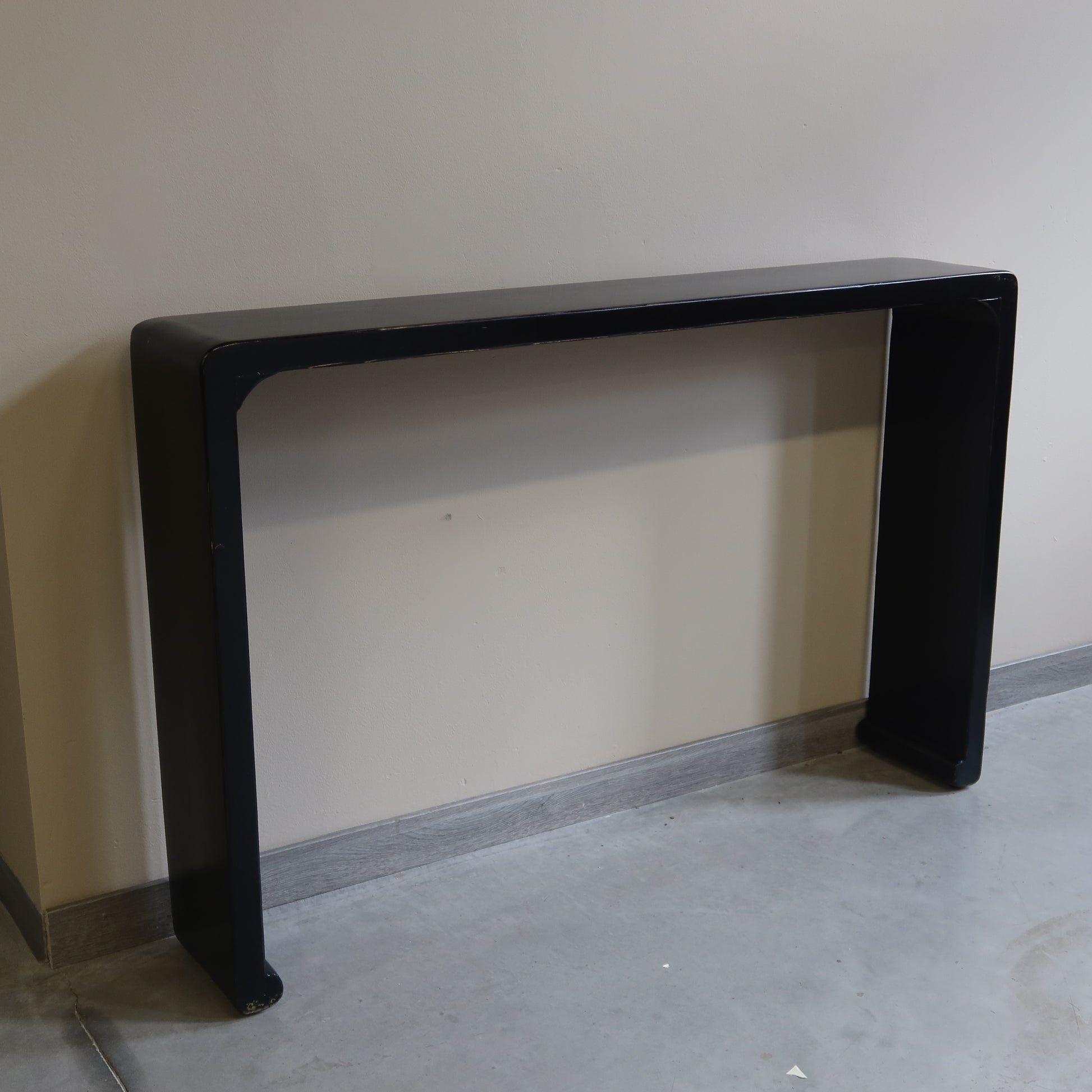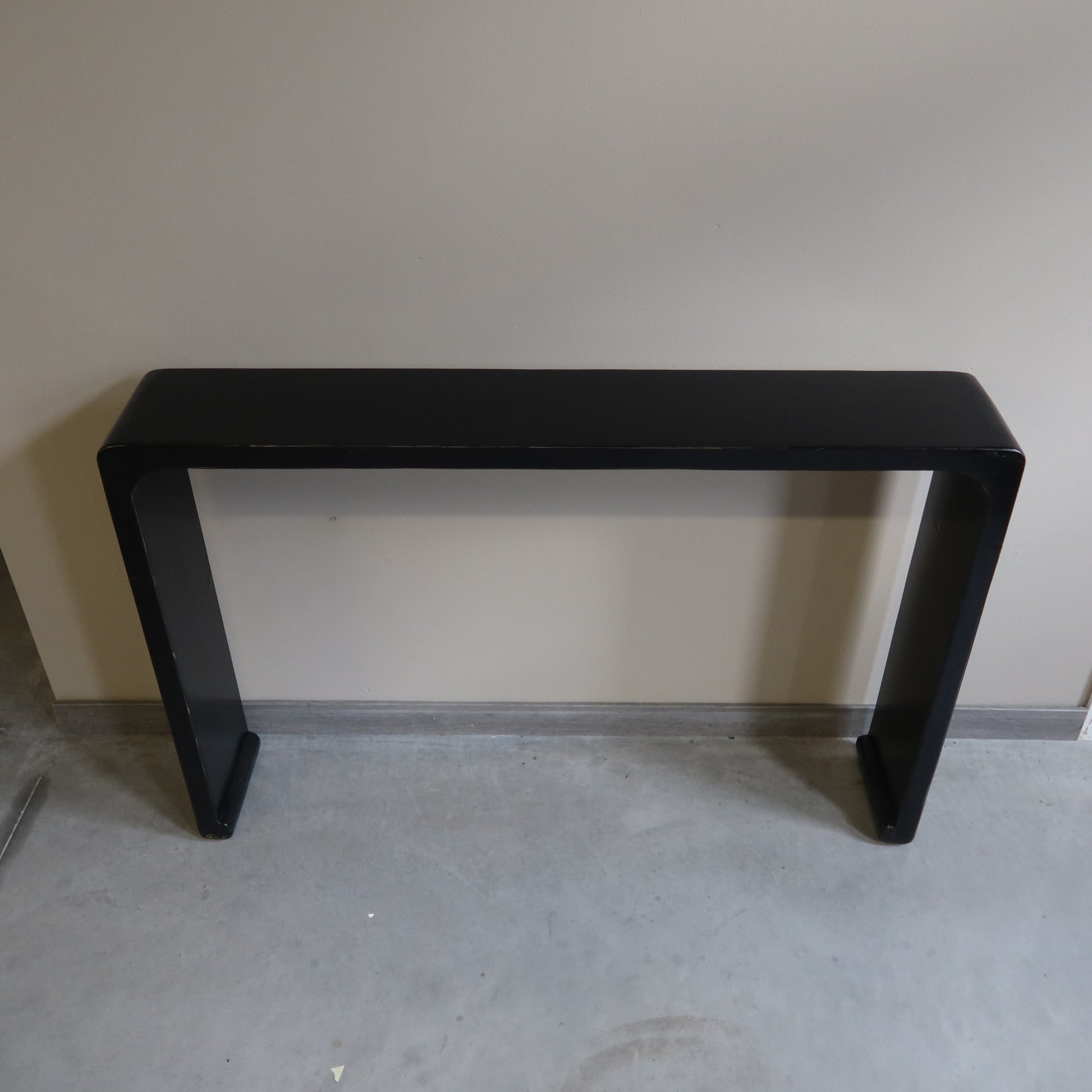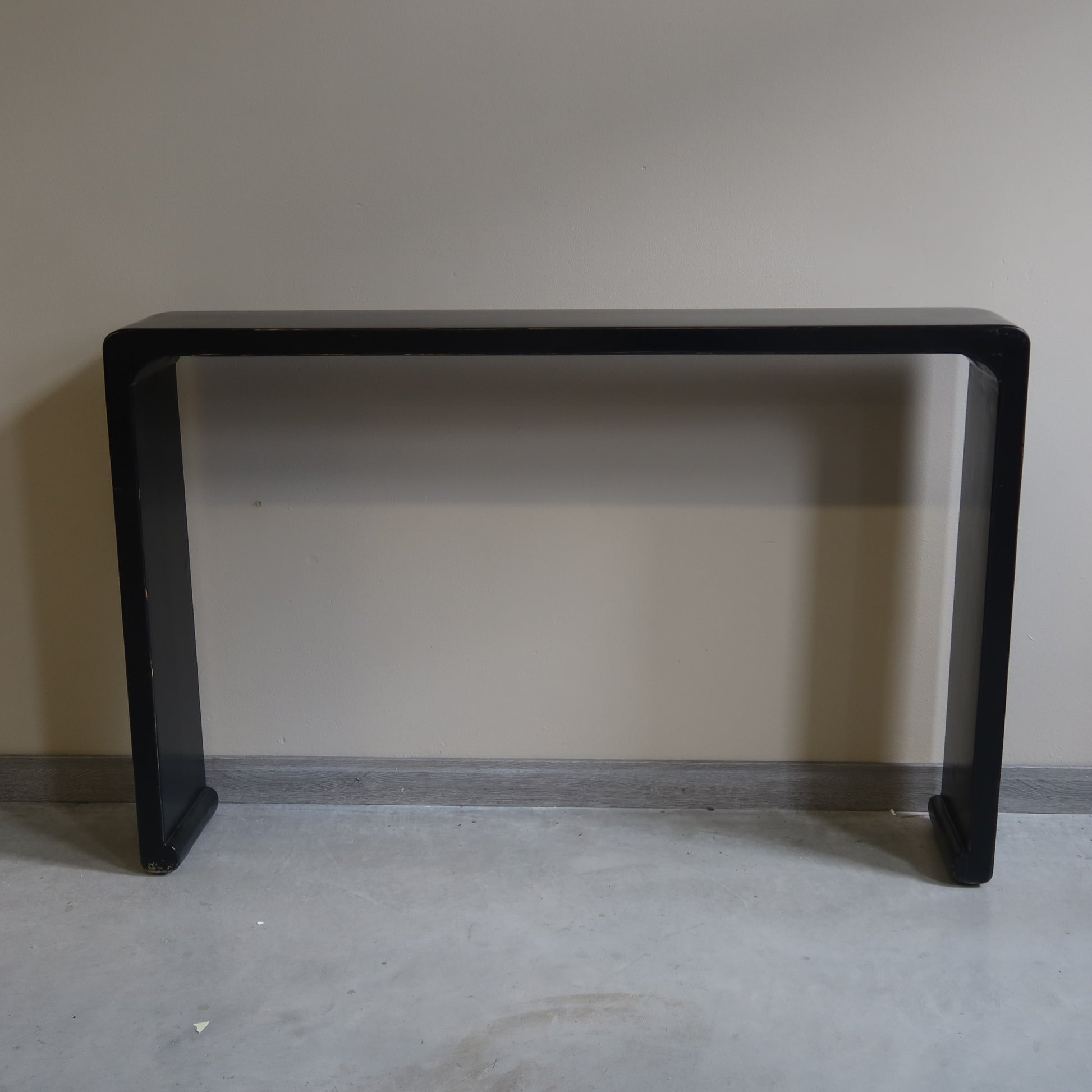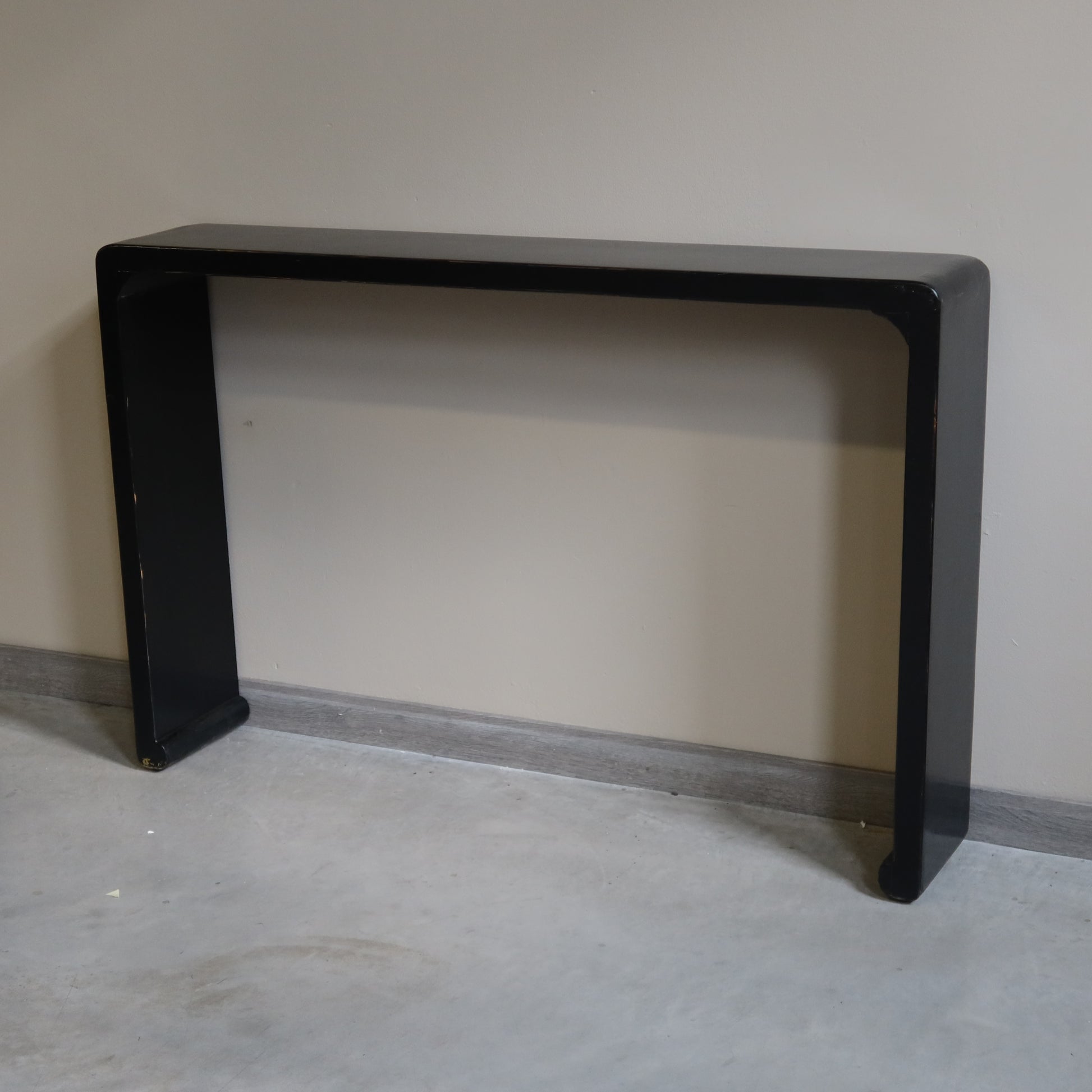 Stretta console etnica da centro con struttura a nastro. La console è in lacca nera monocromatica.