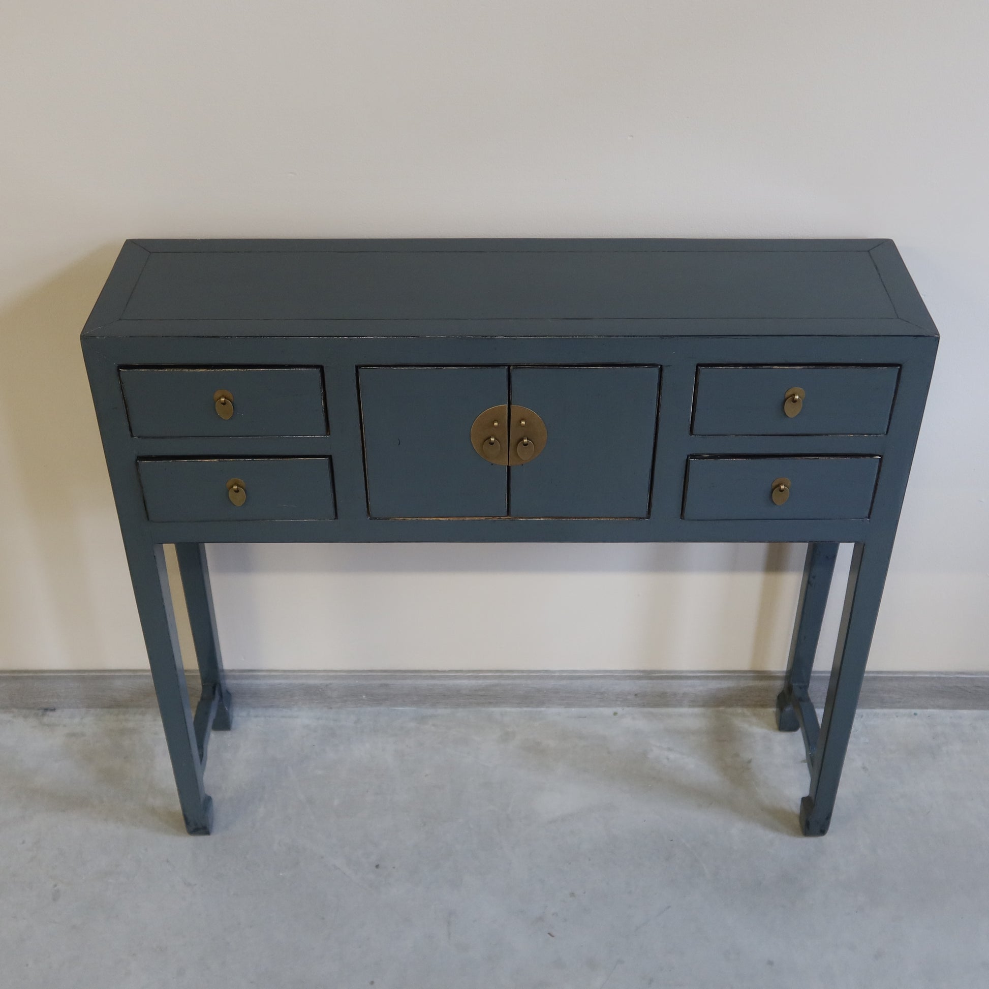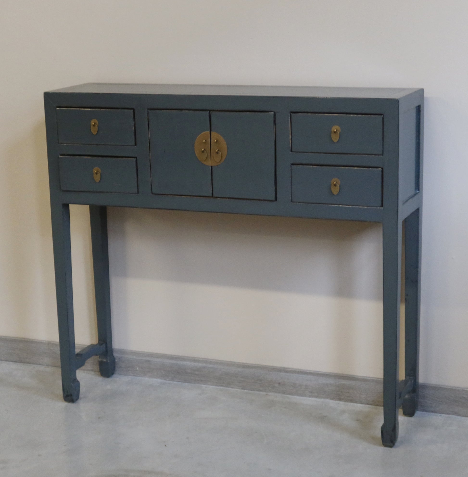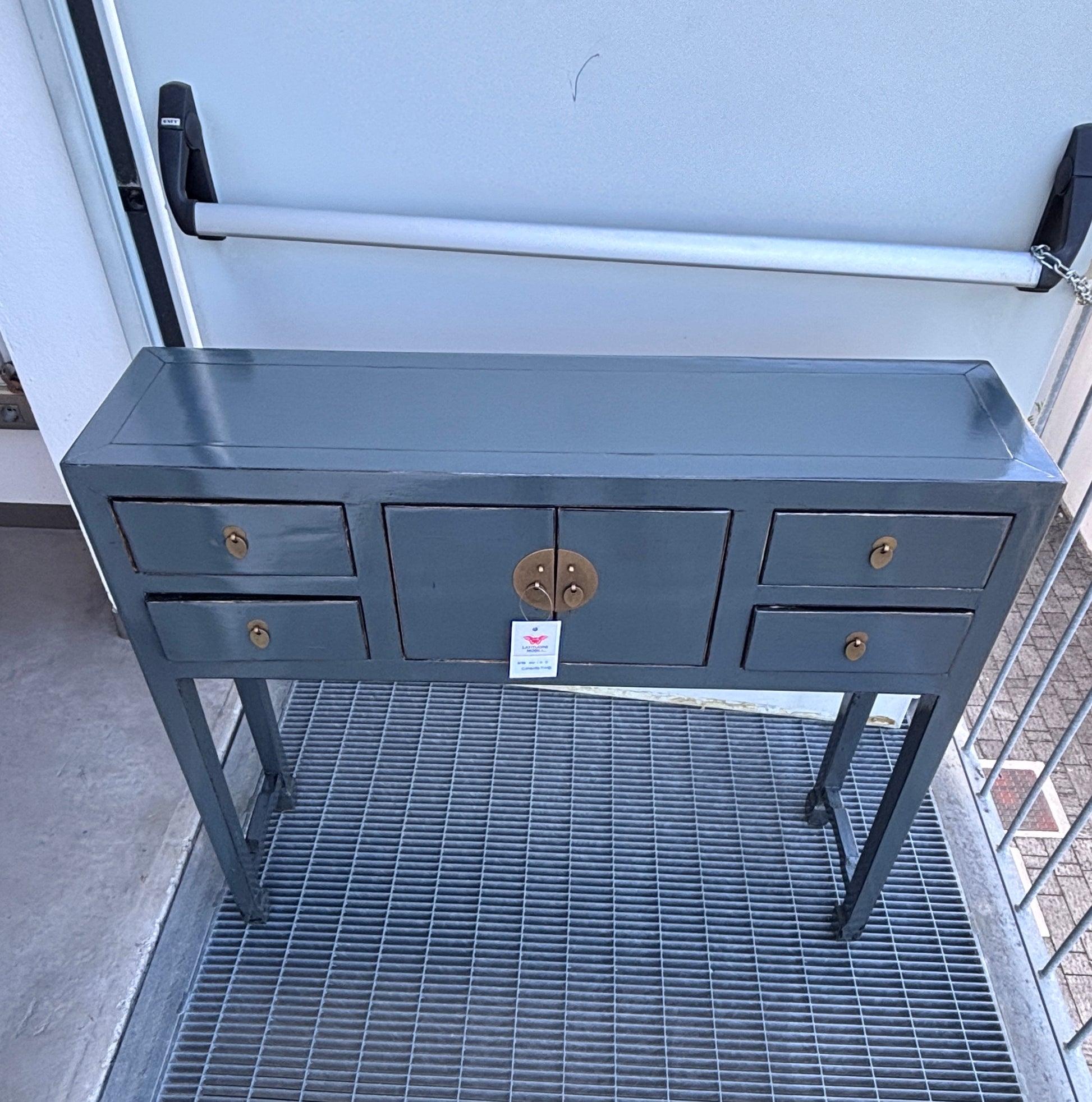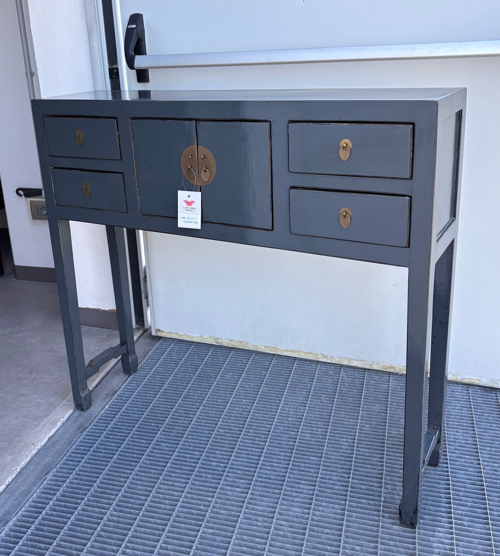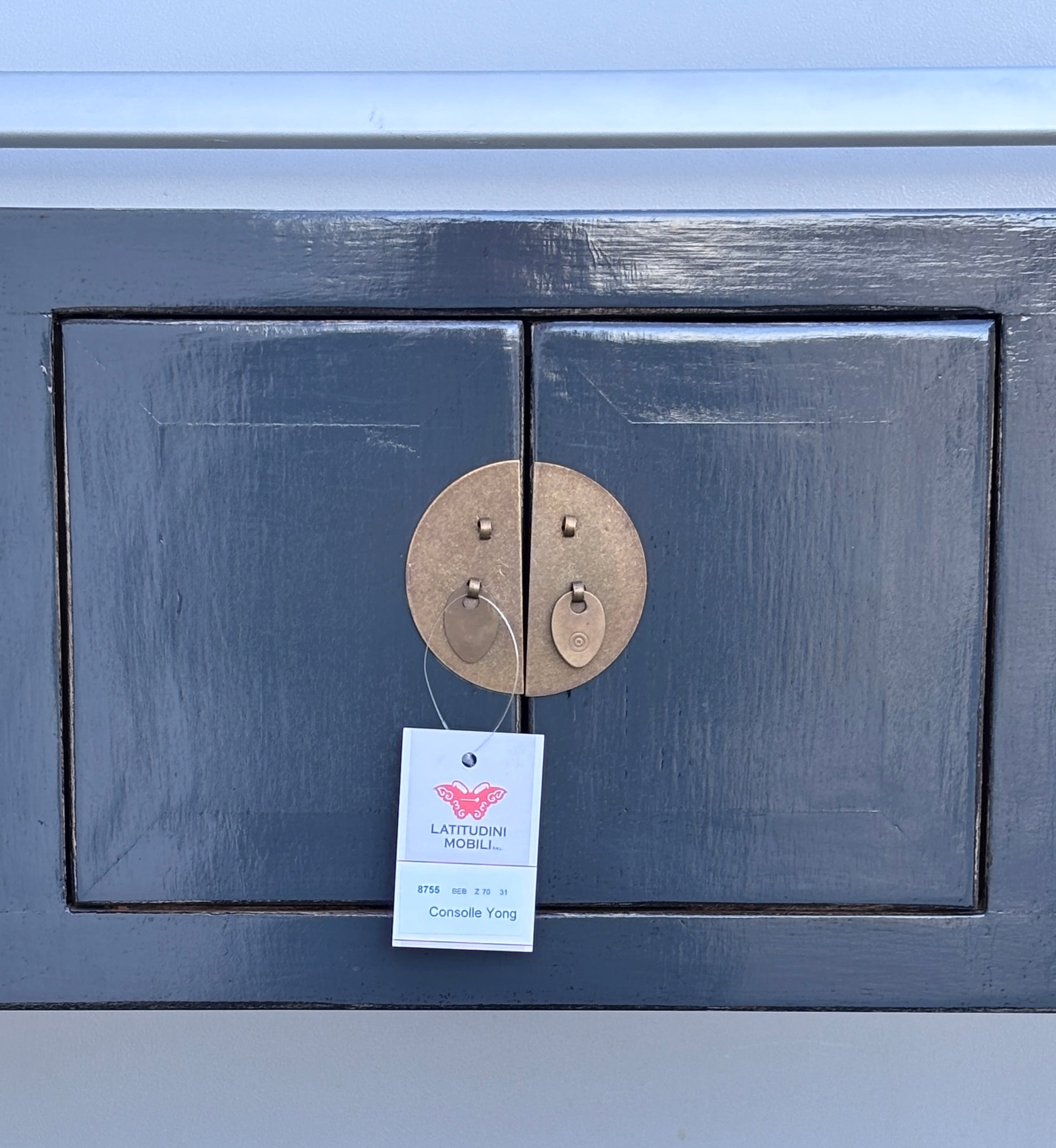 Stretta consolle laccata con gambe slanciate e parte contenitiva con 2 doppi cassetti laterali e vano a doppia antina. E' un mobile funzionale etnico ideale per ingressi, corridoi e tutti gli spazi di passaggio!