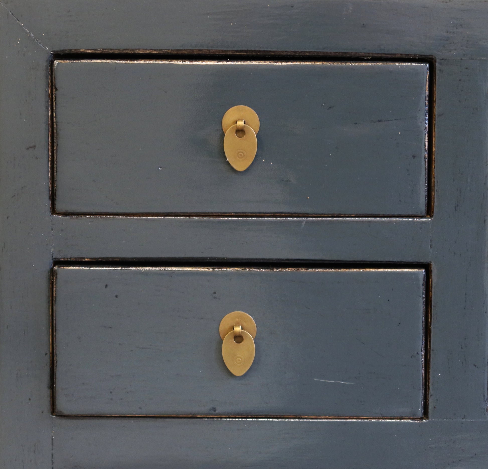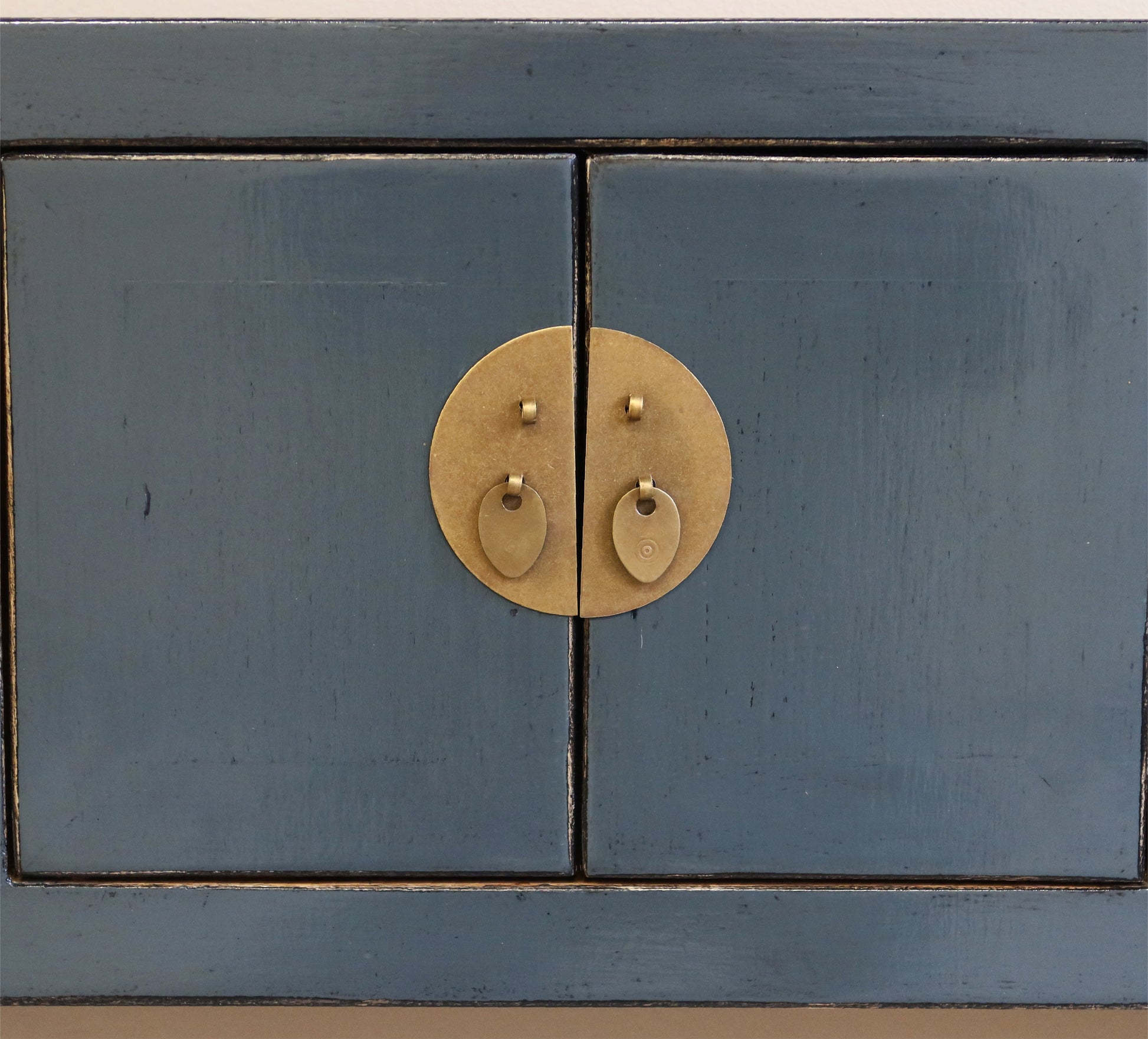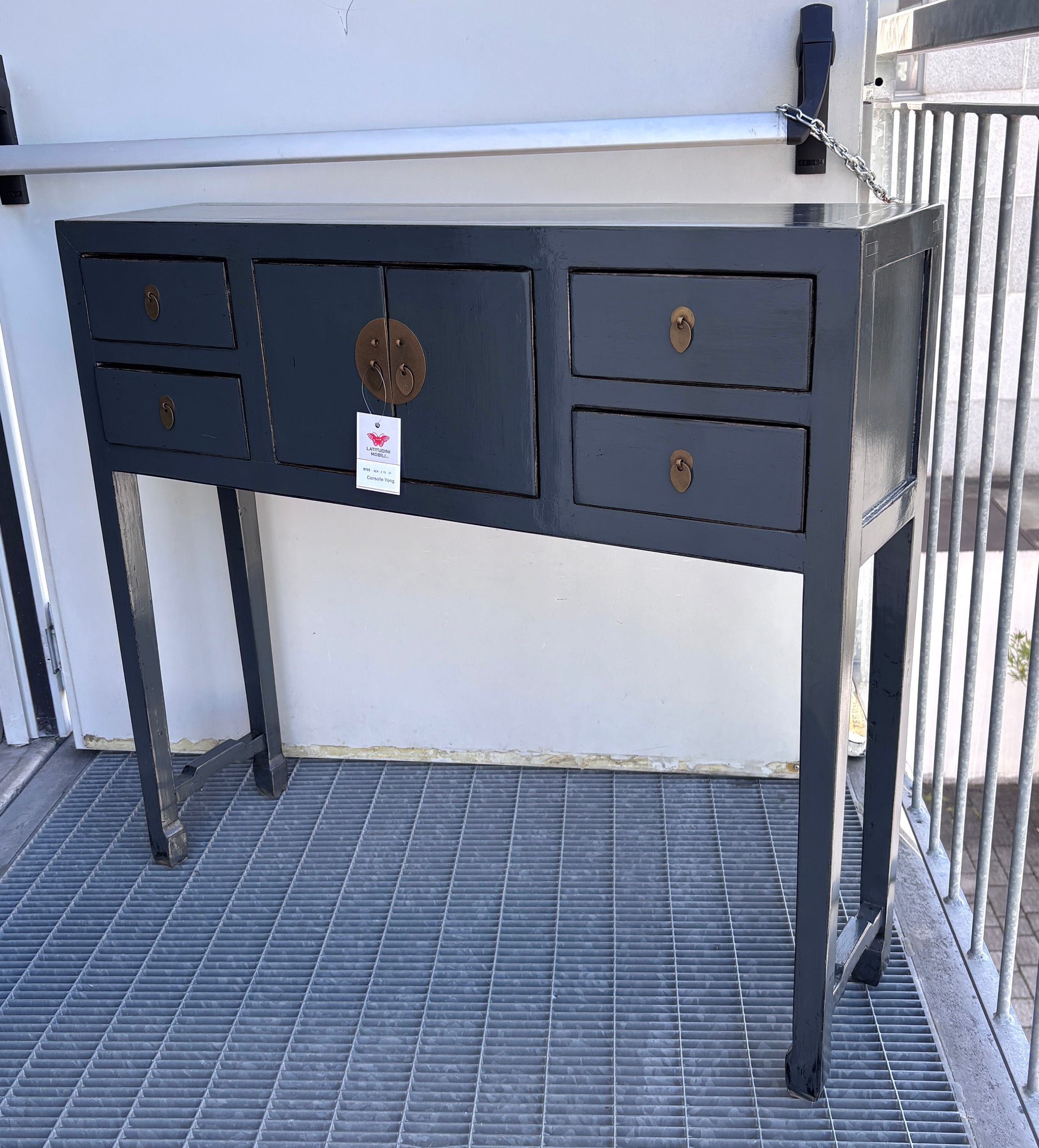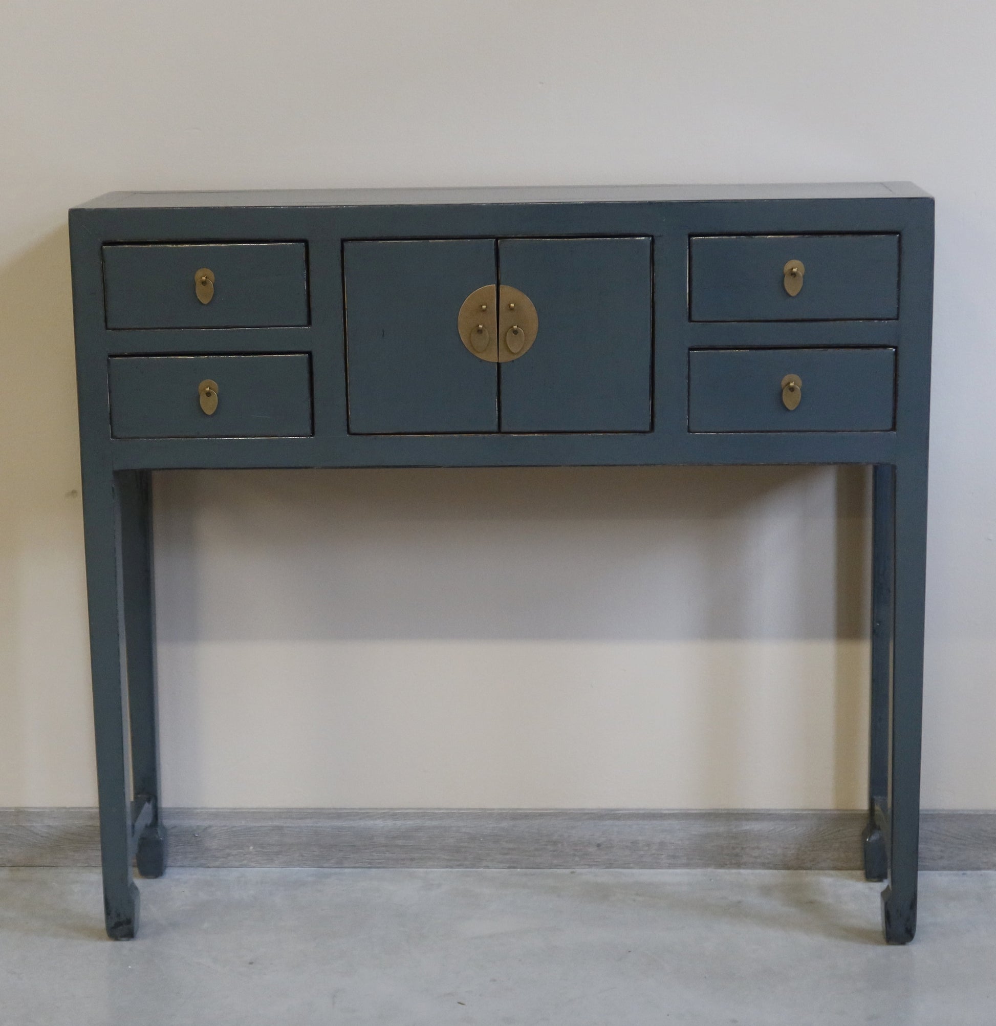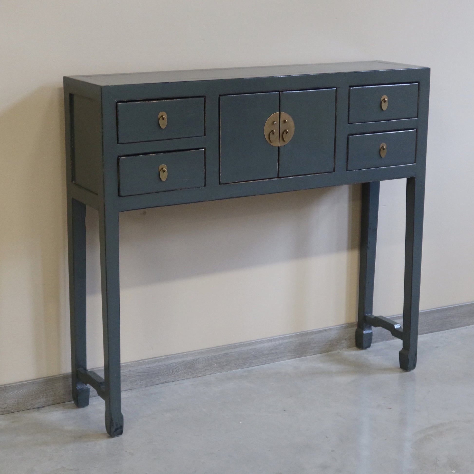 Stretta consolle laccata con gambe slanciate e parte contenitiva con 2 doppi cassetti laterali e vano a doppia antina. E' un mobile funzionale etnico ideale per ingressi, corridoi e tutti gli spazi di passaggio!