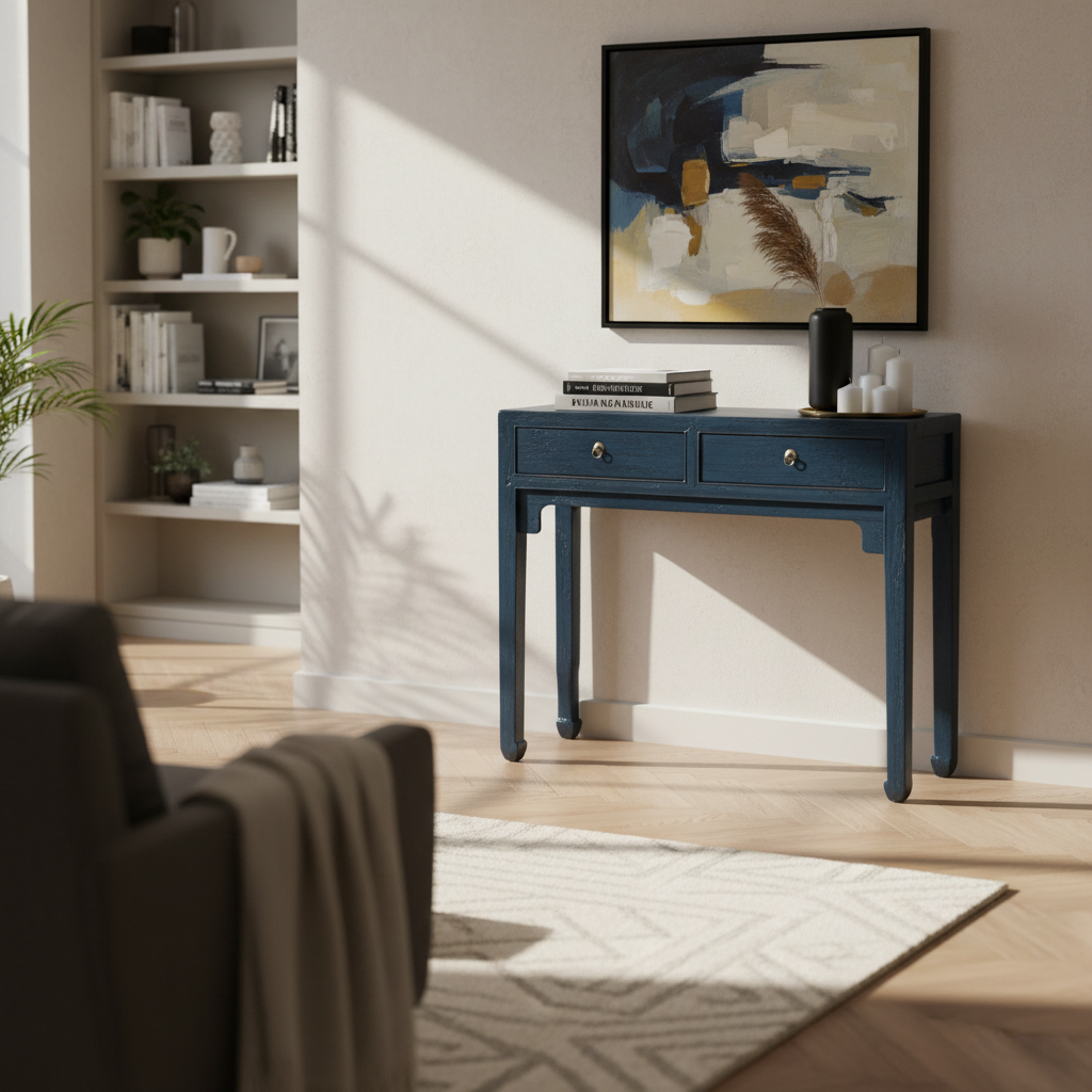 Consolle in lacca blu con fronte a due cassetti e gambe slanciate.