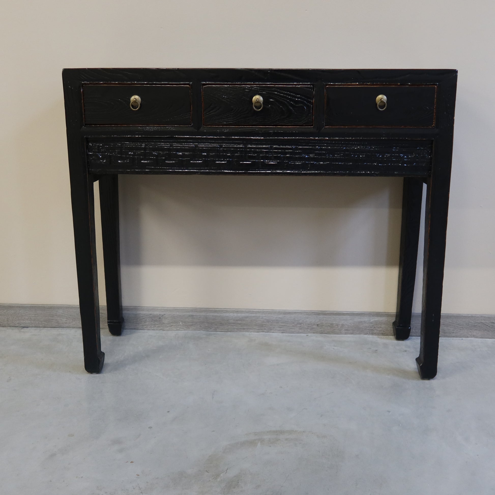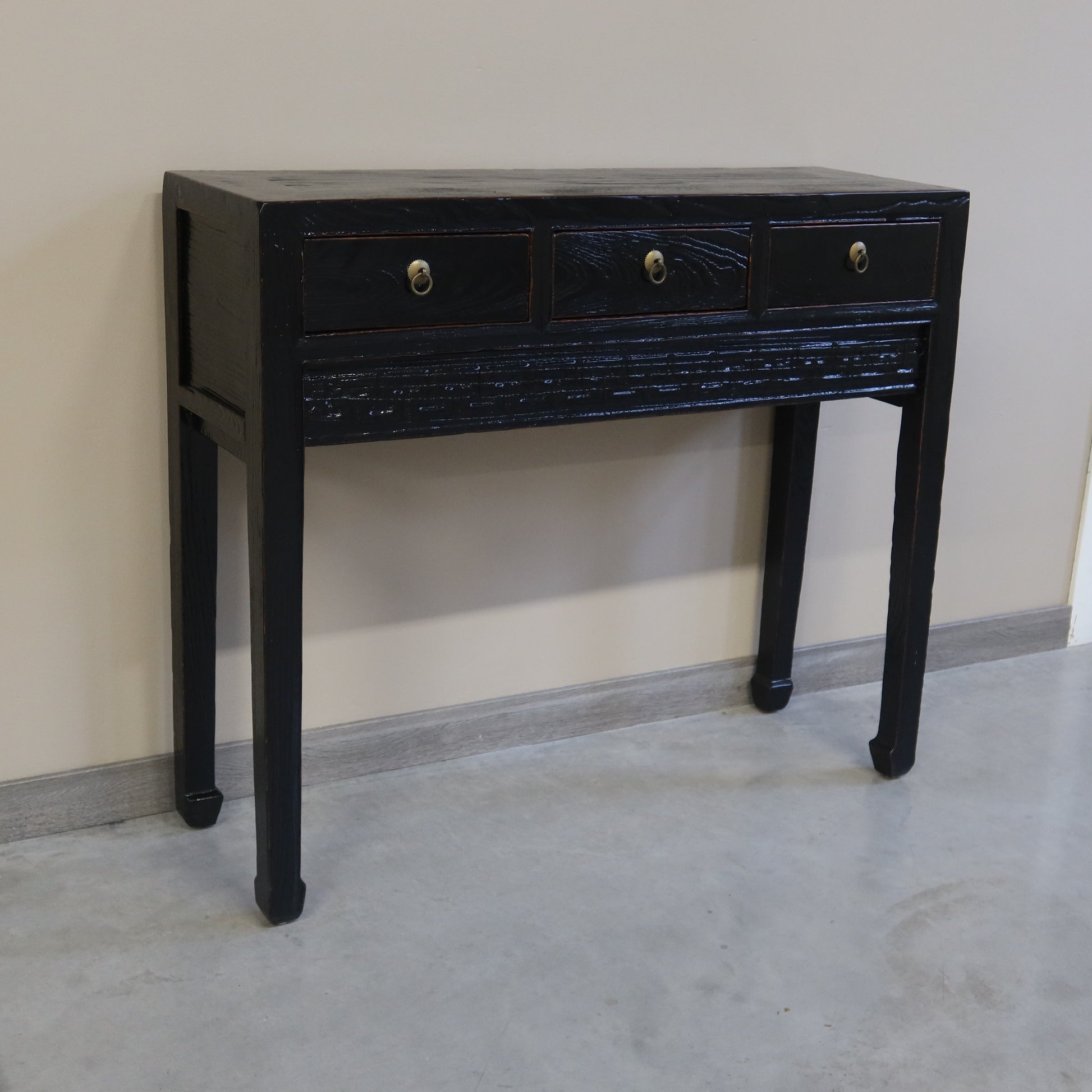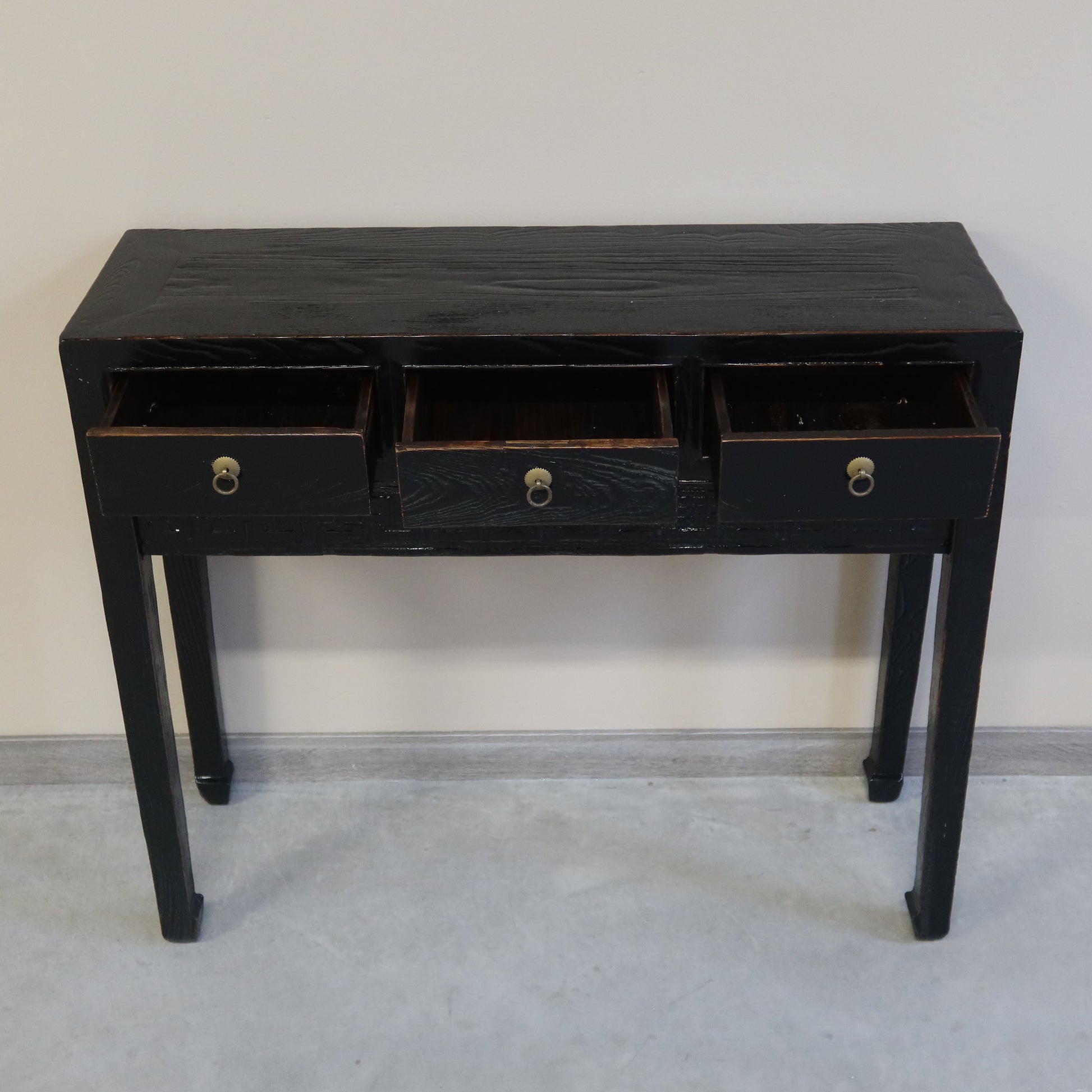 Elegante tavolo da appoggio in olmo massello con 3 cassetti. Finitura in lacca nera