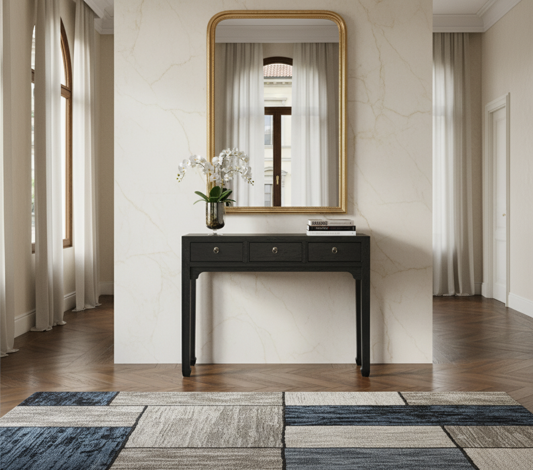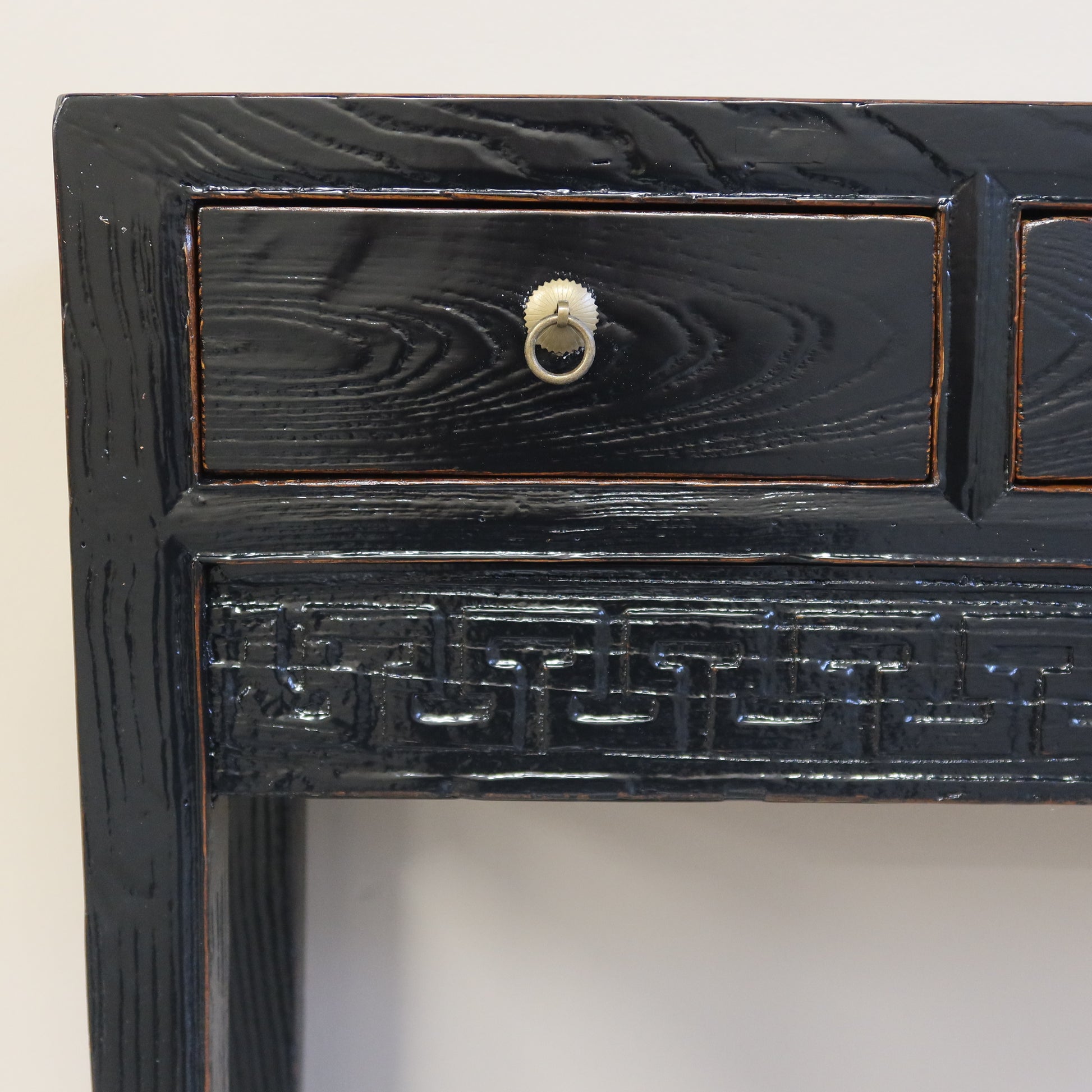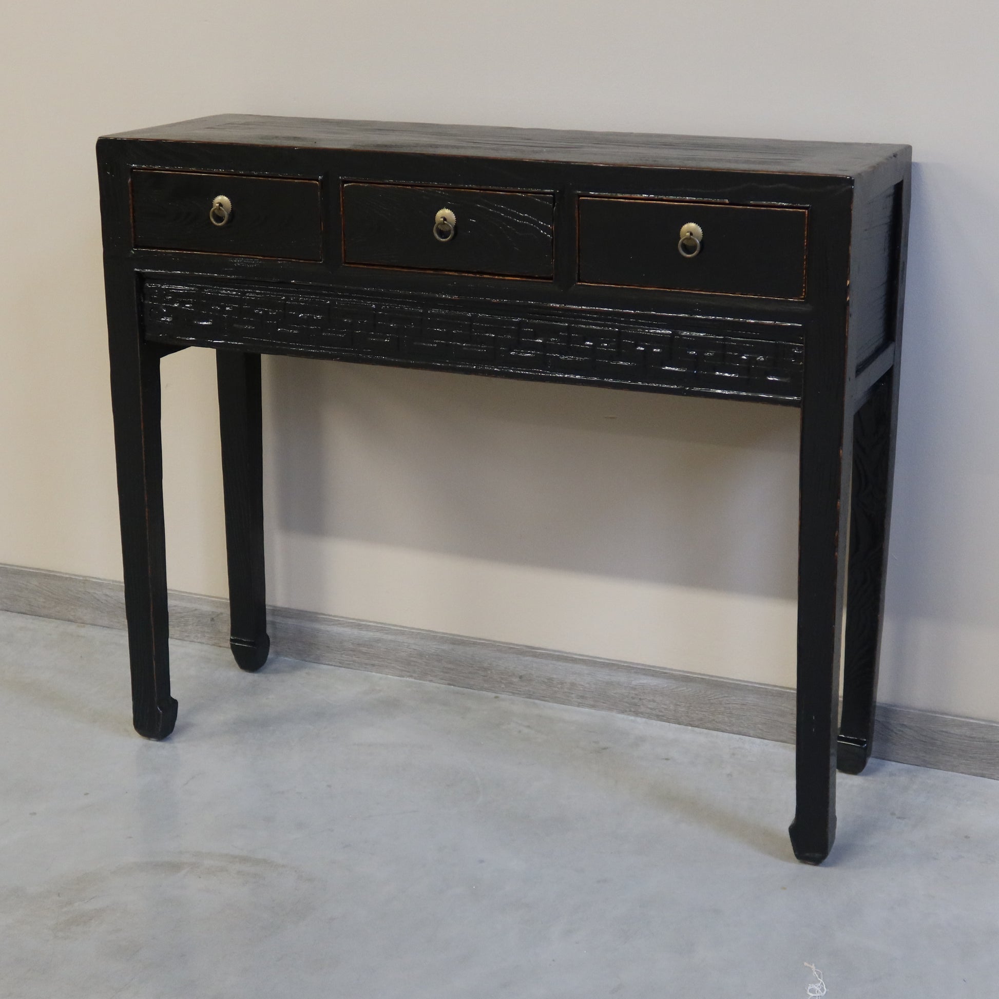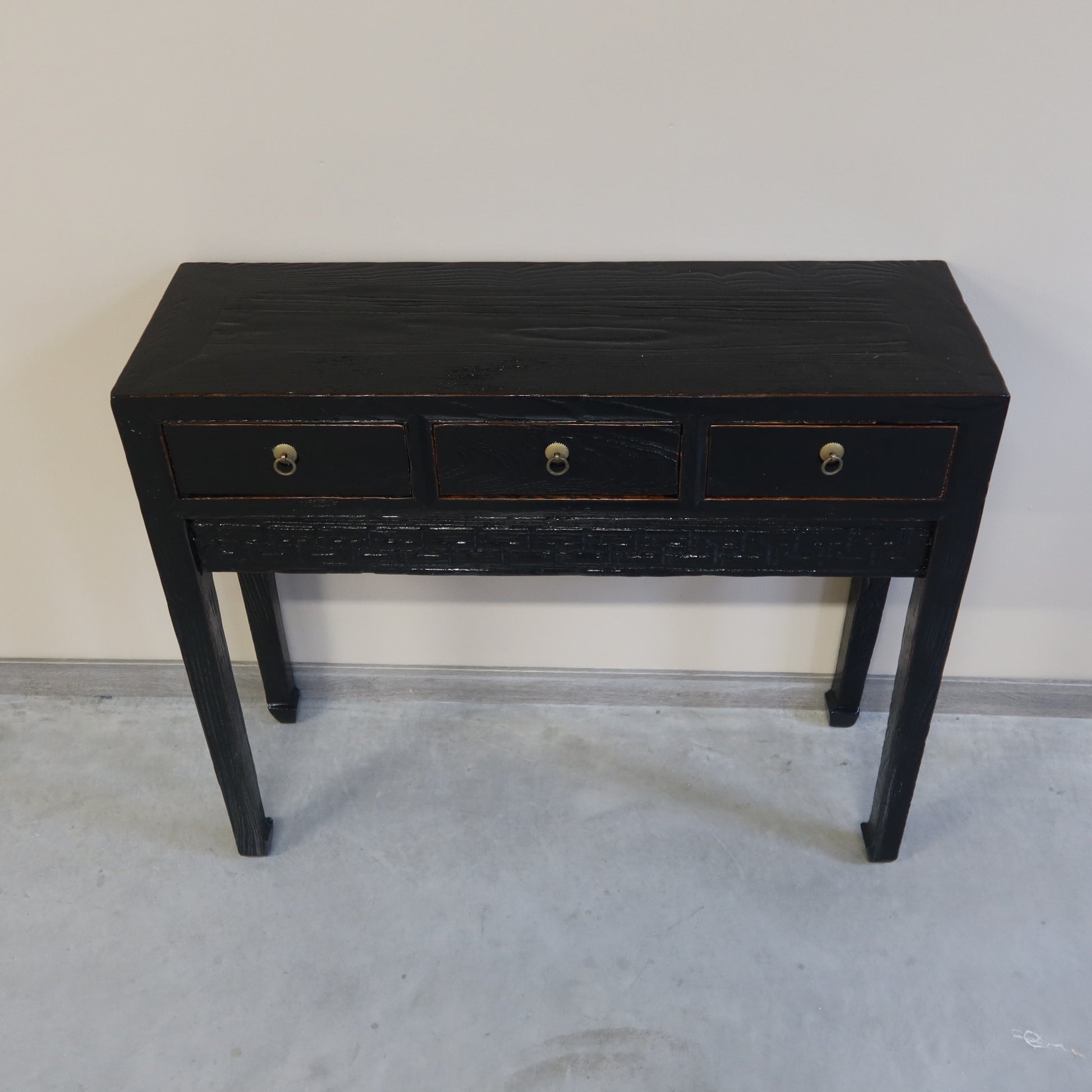 Elegante tavolo da appoggio in olmo massello con 3 cassetti. Finitura in lacca nera