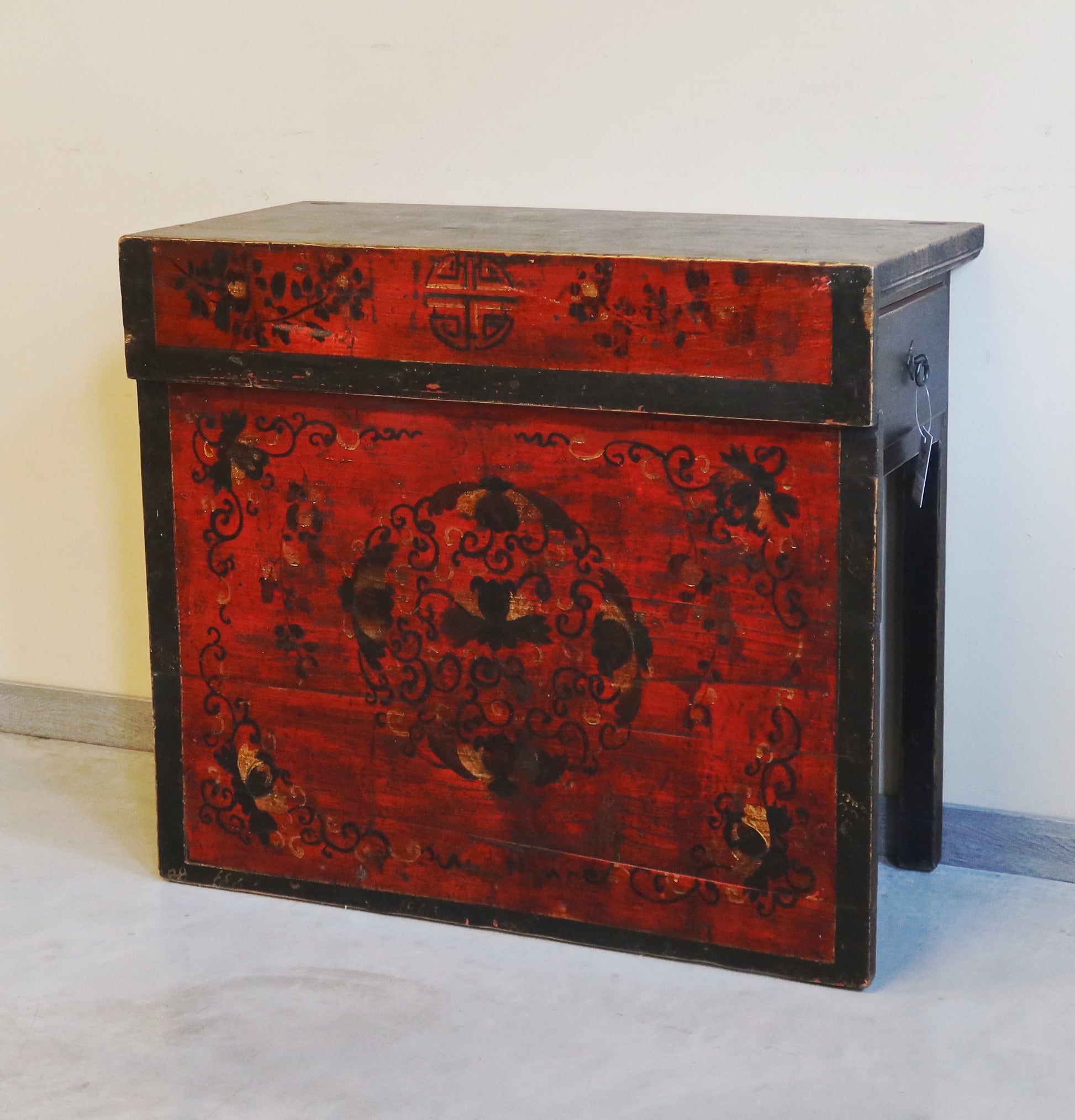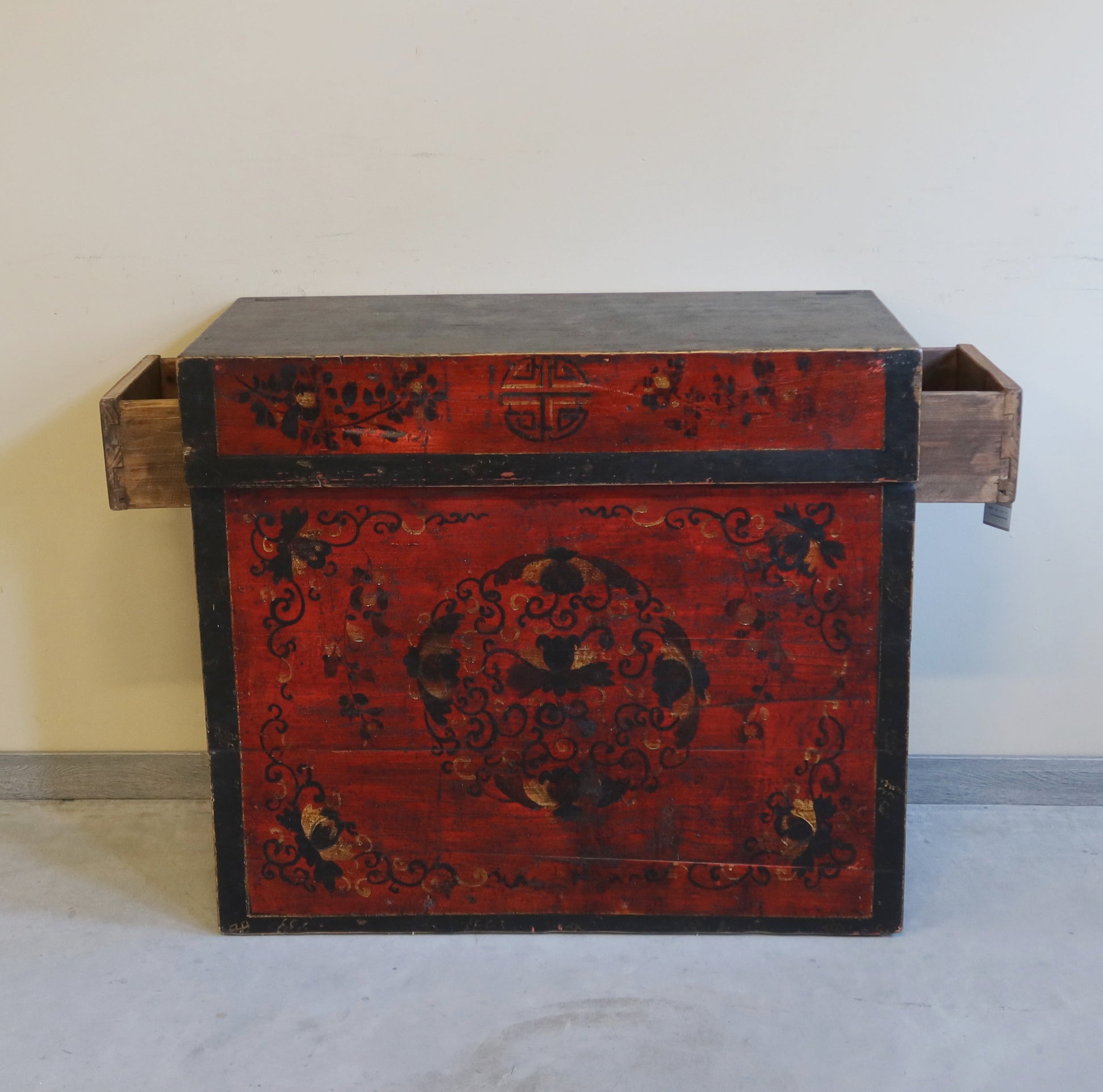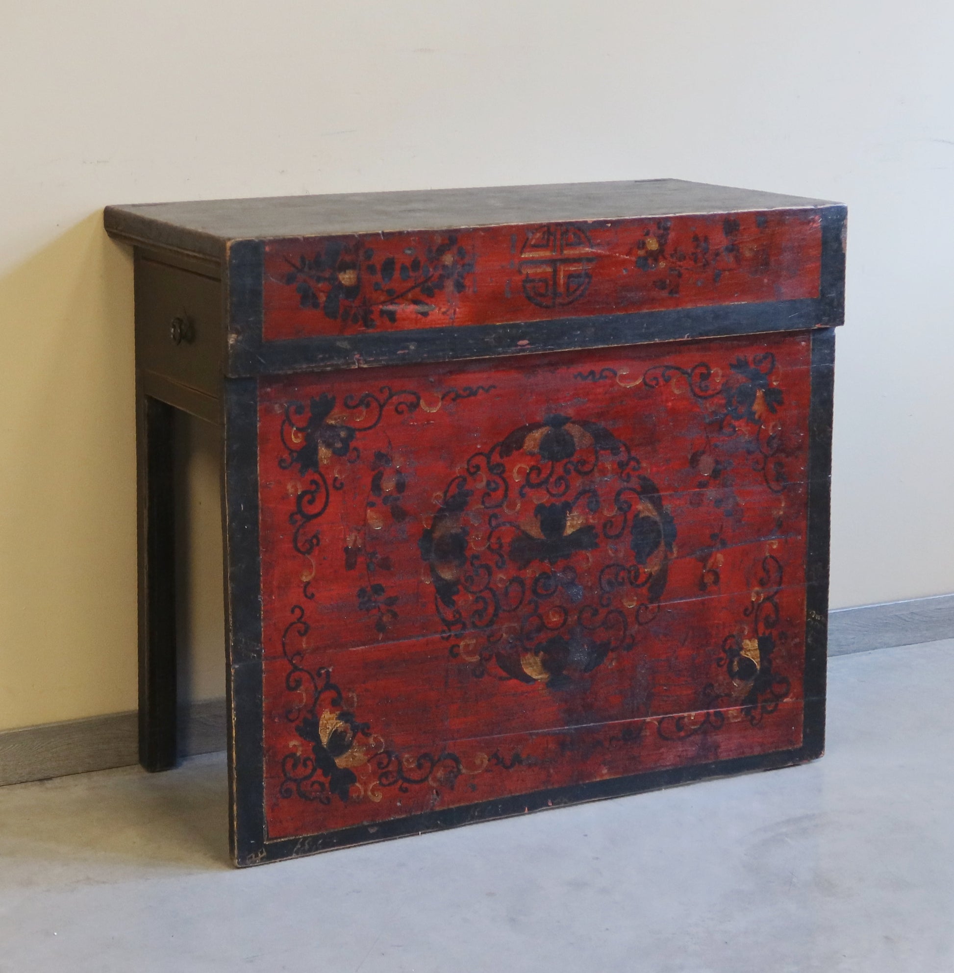 Straordinaria mobile consolle con cassetti laterali in patina dal caratteristico fronte decorato. Provenienza Mongolia.