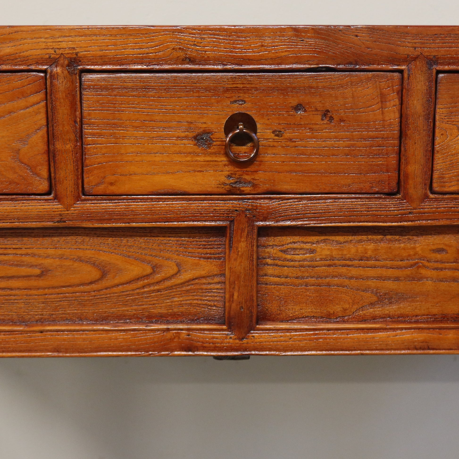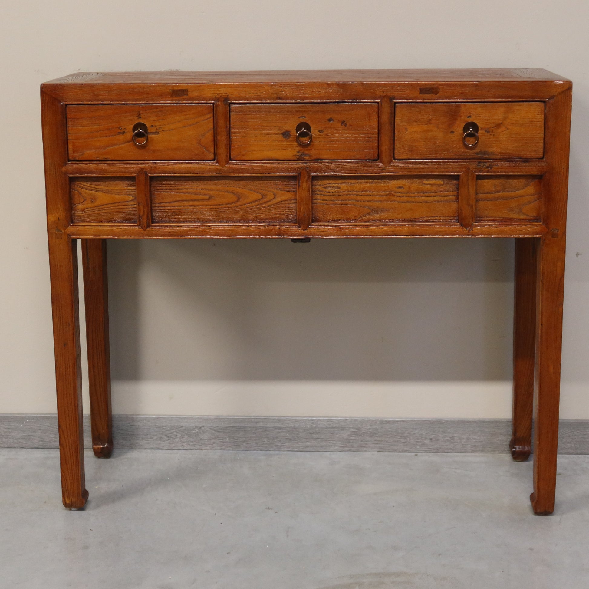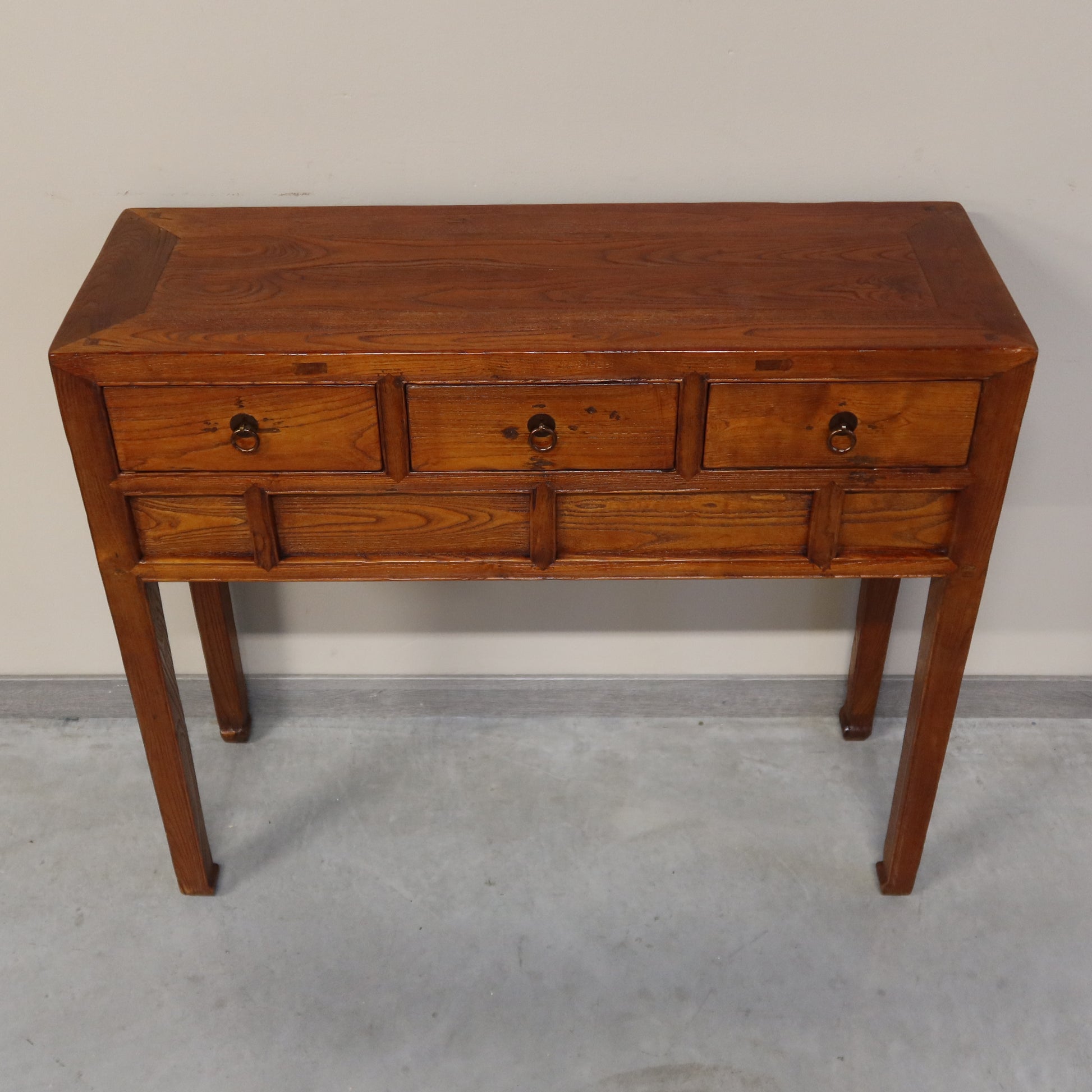 Semplice tavolo da appoggio in olmo biondo con cassetti sul fronte e gambe molto slanciate. Molto particolare la bella venatura del legno ben visibile.