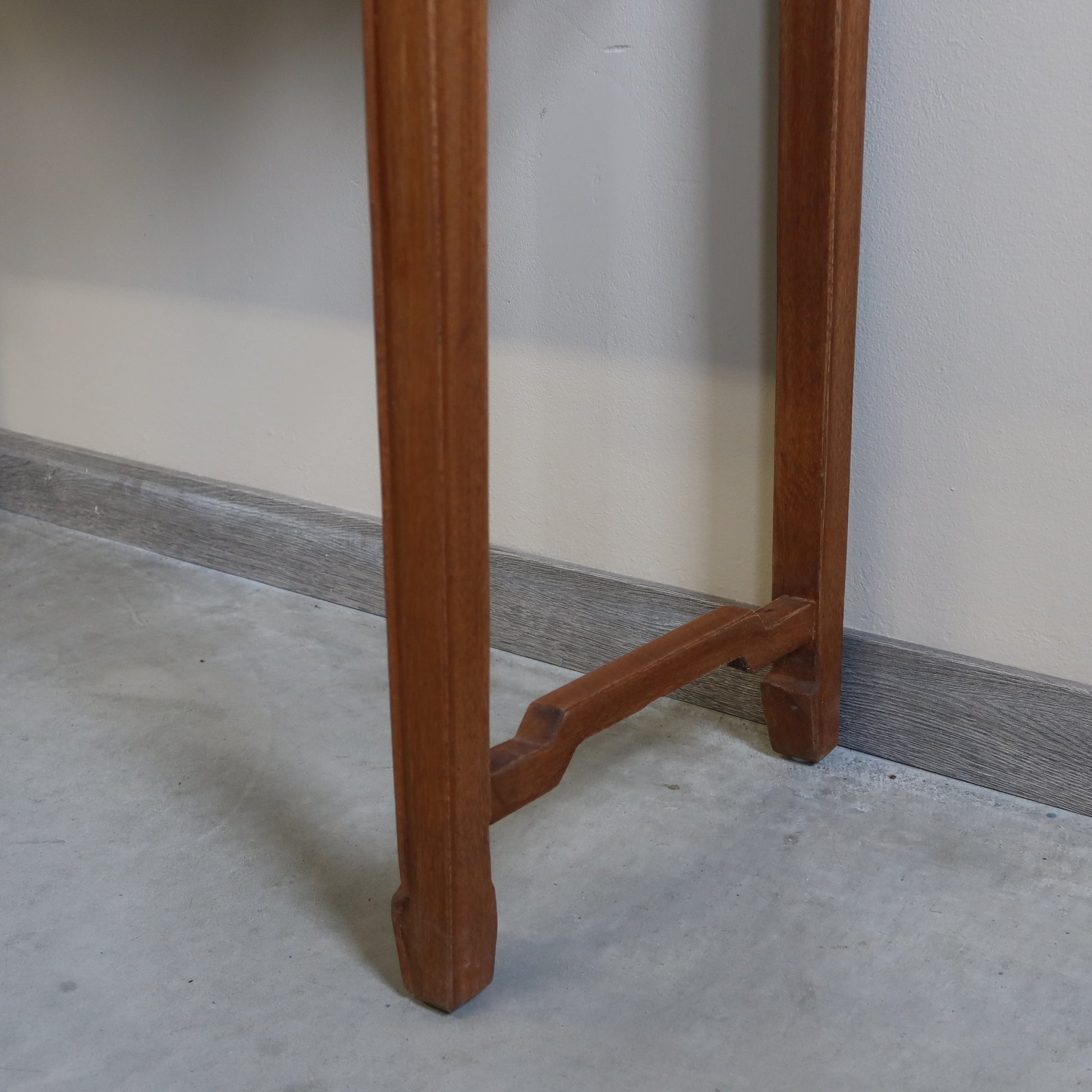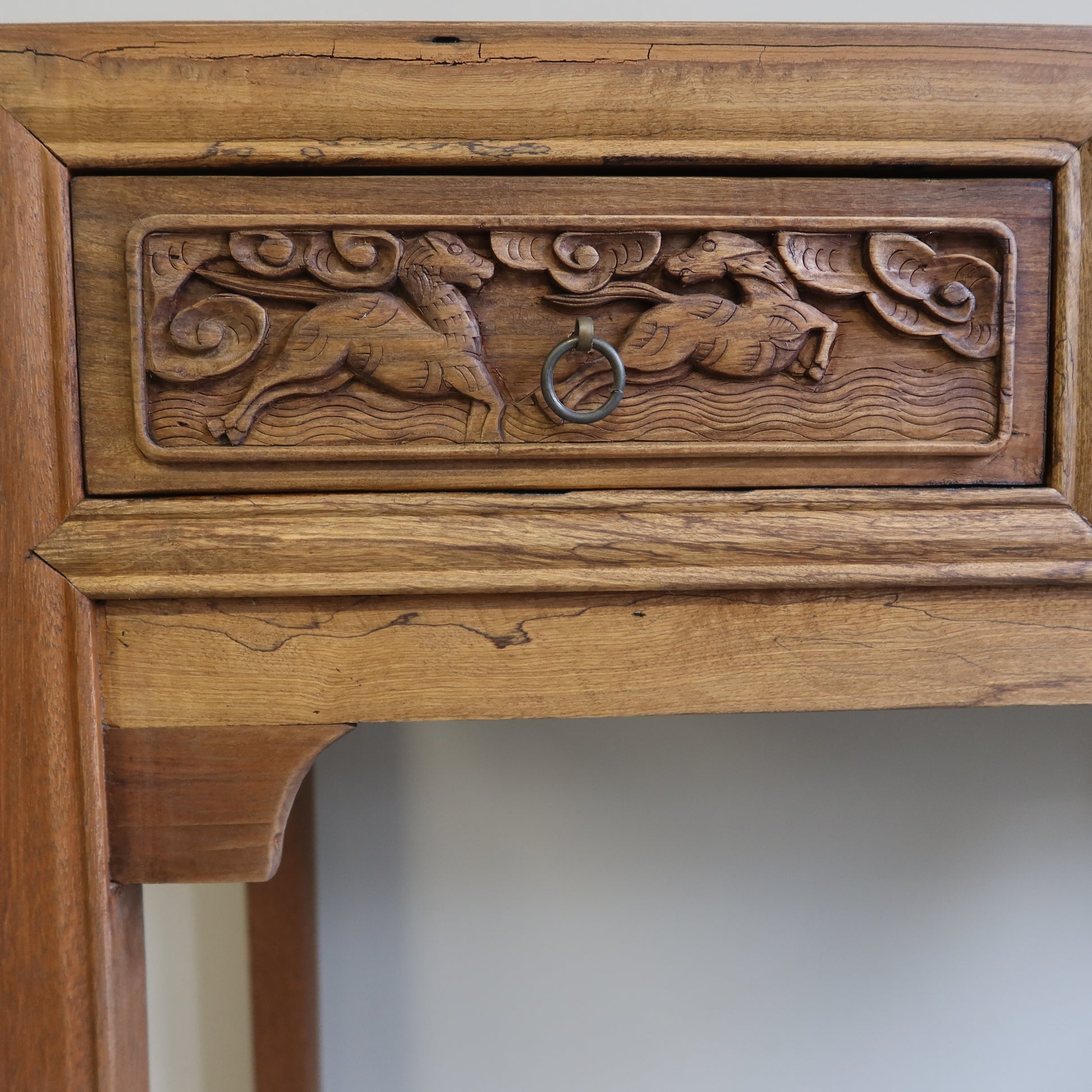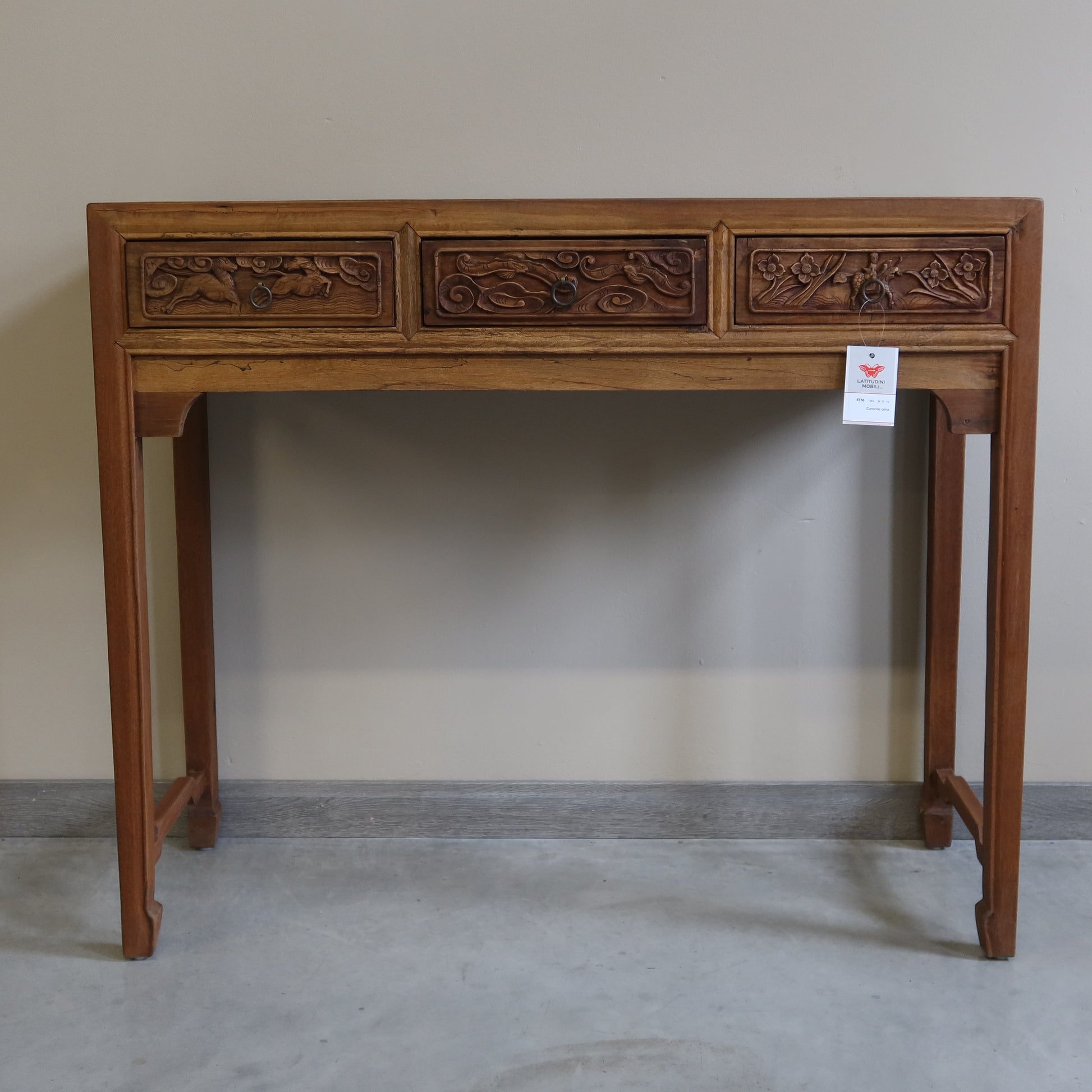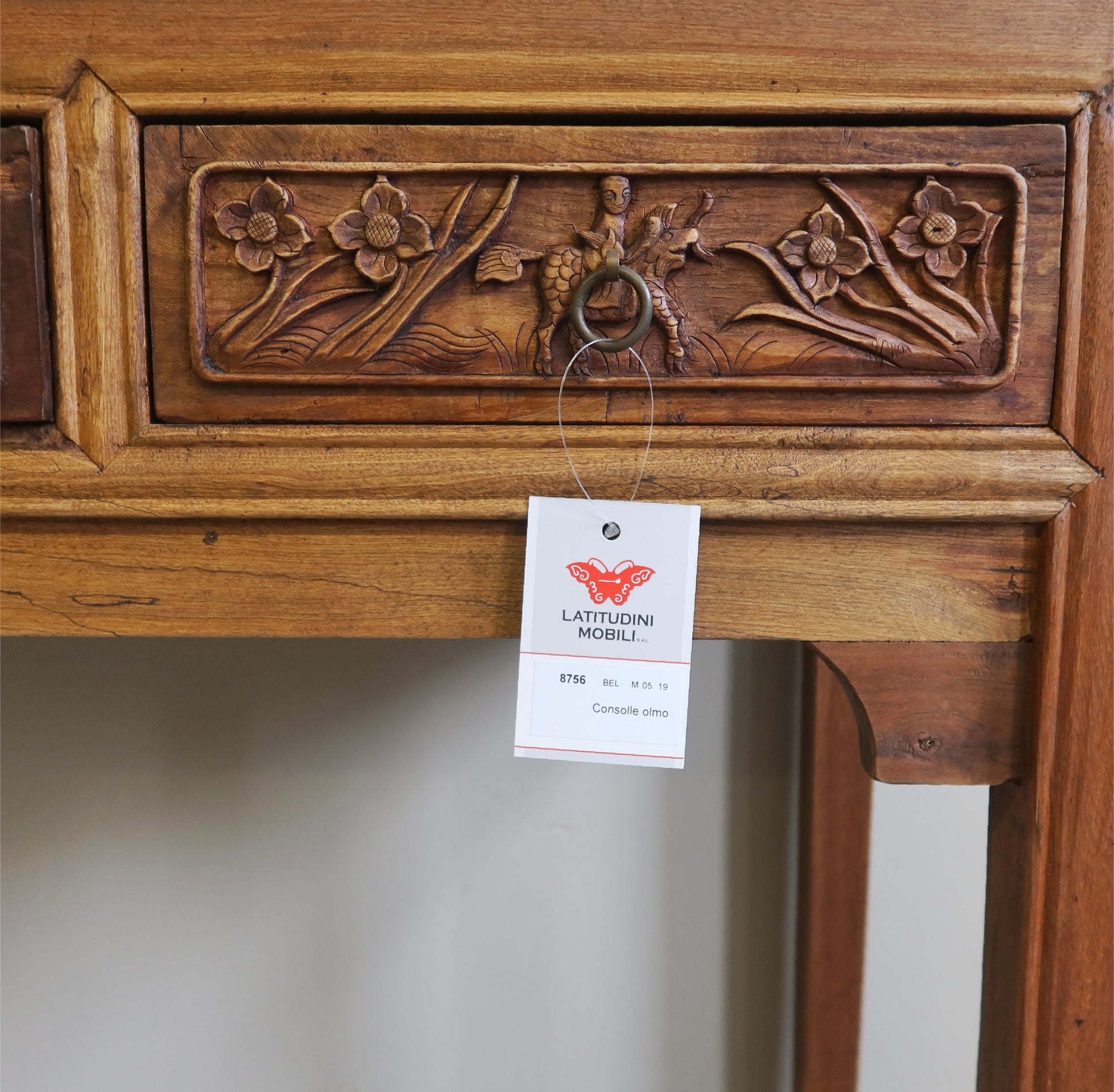 Semplice tavolo da appoggio in olmo biondo con cassetti sul fronte e gambe molto slanciate. Molto particolare la bella venatura del legno ben visibile e i cassetti con pregevoli intagli.