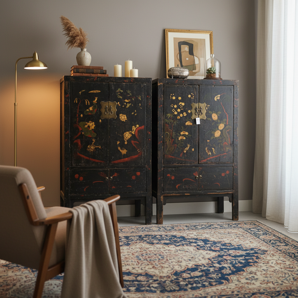 Coppia di splendidi armadi antichi in patina con caratteristici decori, provenienti dalla regione dello Shanxi. IL PREZZO INDICATO E' PER SINGOLO ARMADIO