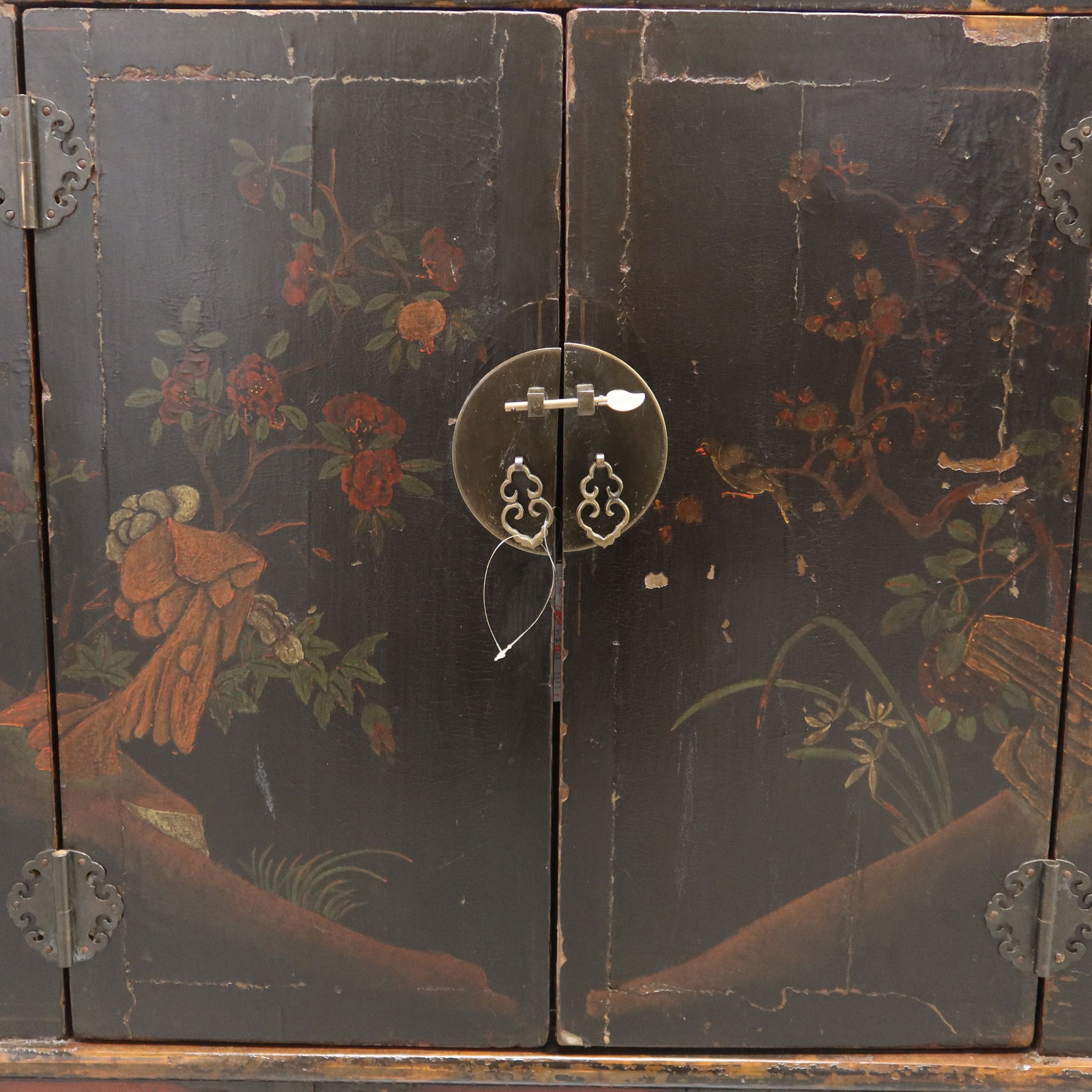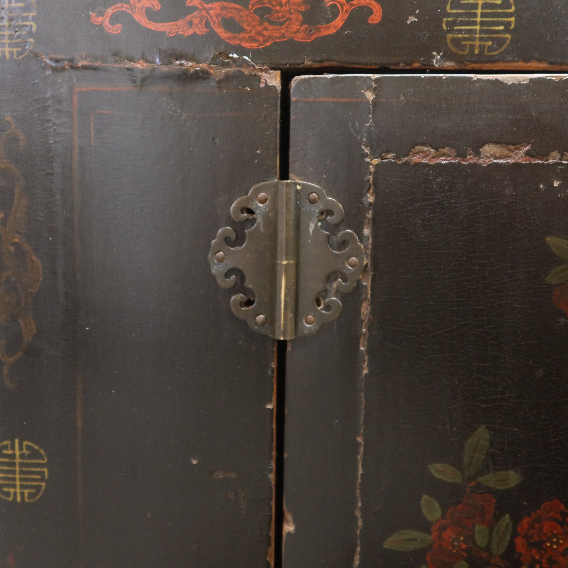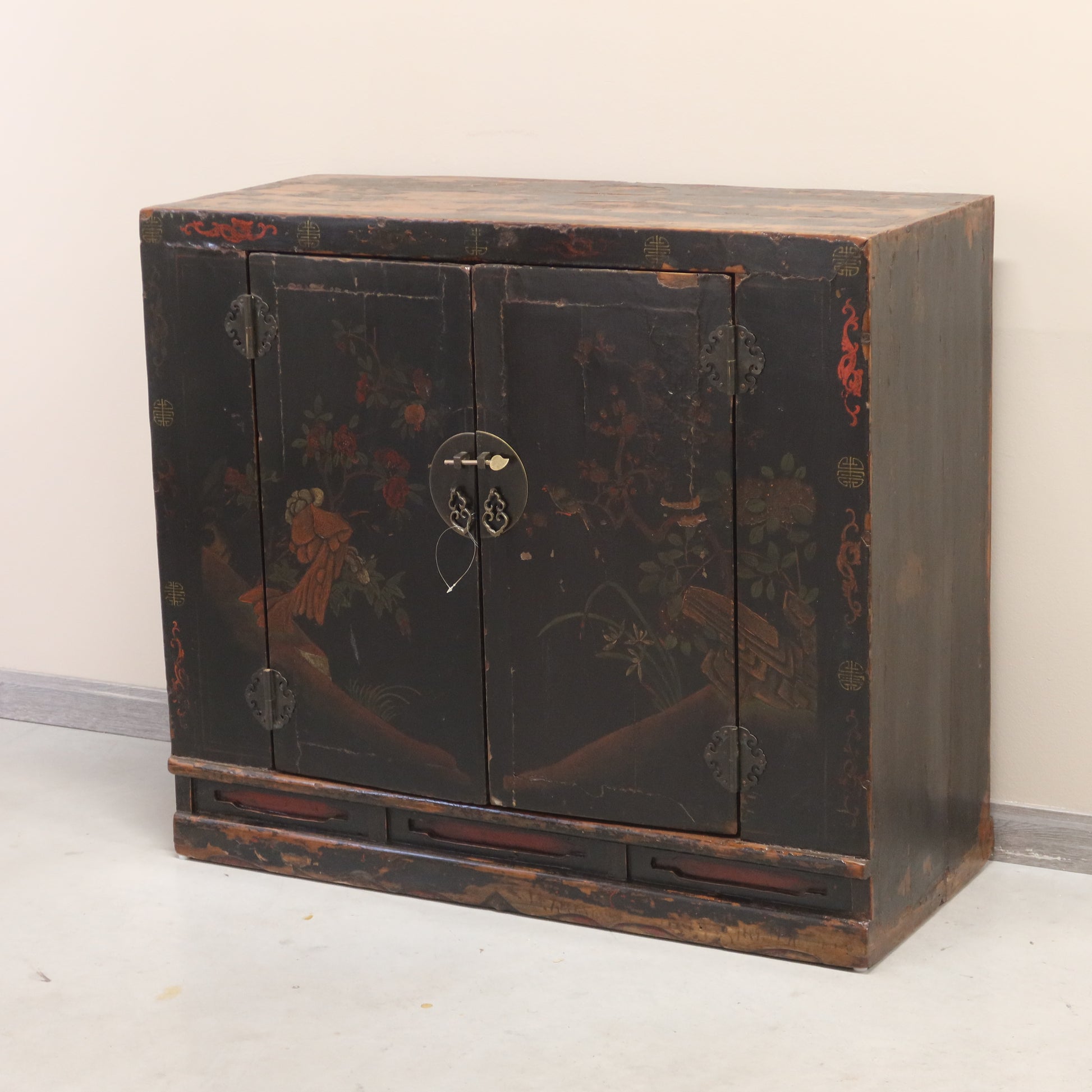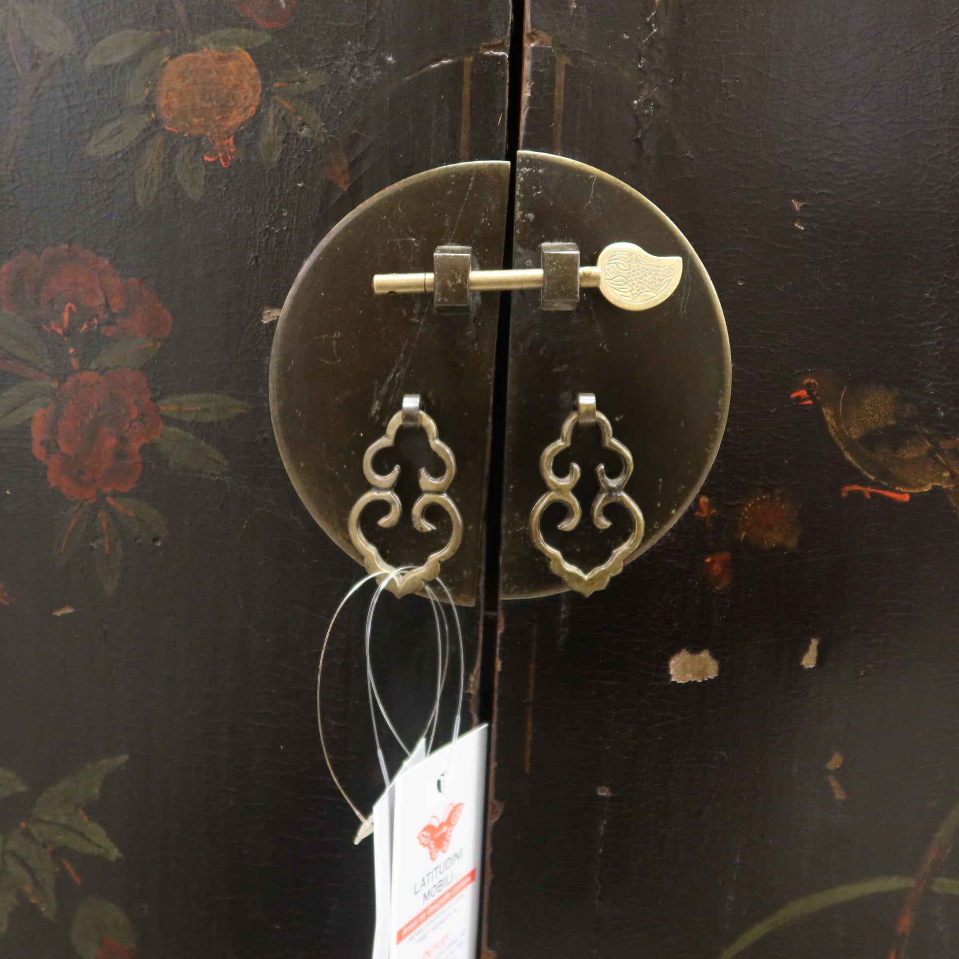 Bellissimo grande baule etnico ad apertura frontale con ante e struttura in lacca nera. Il fronte riporta un decoro pittorico floreale sulle ante. Finitura in patina.