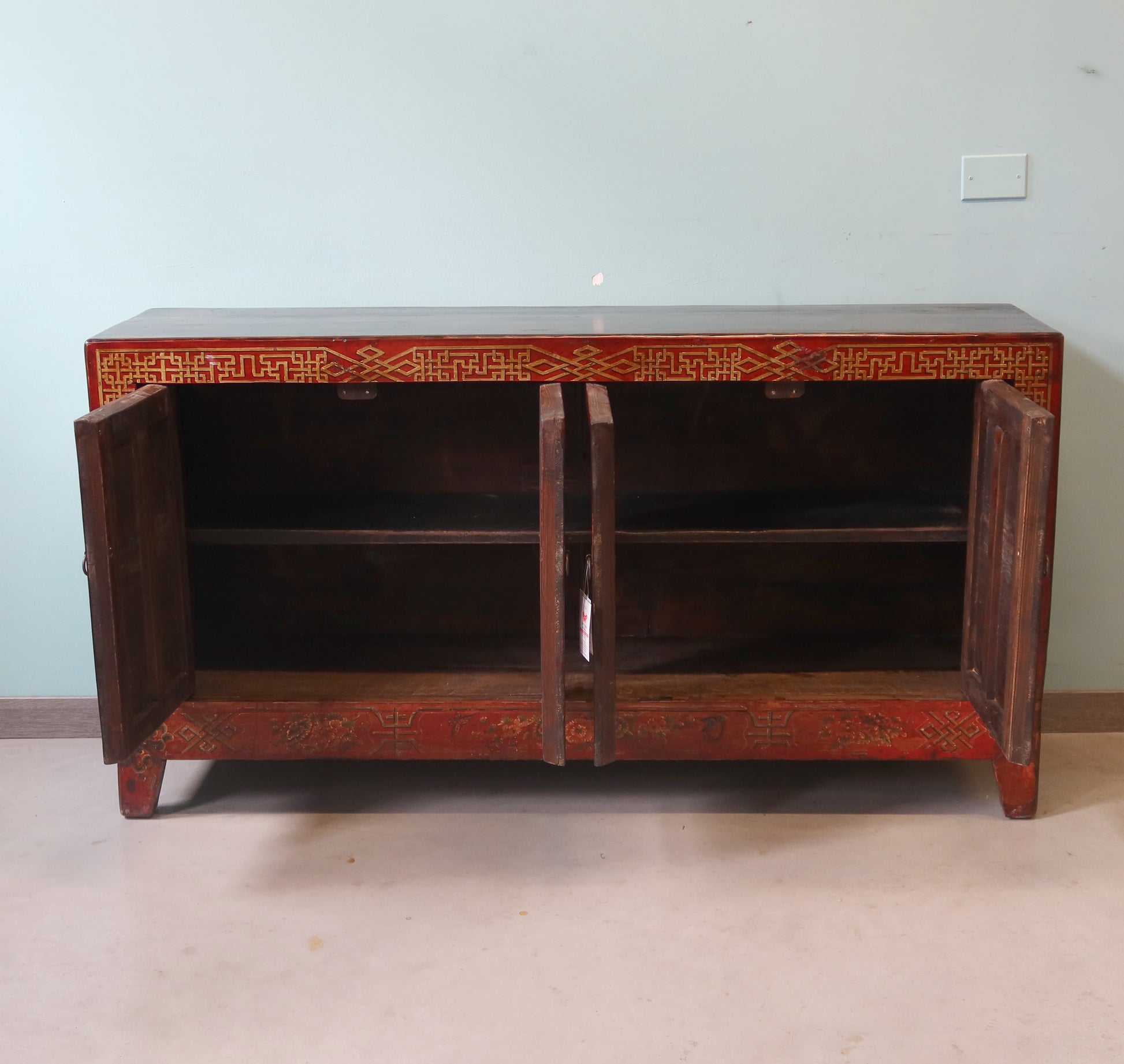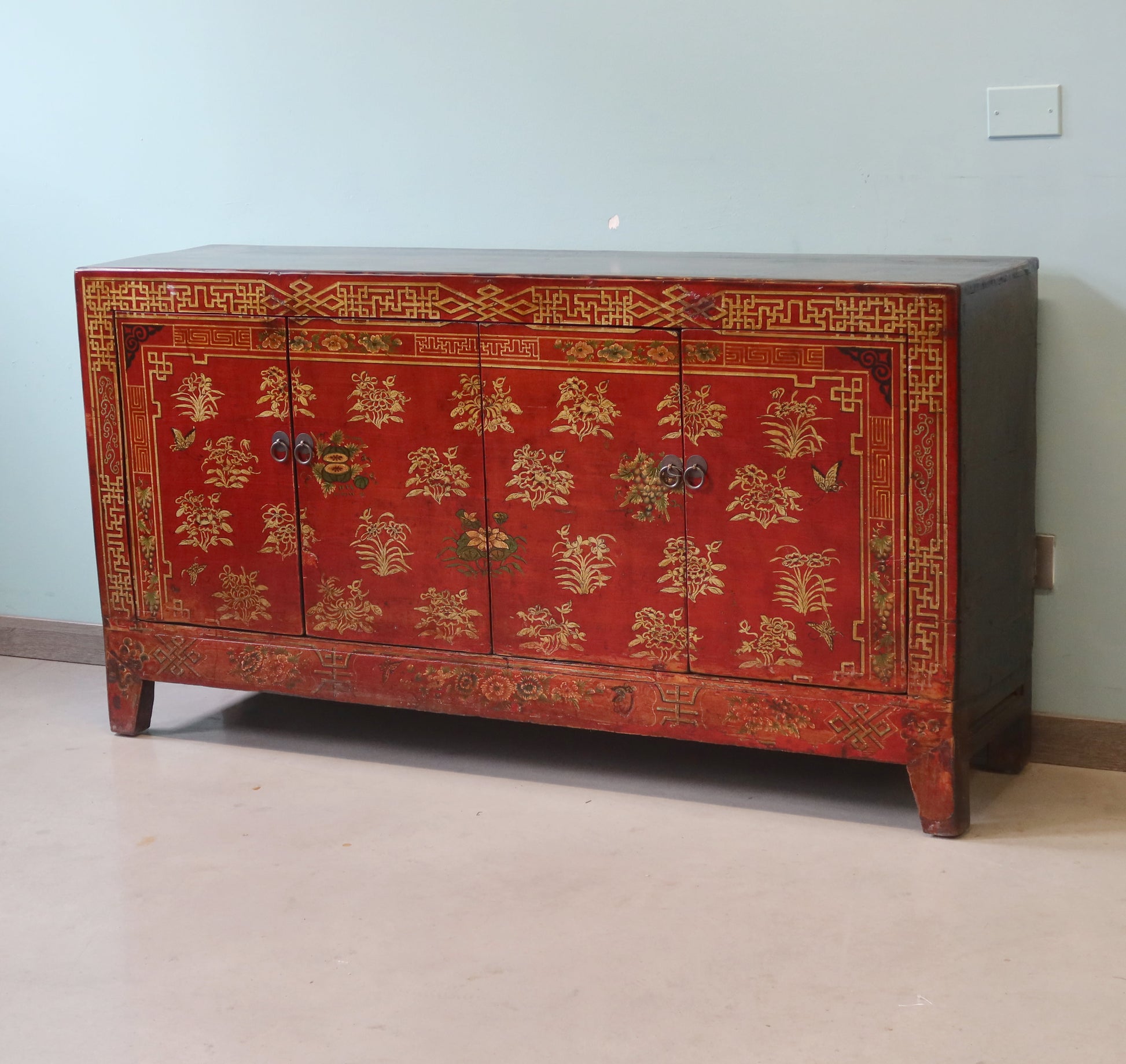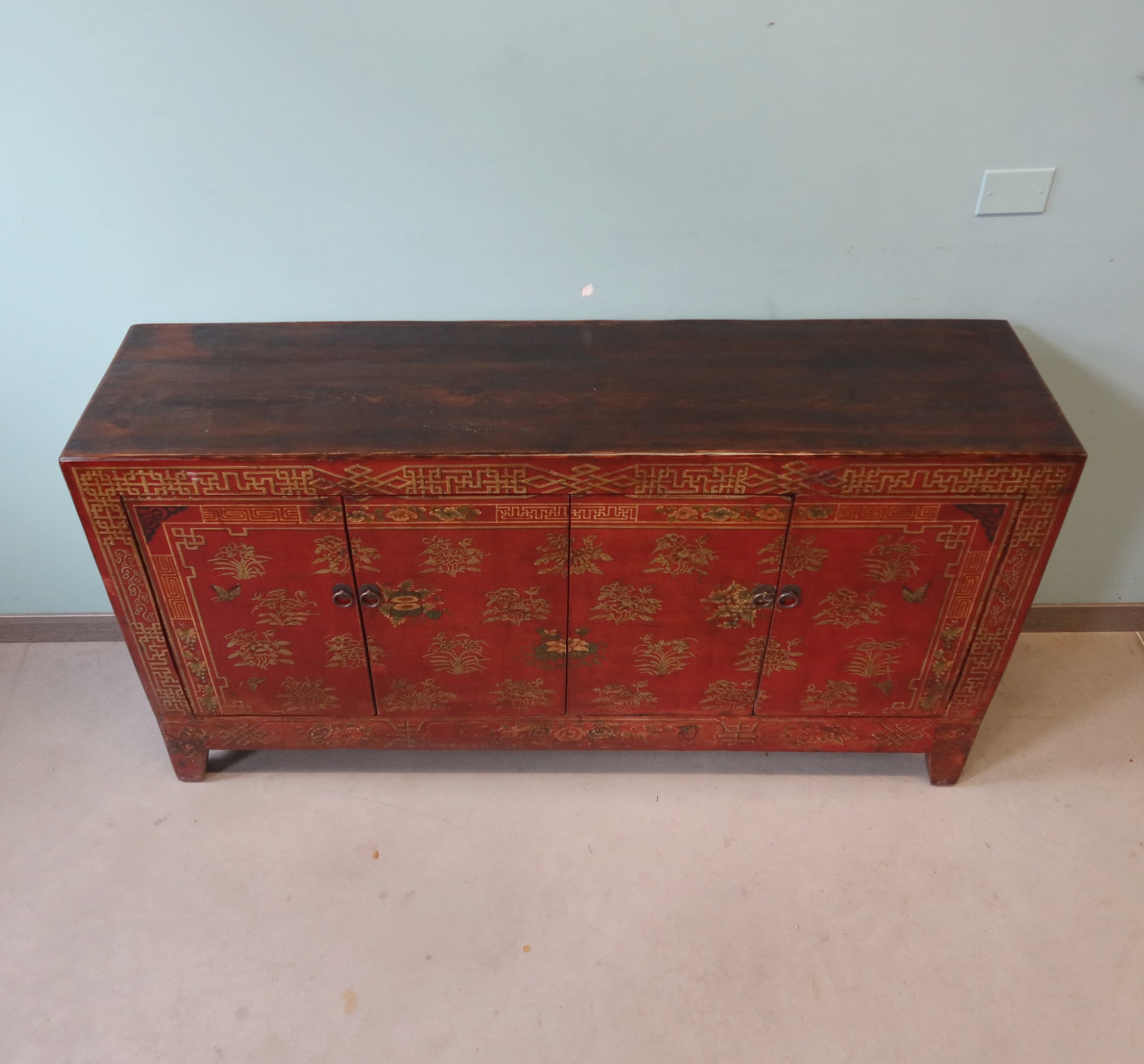 Mobile cinese in lacca rossa con fronte decorato da composizioni floreali inquadrate in quattro losanghe. Il grande unico vano di contenimento è chiuso da quattro ante. Provenienza regione di Dongbei.