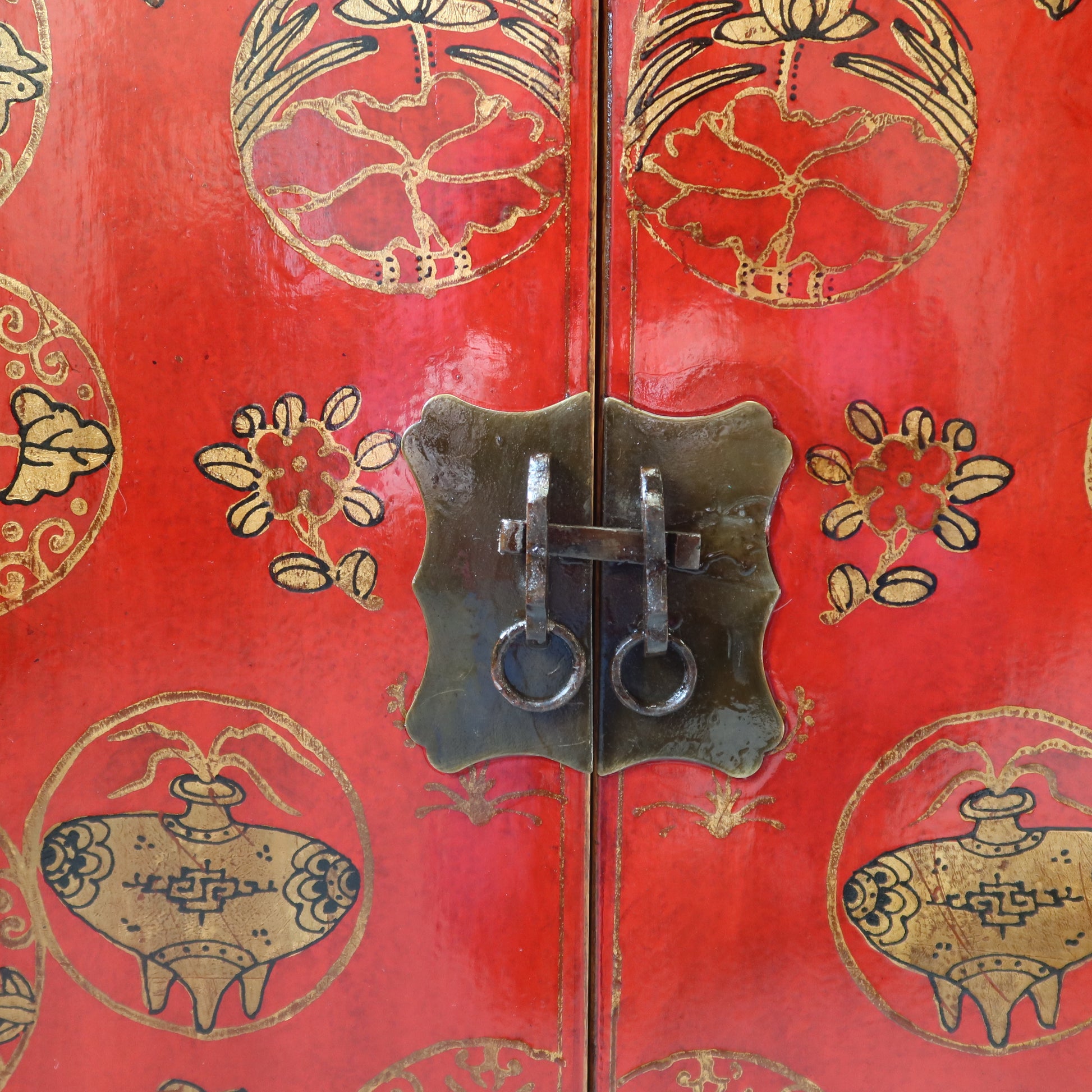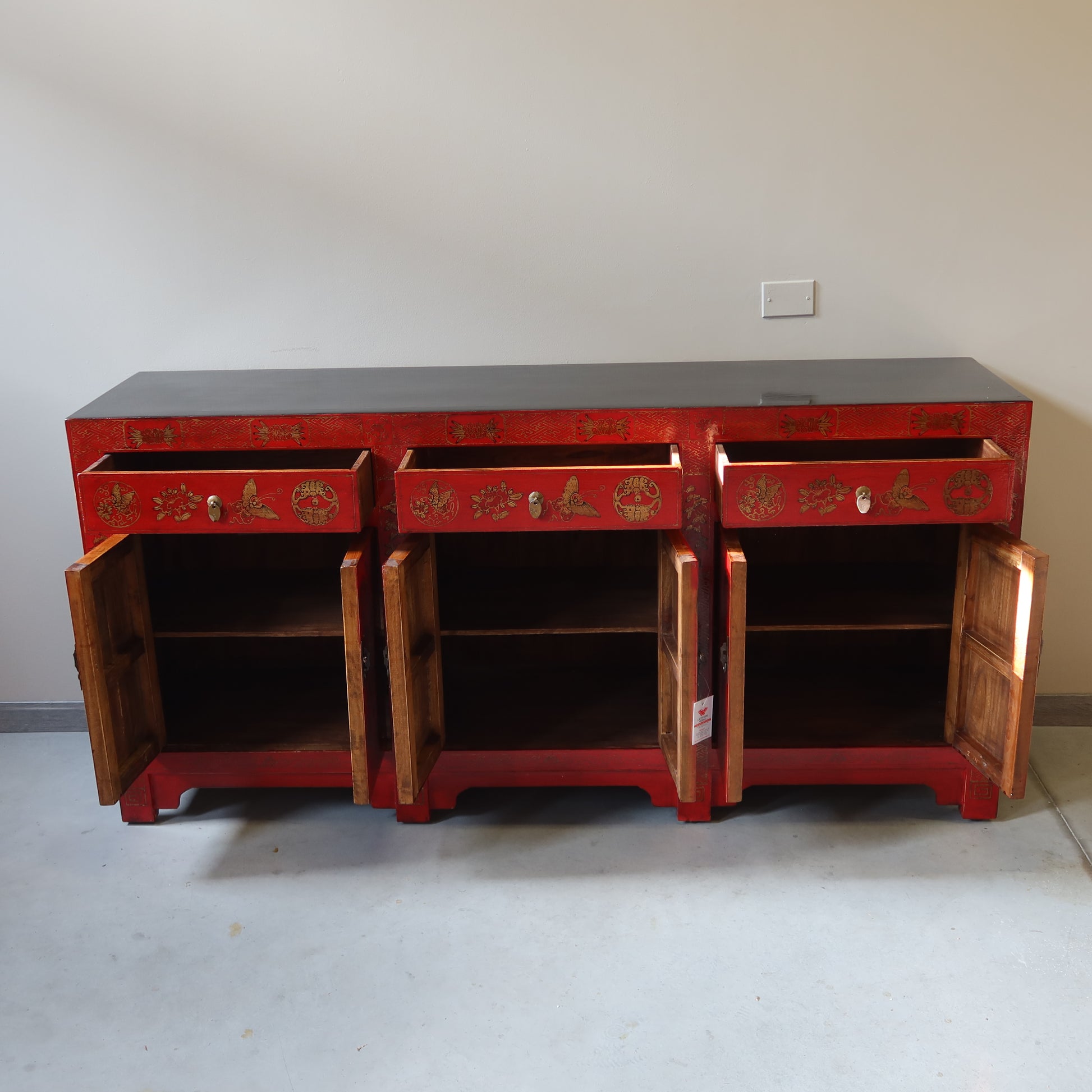 Credenza a 3 vani, chiusi da coppie di ante, e 3 lunghi cassetti, denominata "credenza tripla" anche per le 8 gambe che la fanno sembrare quasi un mobile costituito da 3 moduli. Il mobile è in lacca rossa con decoro caratteristico sul fronte. Ha stile ed eleganza tali da poter essere ambientato in ogni luogo importante della casa!