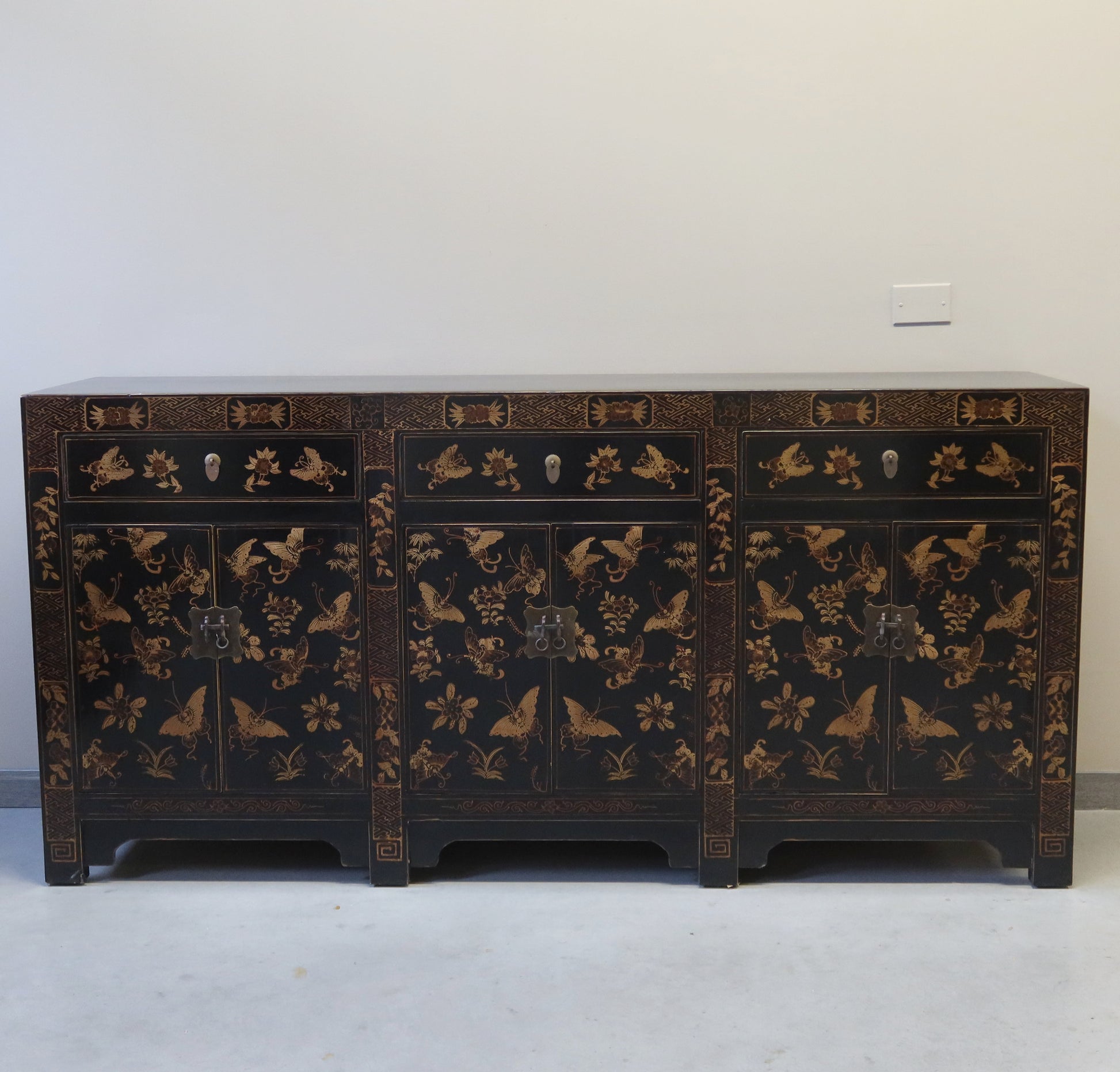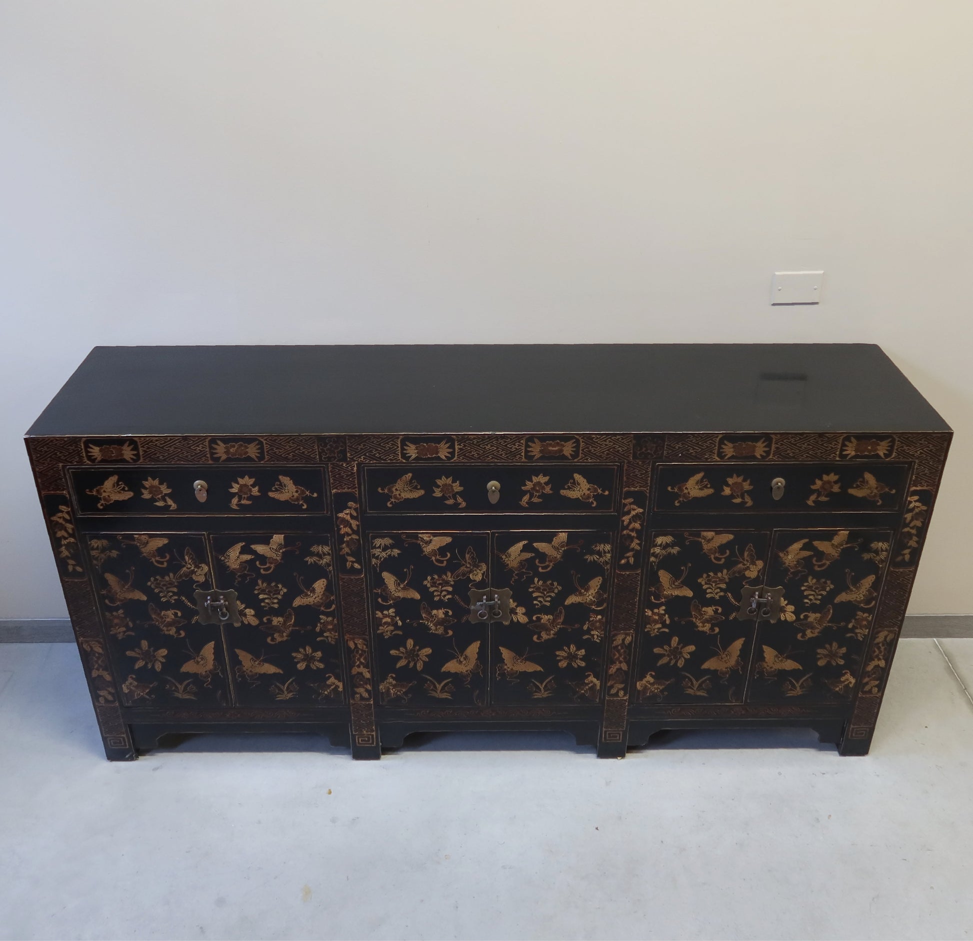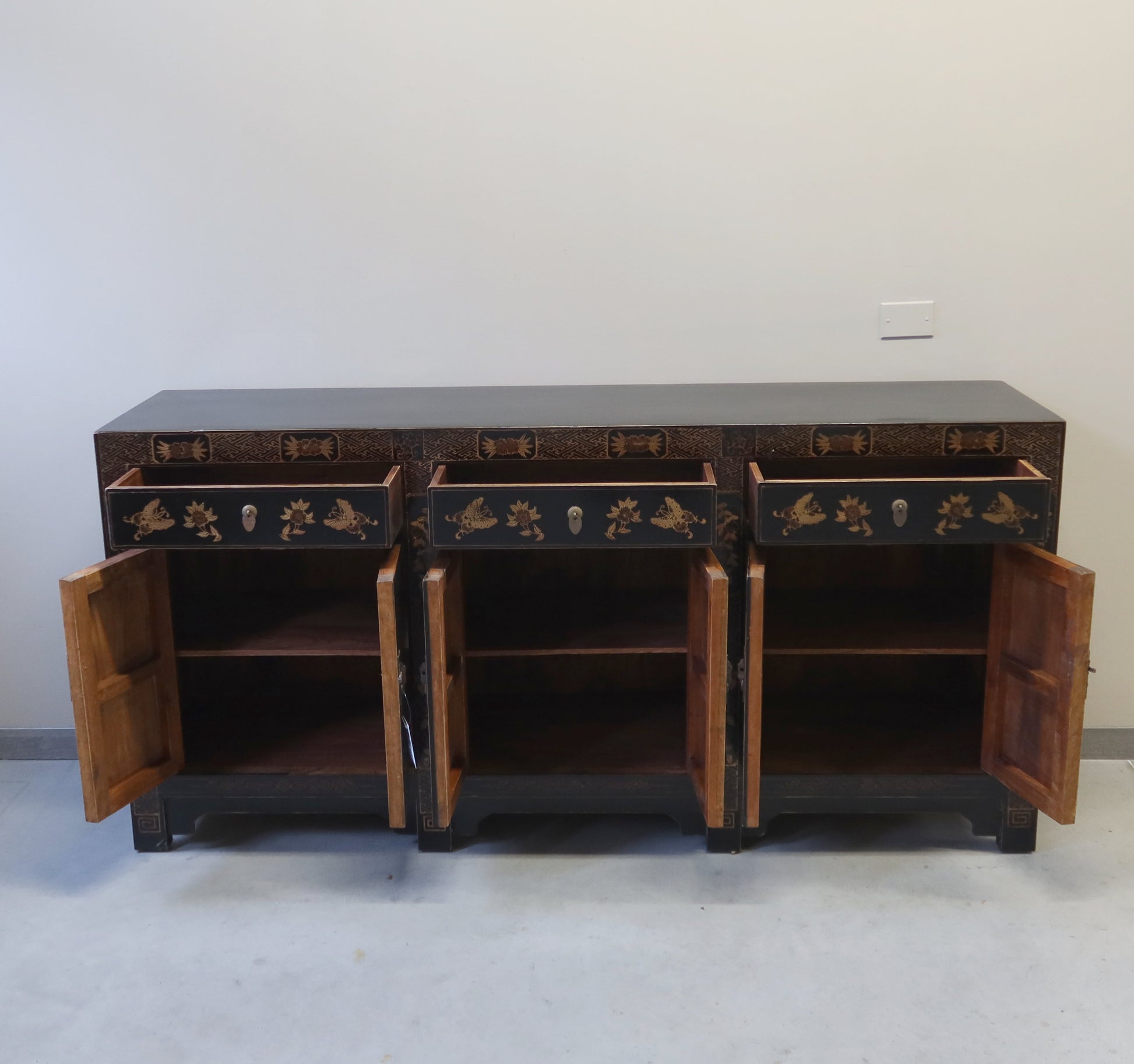 Credenza a 3 vani, chiusi da coppie di ante, e 3 lunghi cassetti, denominata "credenza tripla" anche per le 8 gambe che la fanno sembrare quasi un mobile costituito da 3 moduli. Il mobile è in lacca blu con decoro caratteristico sul fronte. Ha stile ed eleganza tali da poter essere ambientato in ogni luogo importante della casa!