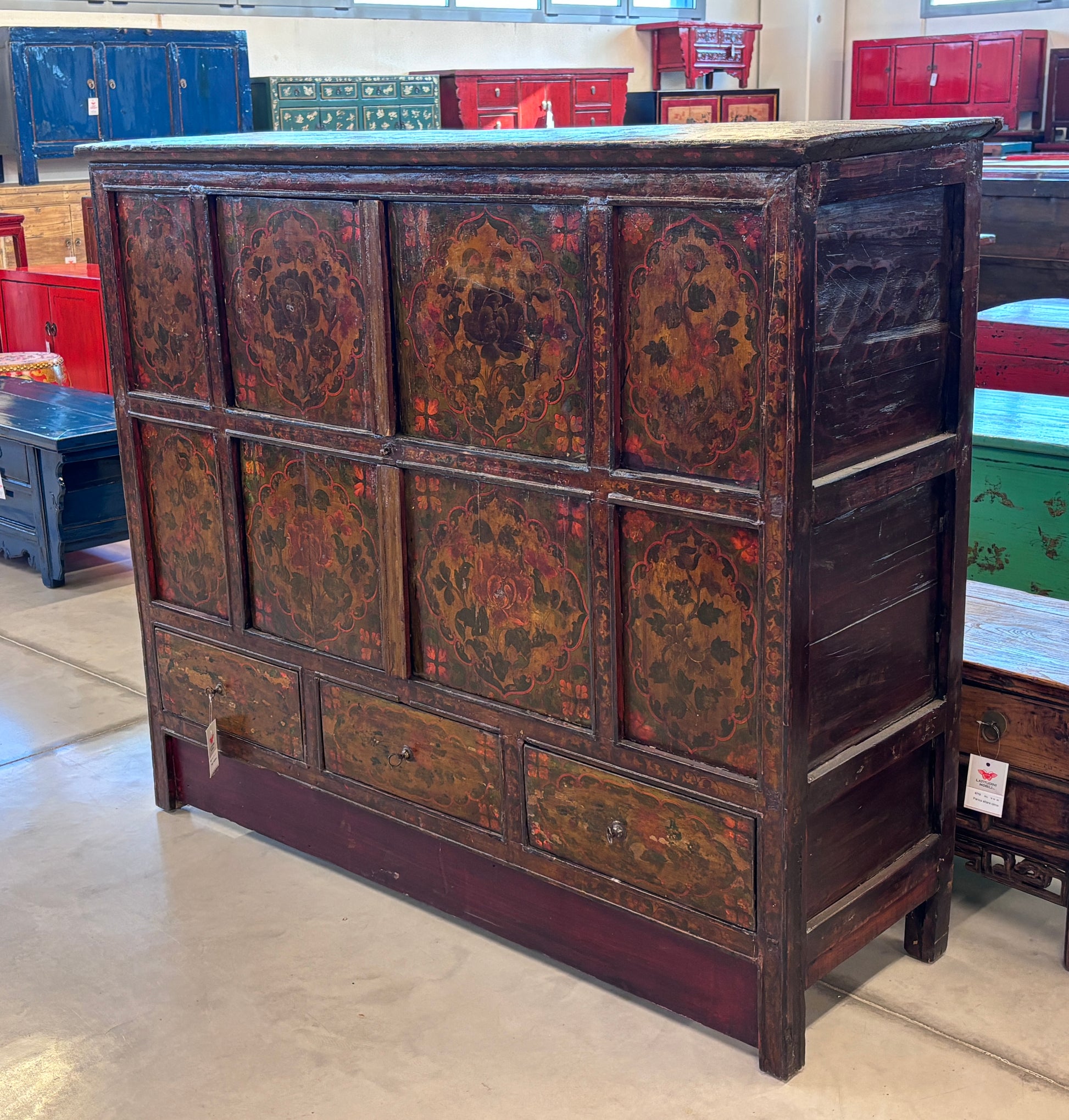 Credenza tibetana con fronte a 8 formelle, di cui le 4 centrali apribili, e una fascia inferiore di 3 cassetti. il decoro delle formelle è a tema floreale giocato su una calda tavolozza di colori.