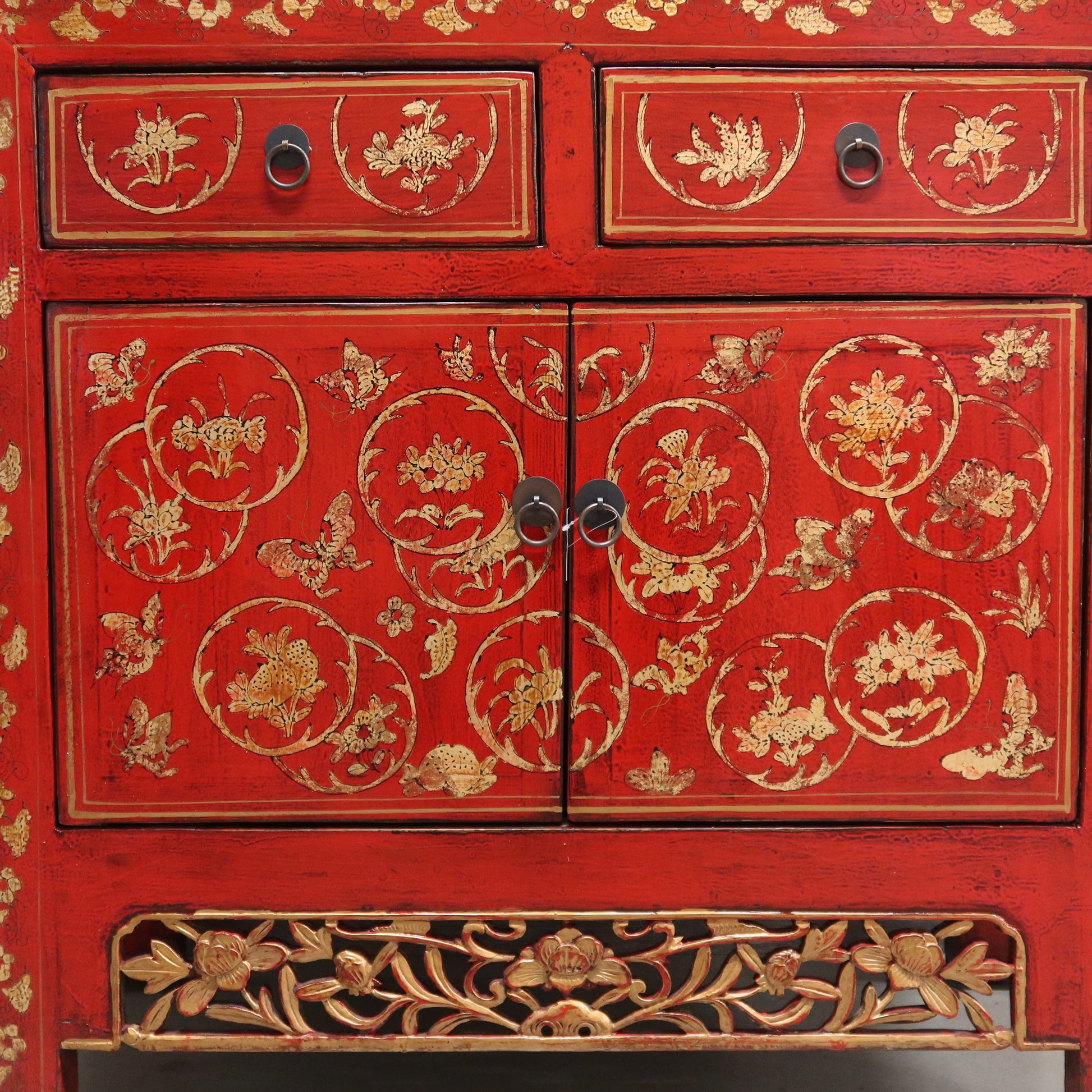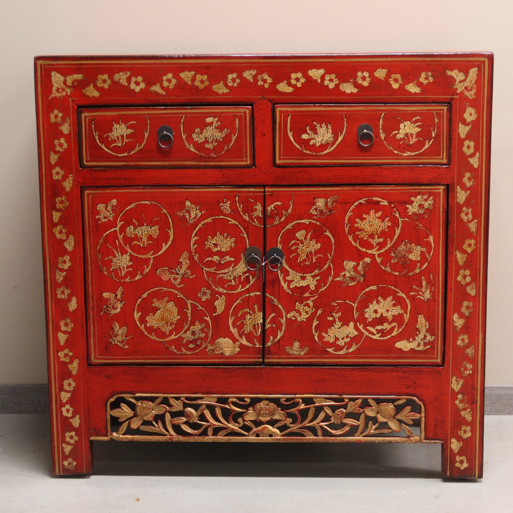 Credenzina in lacca rossa con decori dorati e fregio finemente intagliato di raccordo tra le gambe. Provenienza regione dello Shanxi.