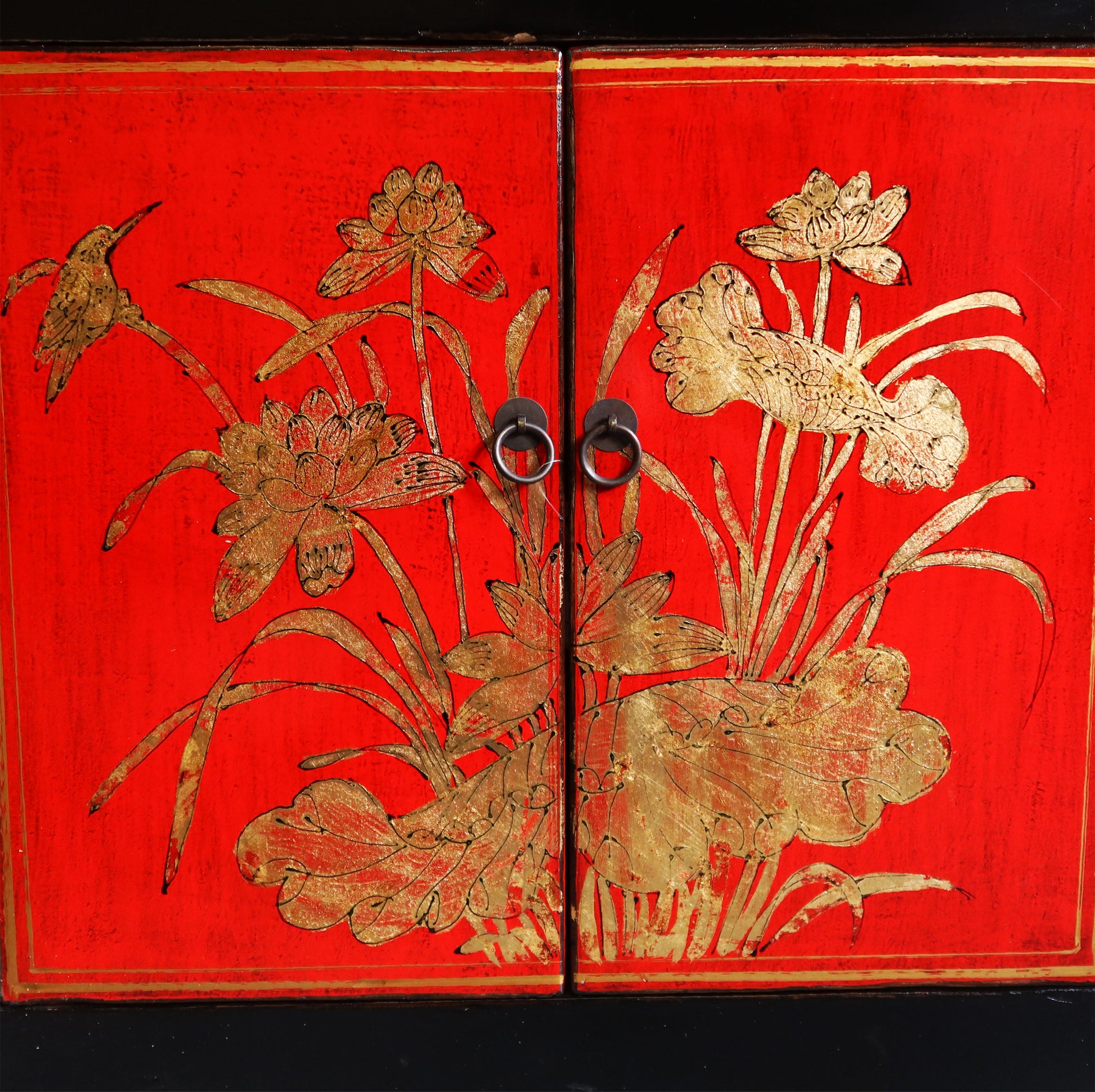 Corta credenza a 2 ante con fascia di cassetti superiori in lacca decorata da caratteristici motivi della regione dello Shanxi.