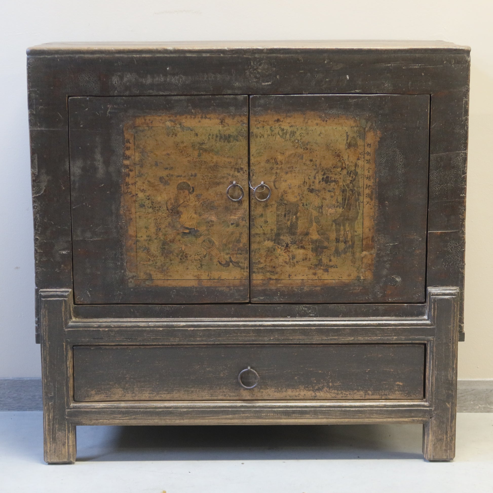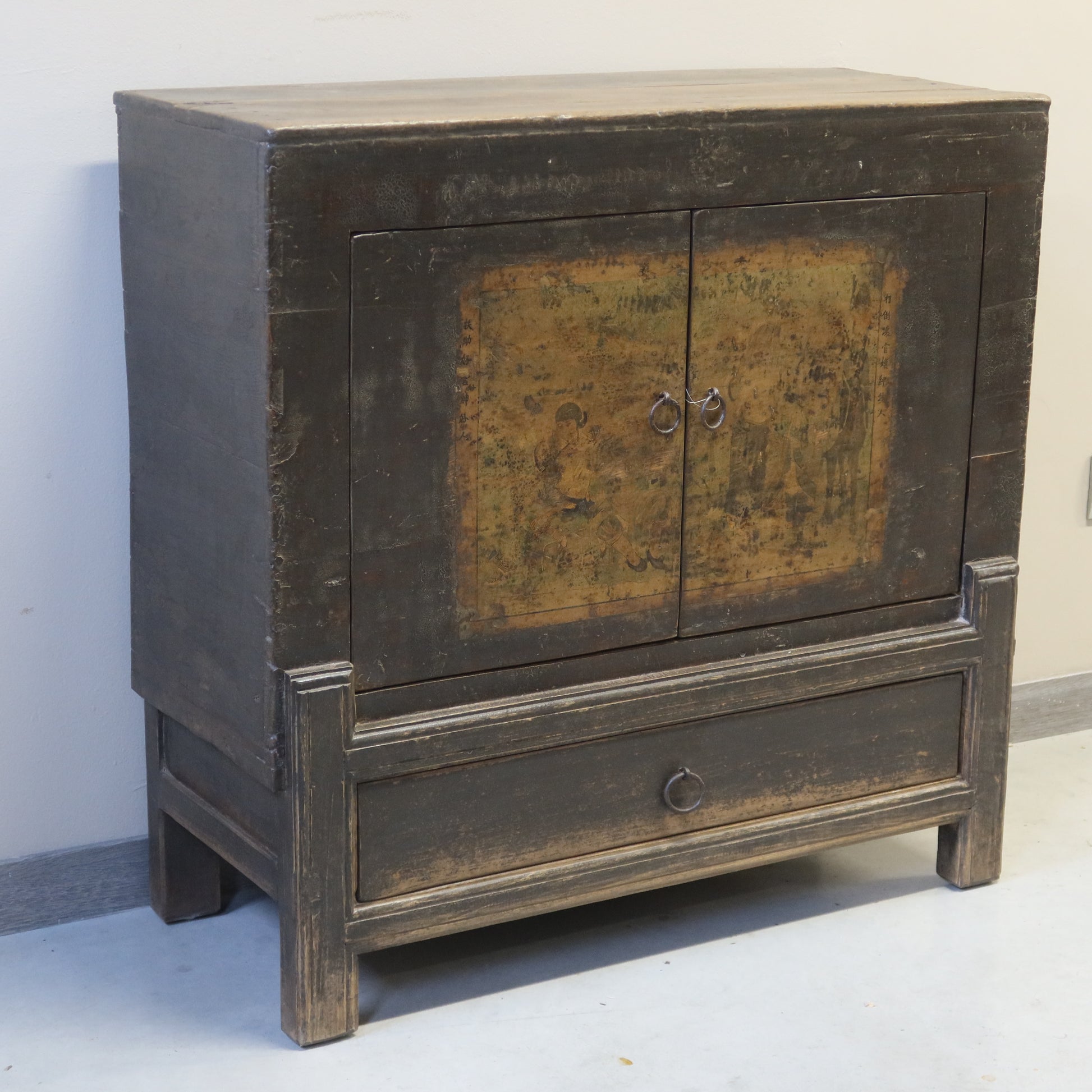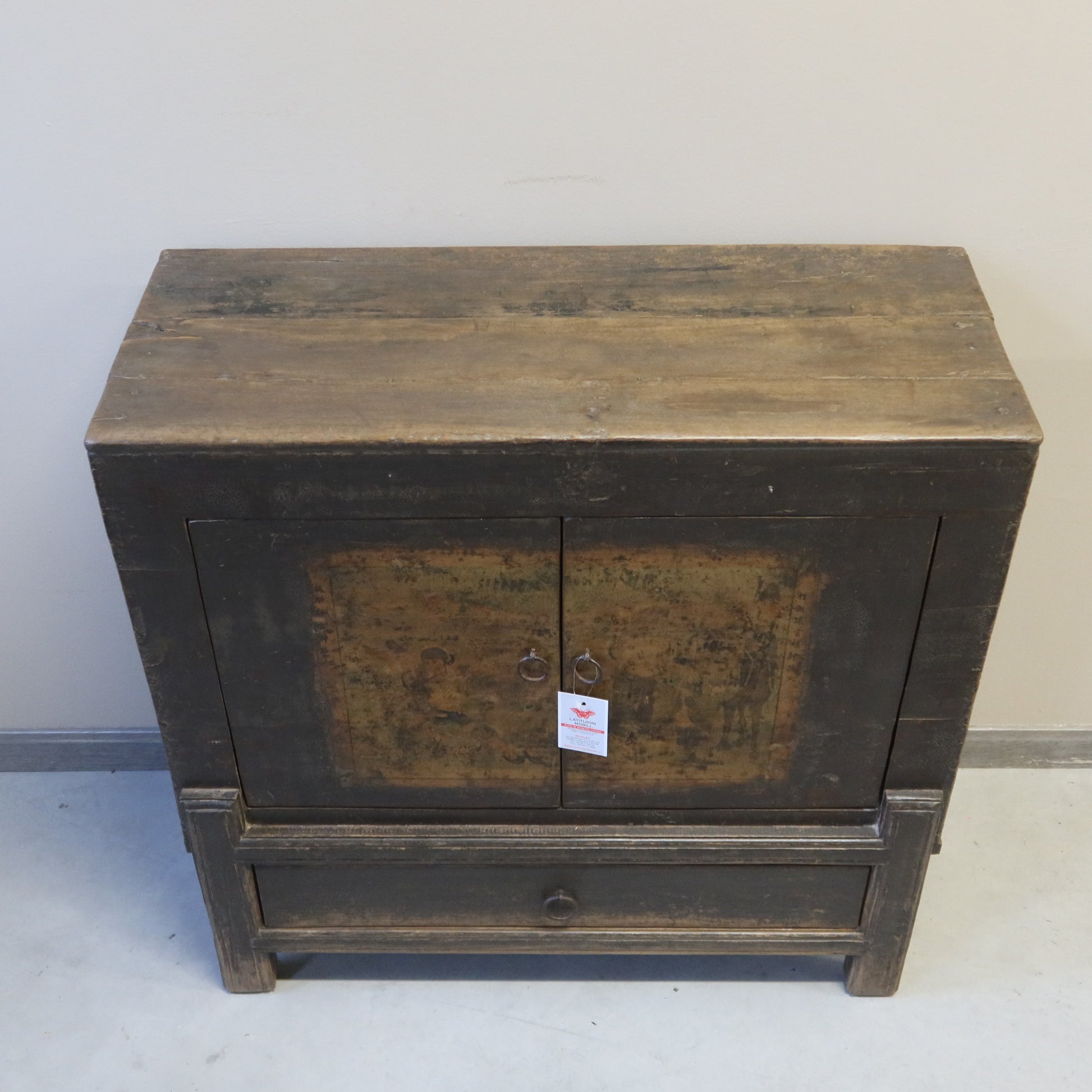 Questo mobile orientale presenta sulle ante una garbata decorazione lieve. La caratteristica costruttiva è quella delle gambe rientranti, il che rende questo pezzo unico fra i mobiletti etnici antichi decorati.