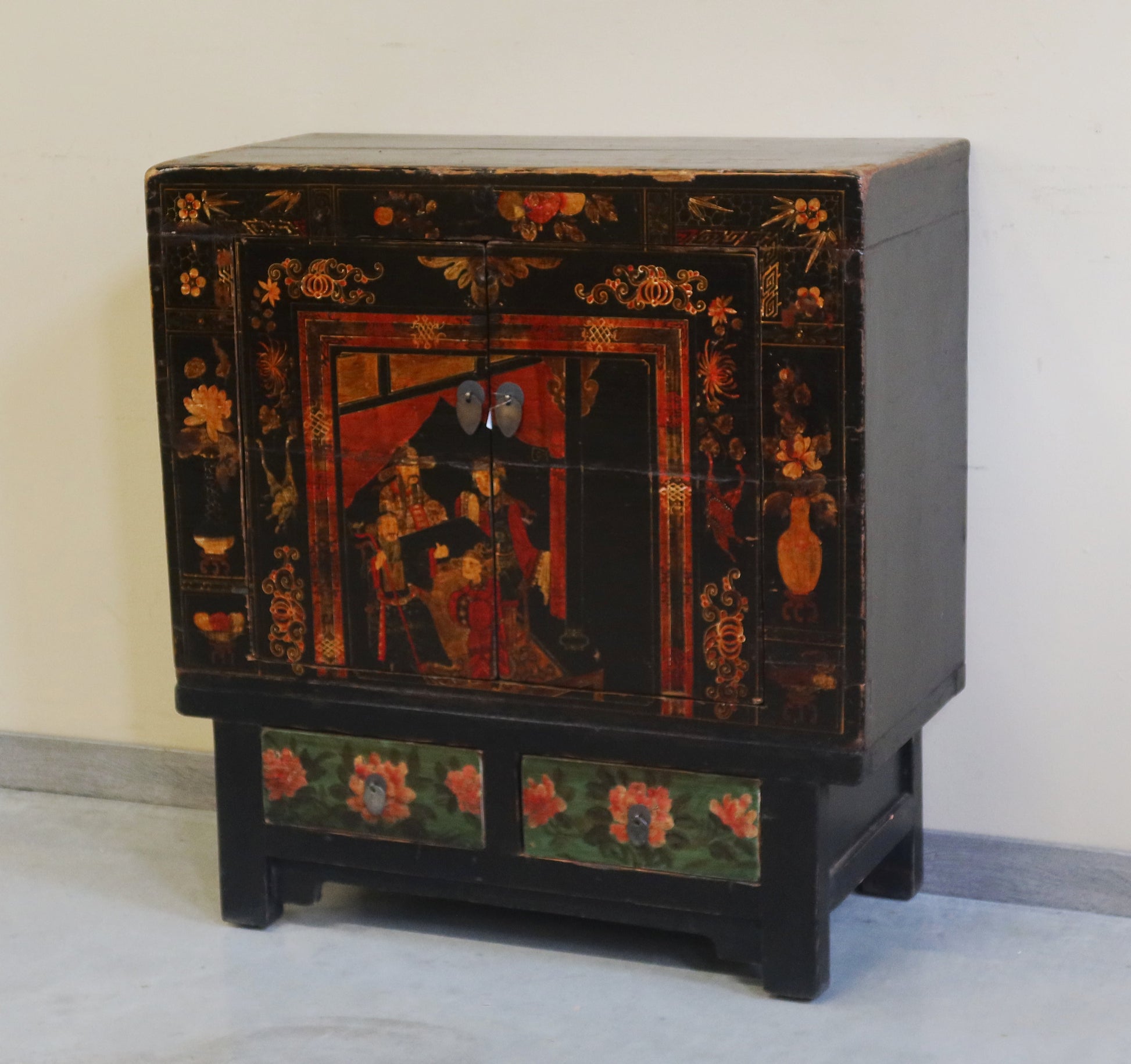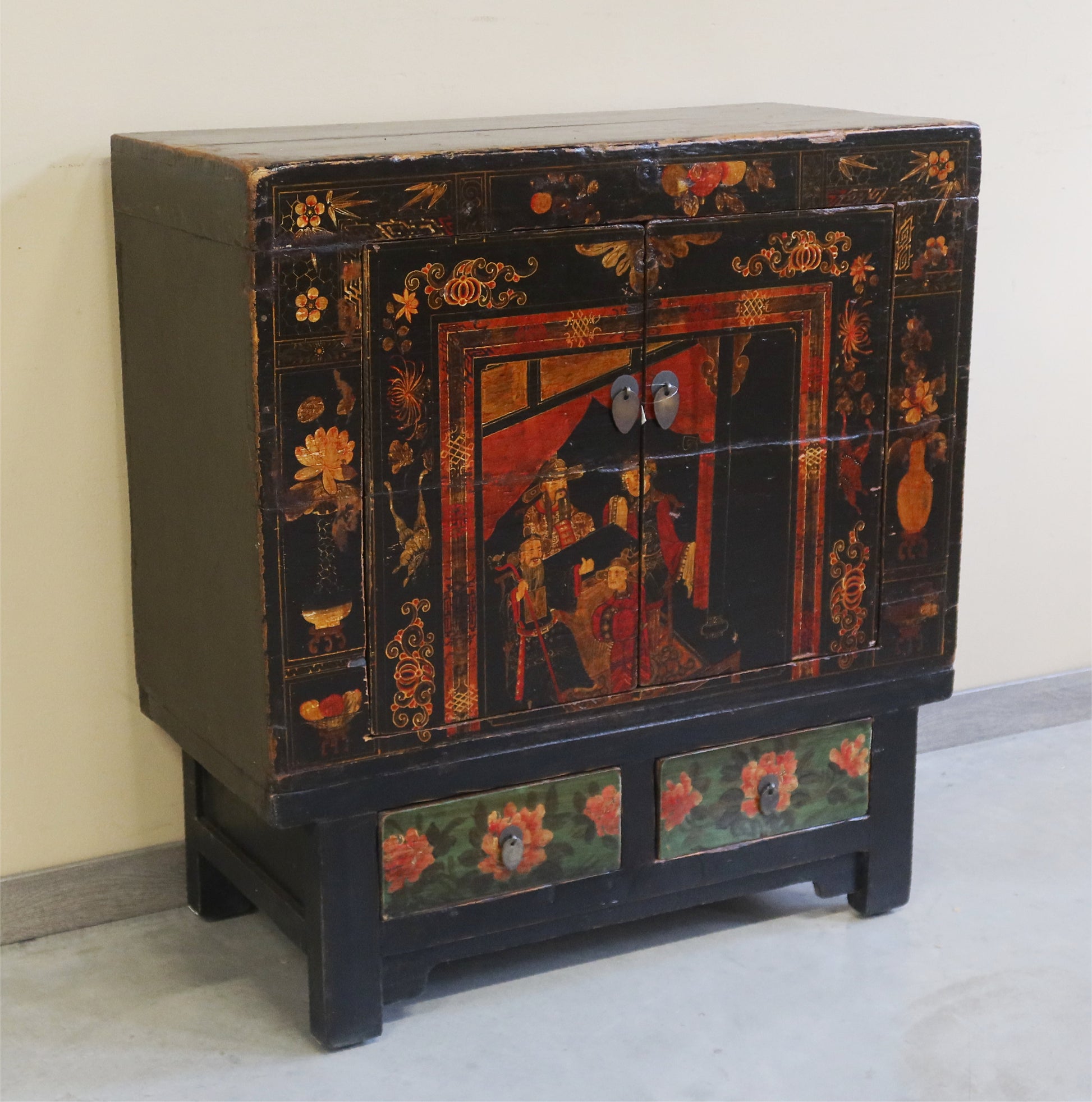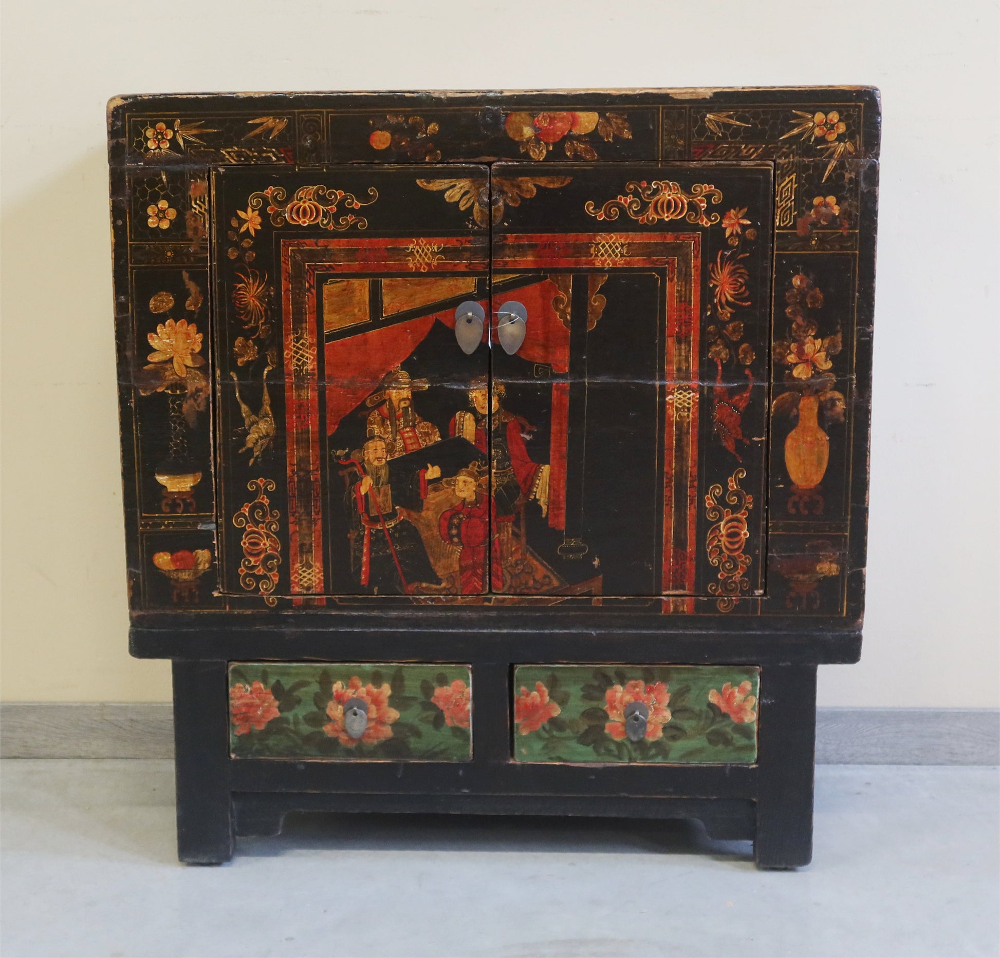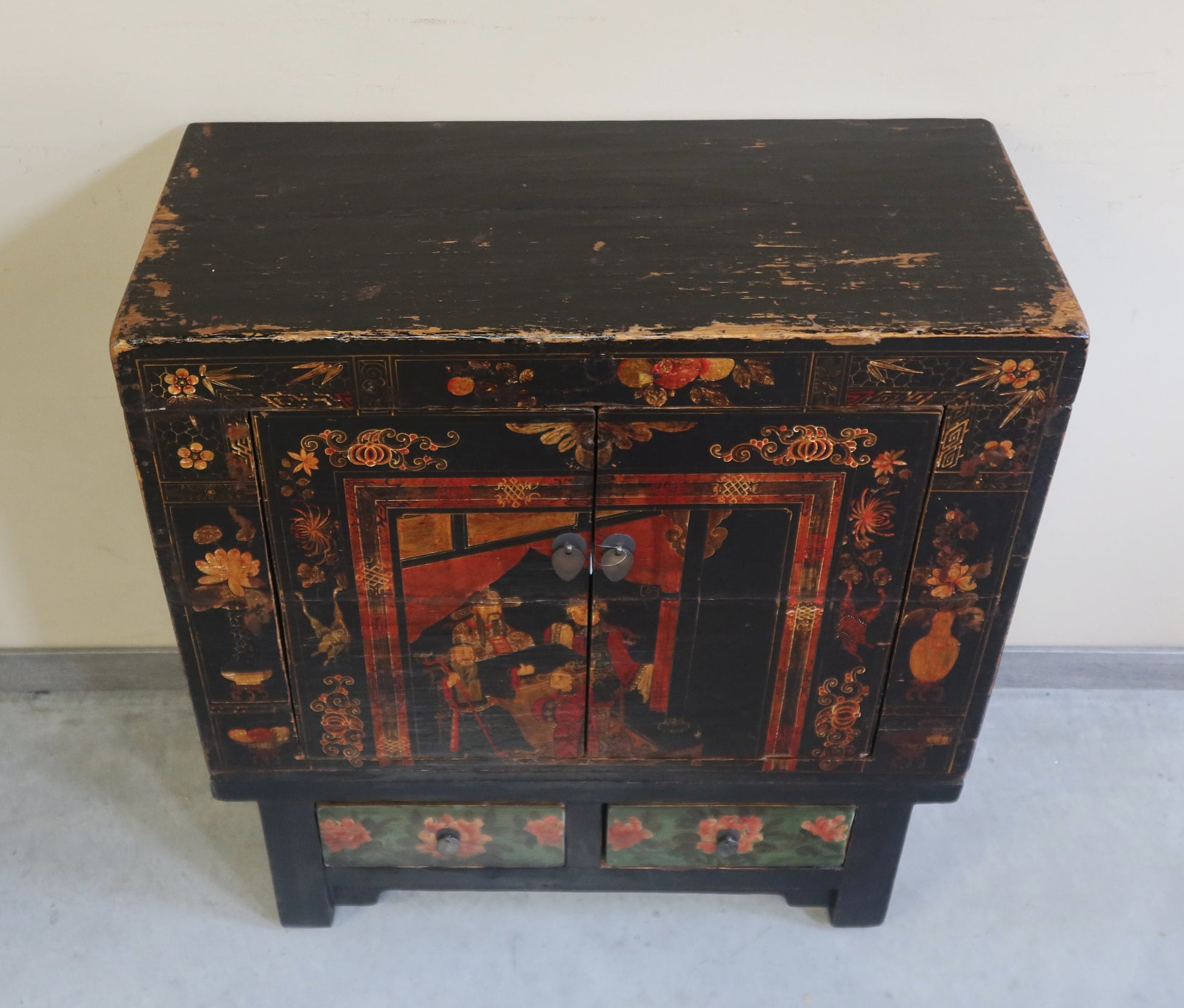Questo mobile orientale presenta sulle ante una decorazione scene di vita. La caratteristica costruttiva è quella delle gambe rientranti, il che rende questo pezzo unico fra i mobiletti etnici antichi decorati.