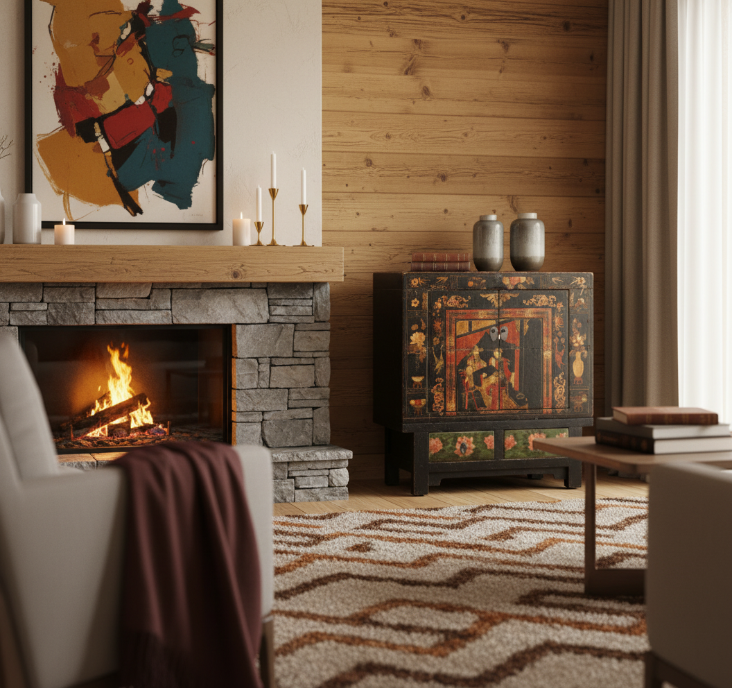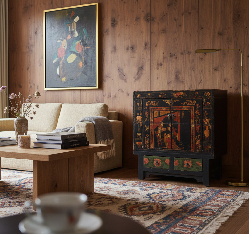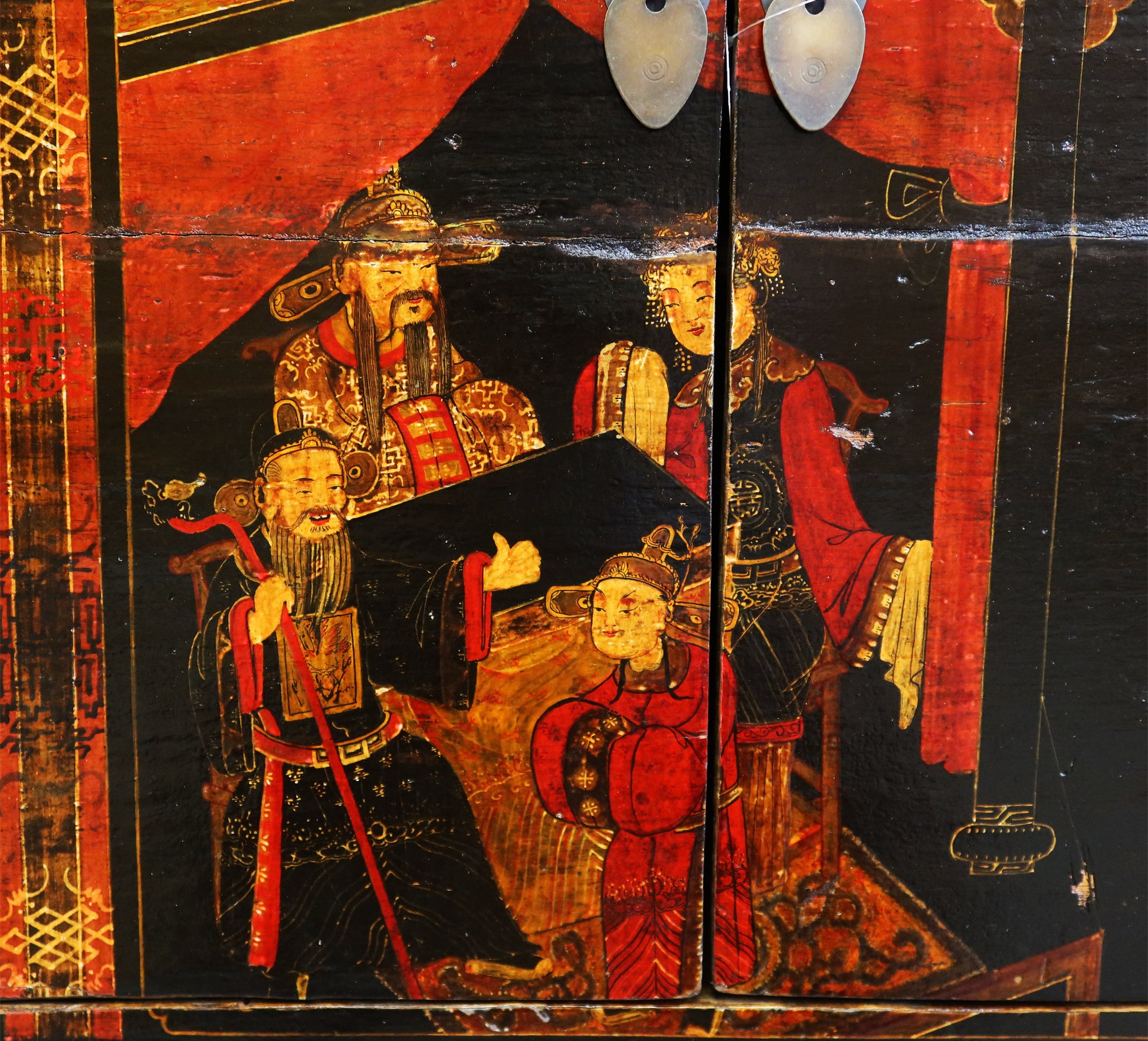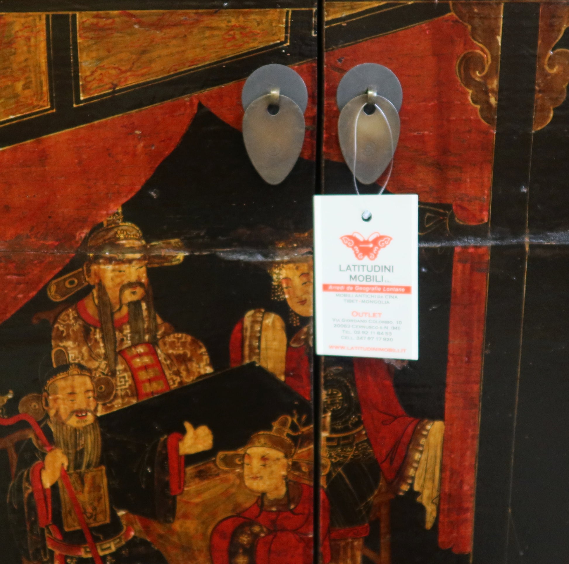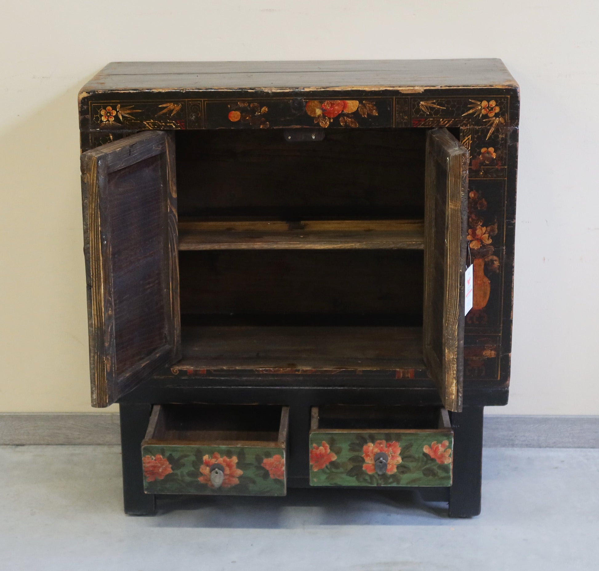 Questo mobile orientale presenta sulle ante una decorazione scene di vita. La caratteristica costruttiva è quella delle gambe rientranti, il che rende questo pezzo unico fra i mobiletti etnici antichi decorati.