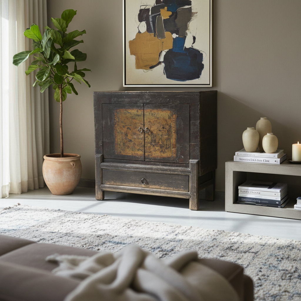 Questo mobile orientale presenta sulle ante una garbata decorazione lieve. La caratteristica costruttiva è quella delle gambe rientranti, il che rende questo pezzo unico fra i mobiletti etnici antichi decorati. Il tema decorativo, ancora leggibile benché in parte consunto dal tempo, è una scena della vita quotidiana di corte al termine dell’impero cinese. Si intuiscono sagome e movimenti, come se la scena fosse stata “assorbita” dal tempo.