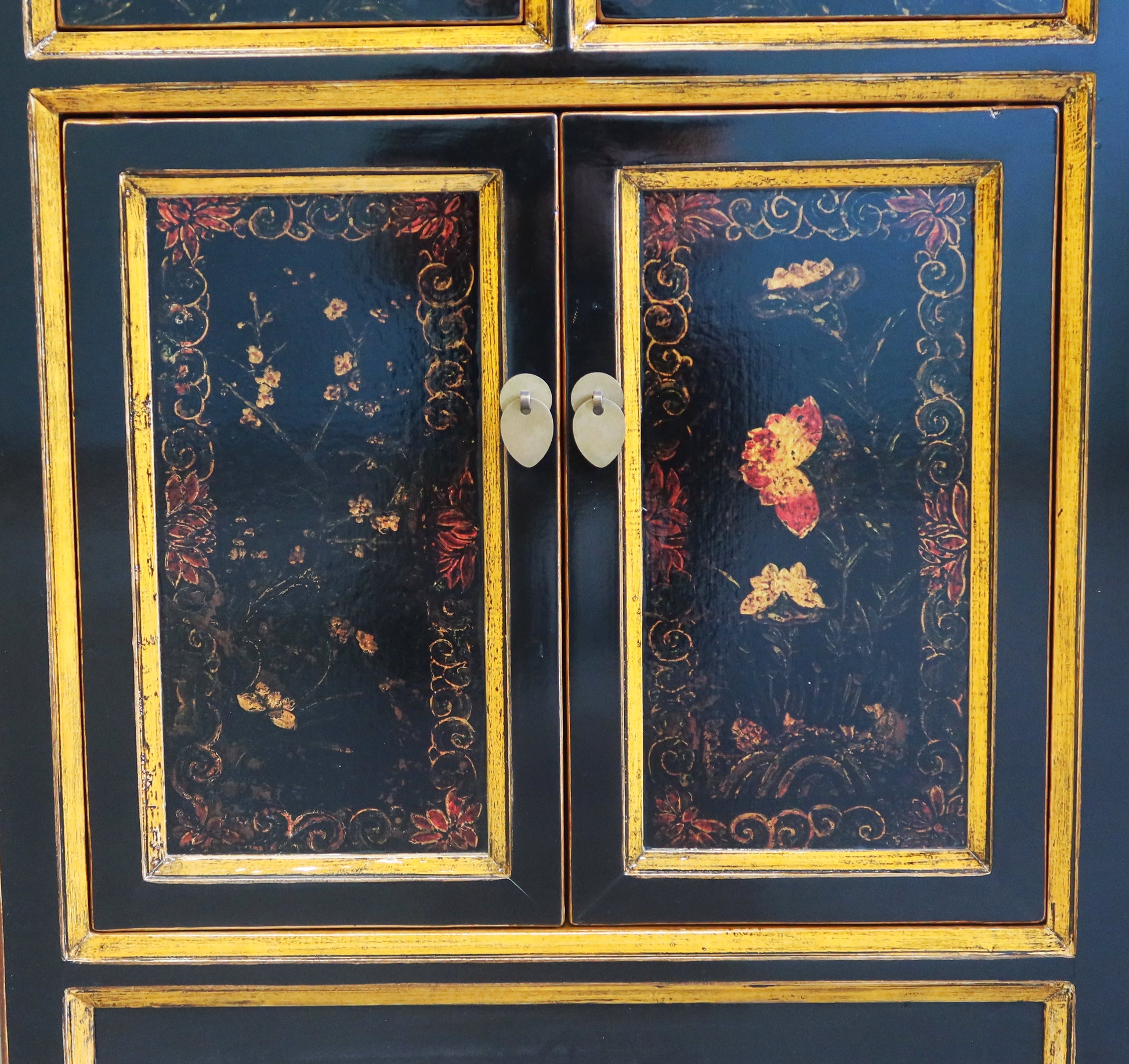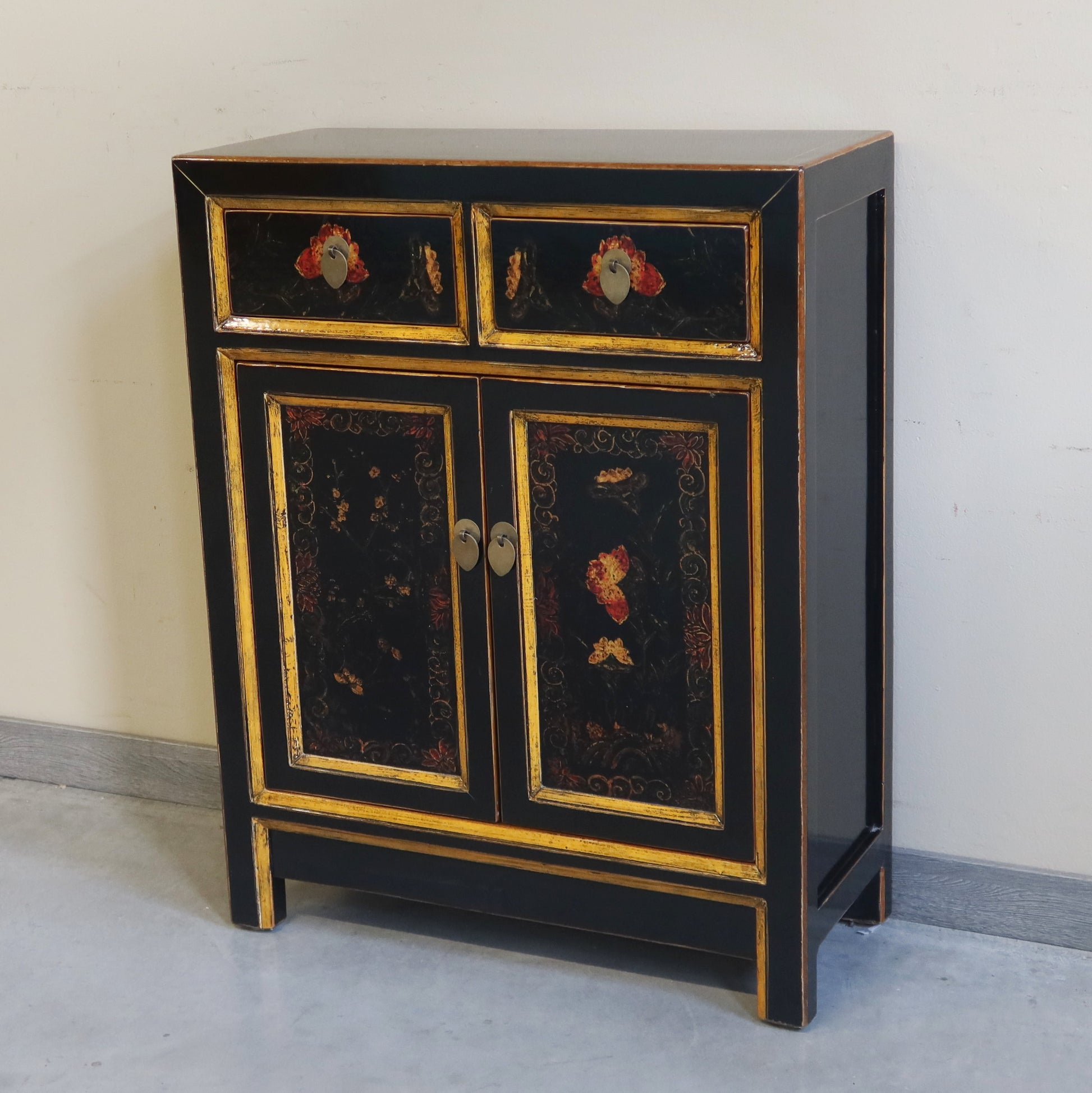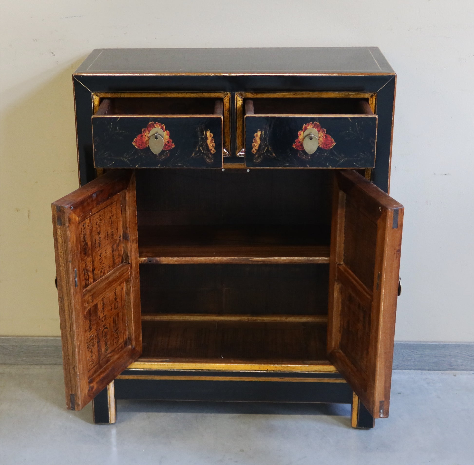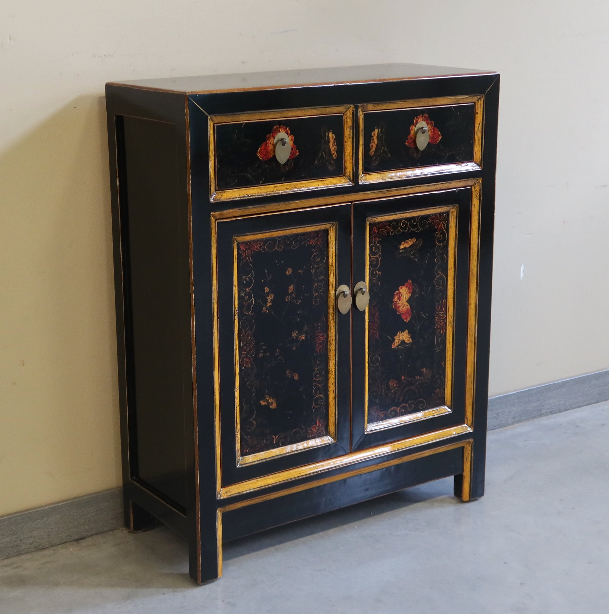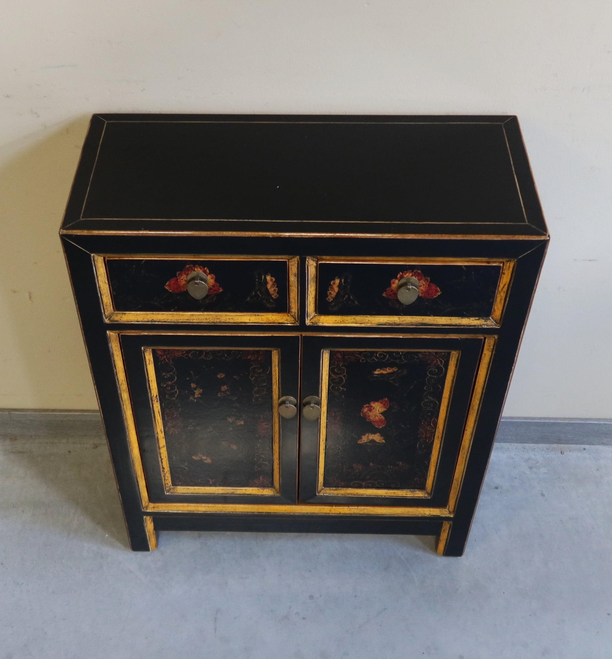 Mobiletto Mongolia in lacca decorata con due cassetti e due ante con caratteristico decoro. La provenienza è la regione della Mongolia Interna Cinese. Le dimensioni contenute rendono questo mobiletto orientale adatto ad agni ambiente della casa dove si vuole dare un'impronta di arredamento etnico di qualità.