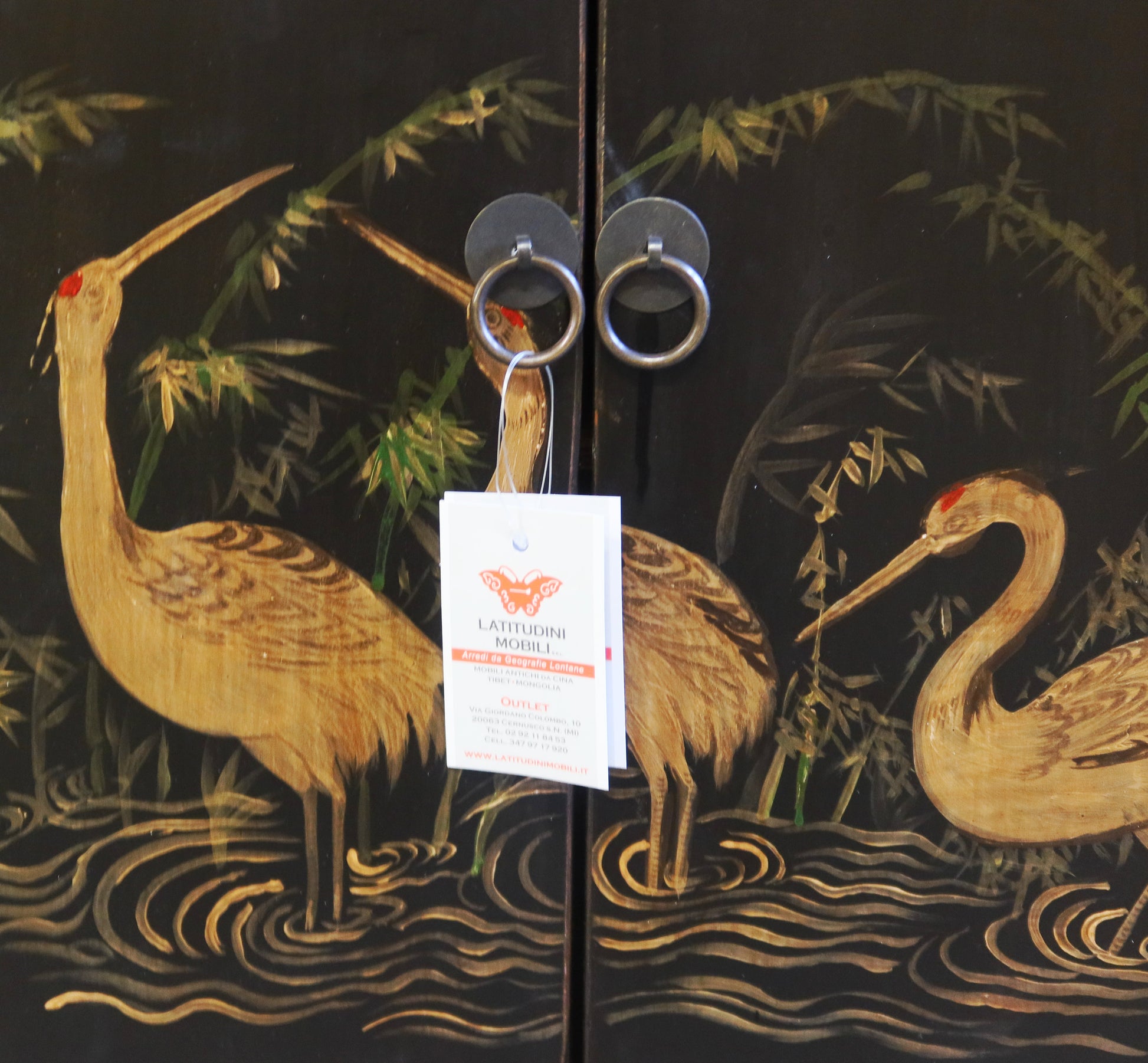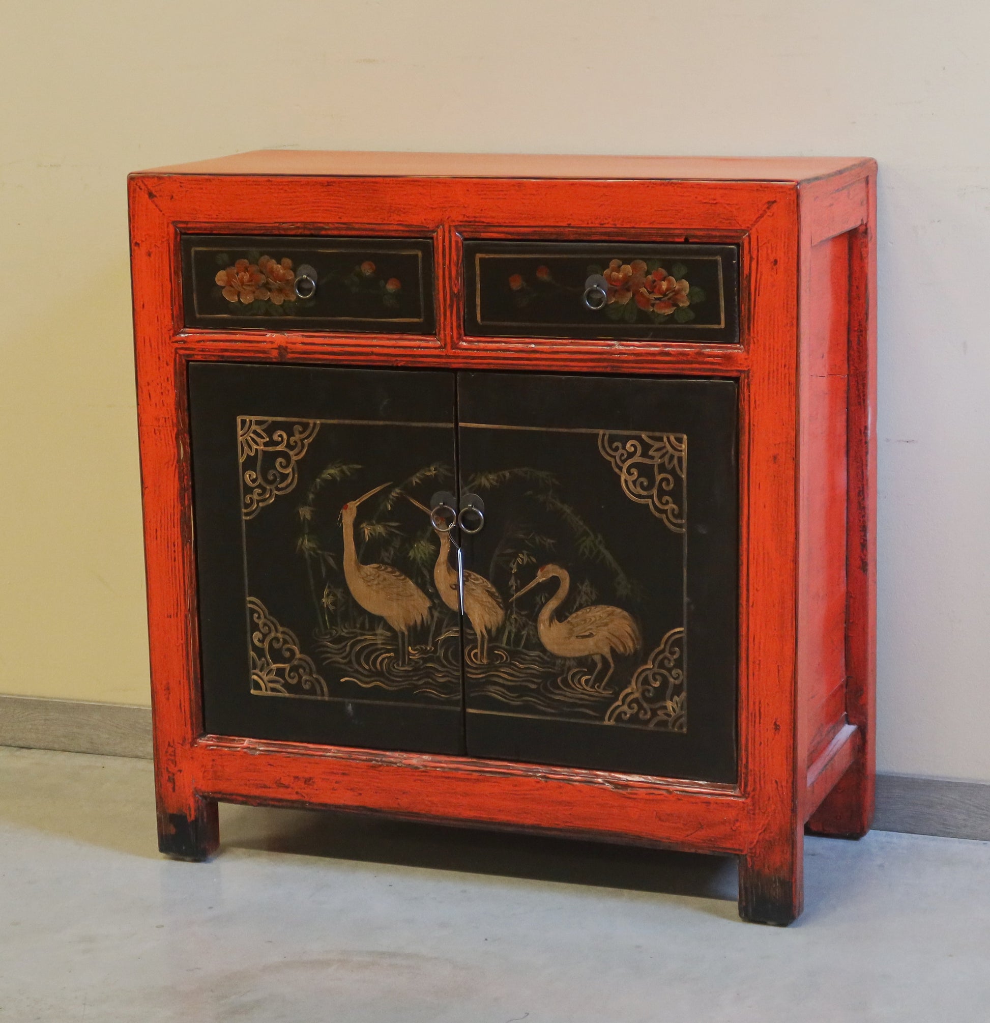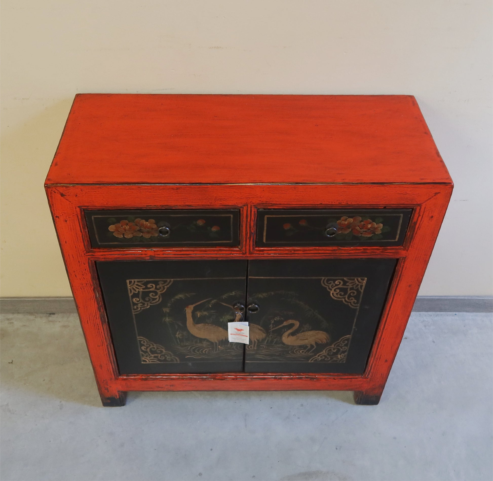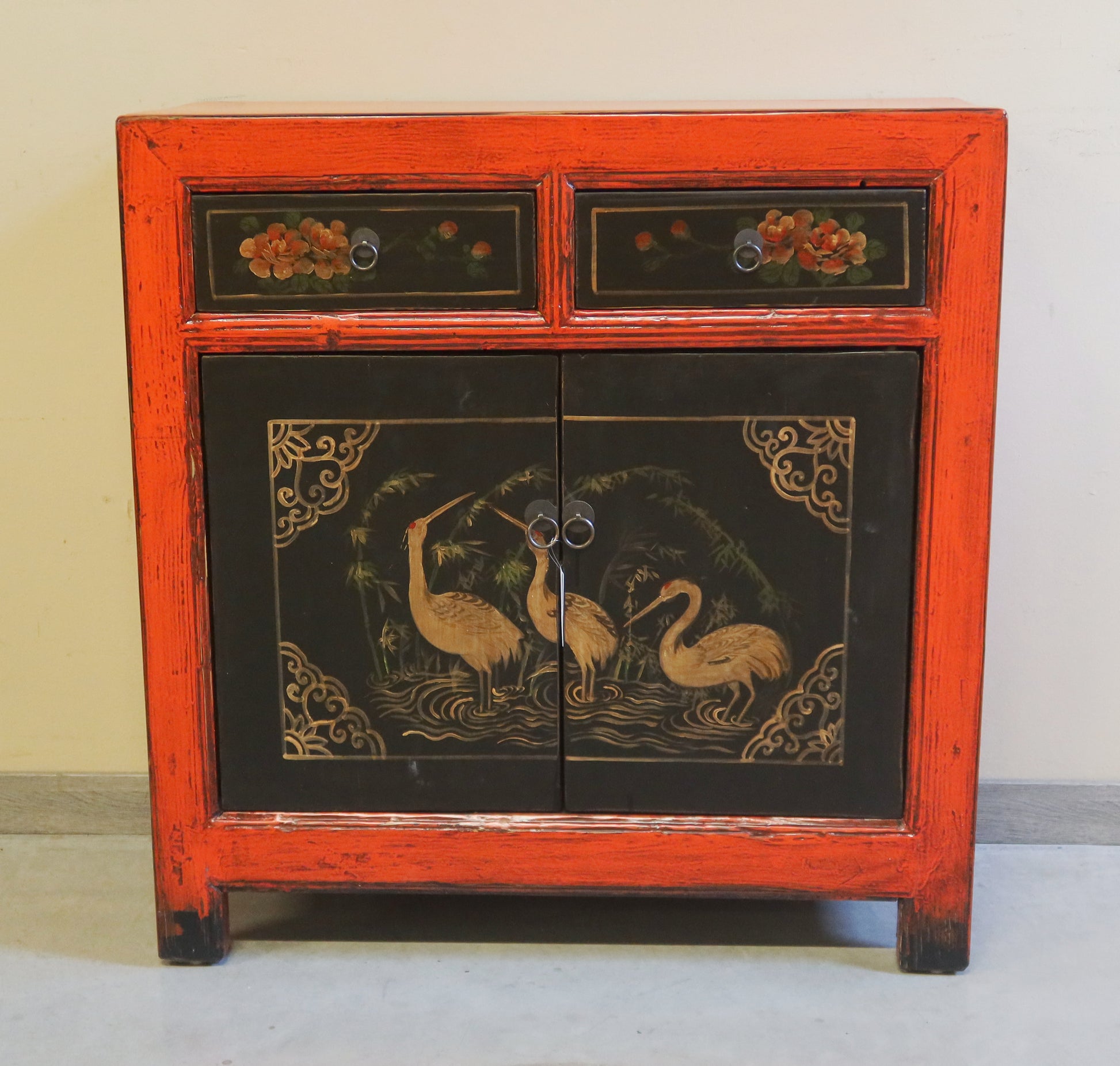 Credenzino ad un vano chiuso da doppia anta e due cassetti, con struttura in lacca aramncio caratterizzato da un bel decoro vivace di gru, uccelli eleganti con collo slanciato, dipinti in toni chiari su fondo nero. Ricordiamo che nella cultura cinese la gru rappresenta longevità, pace e prosperità.