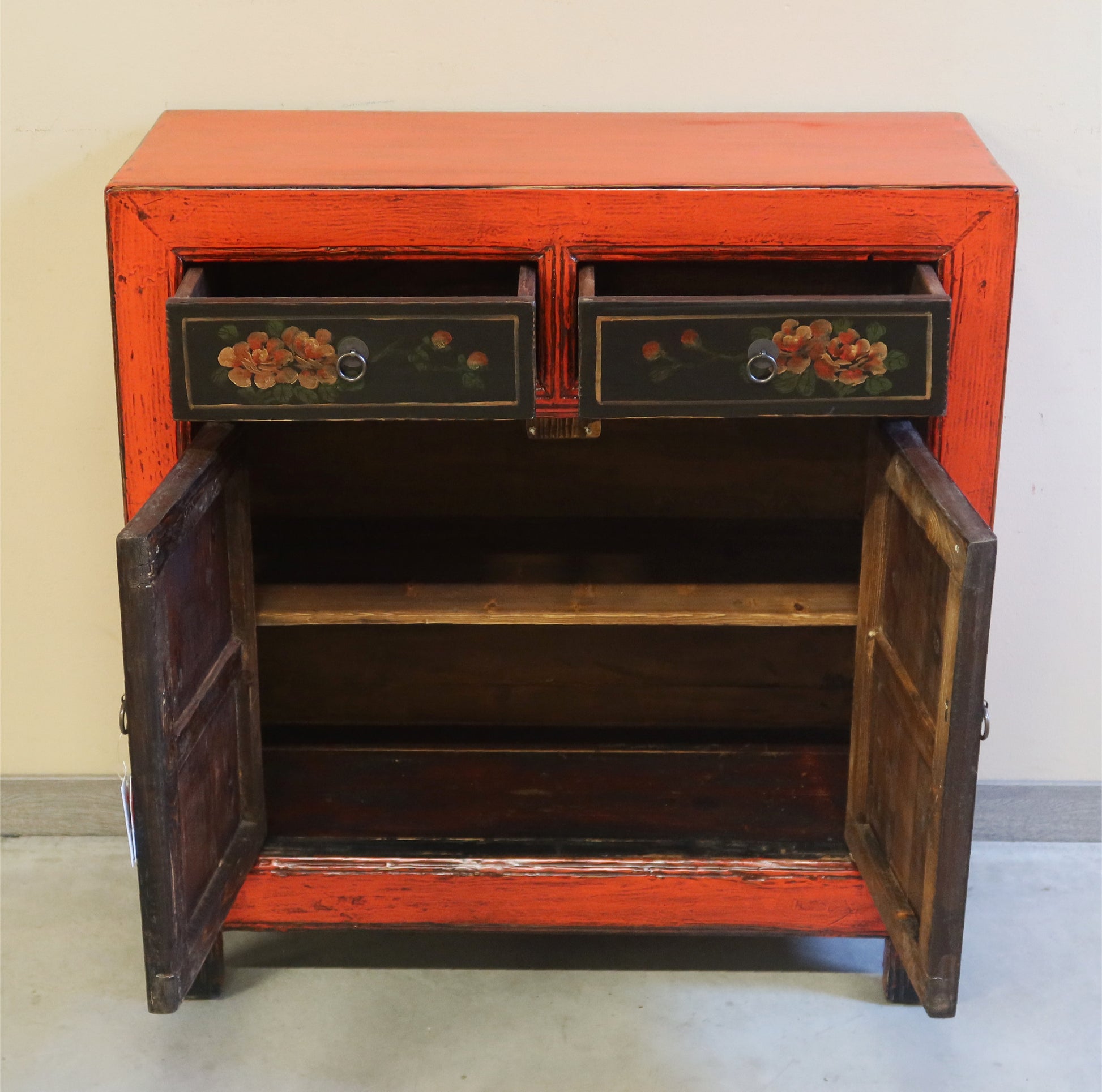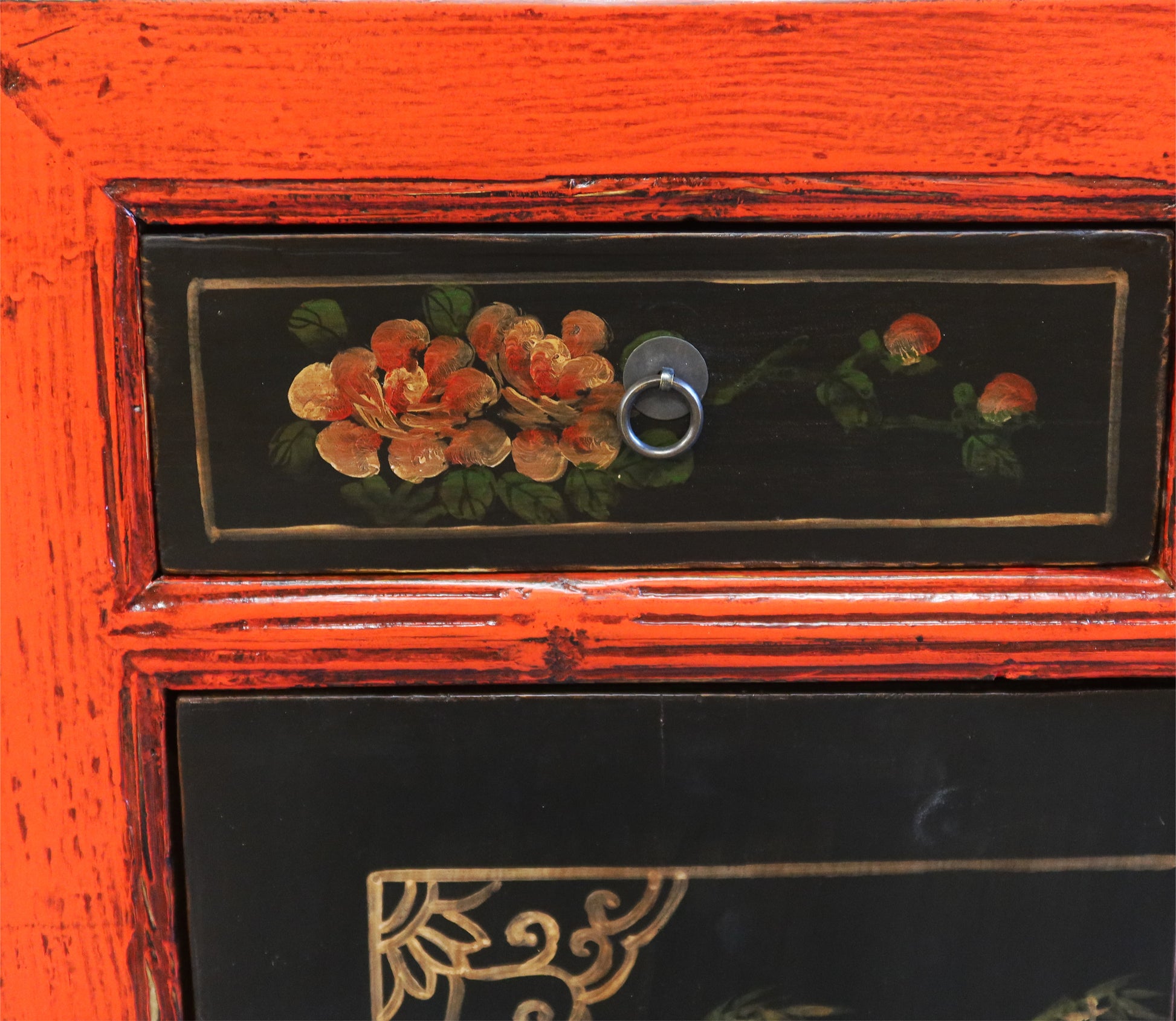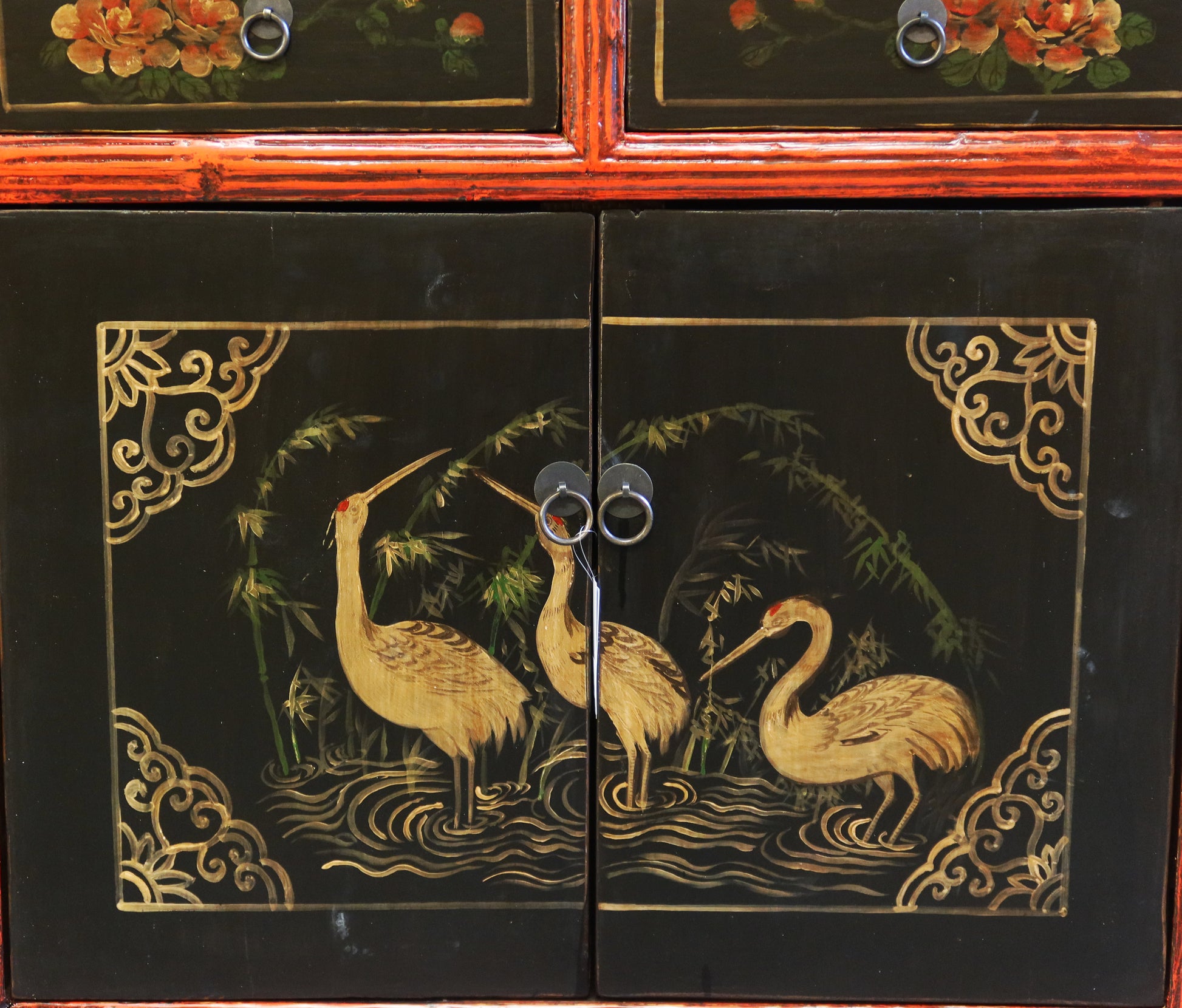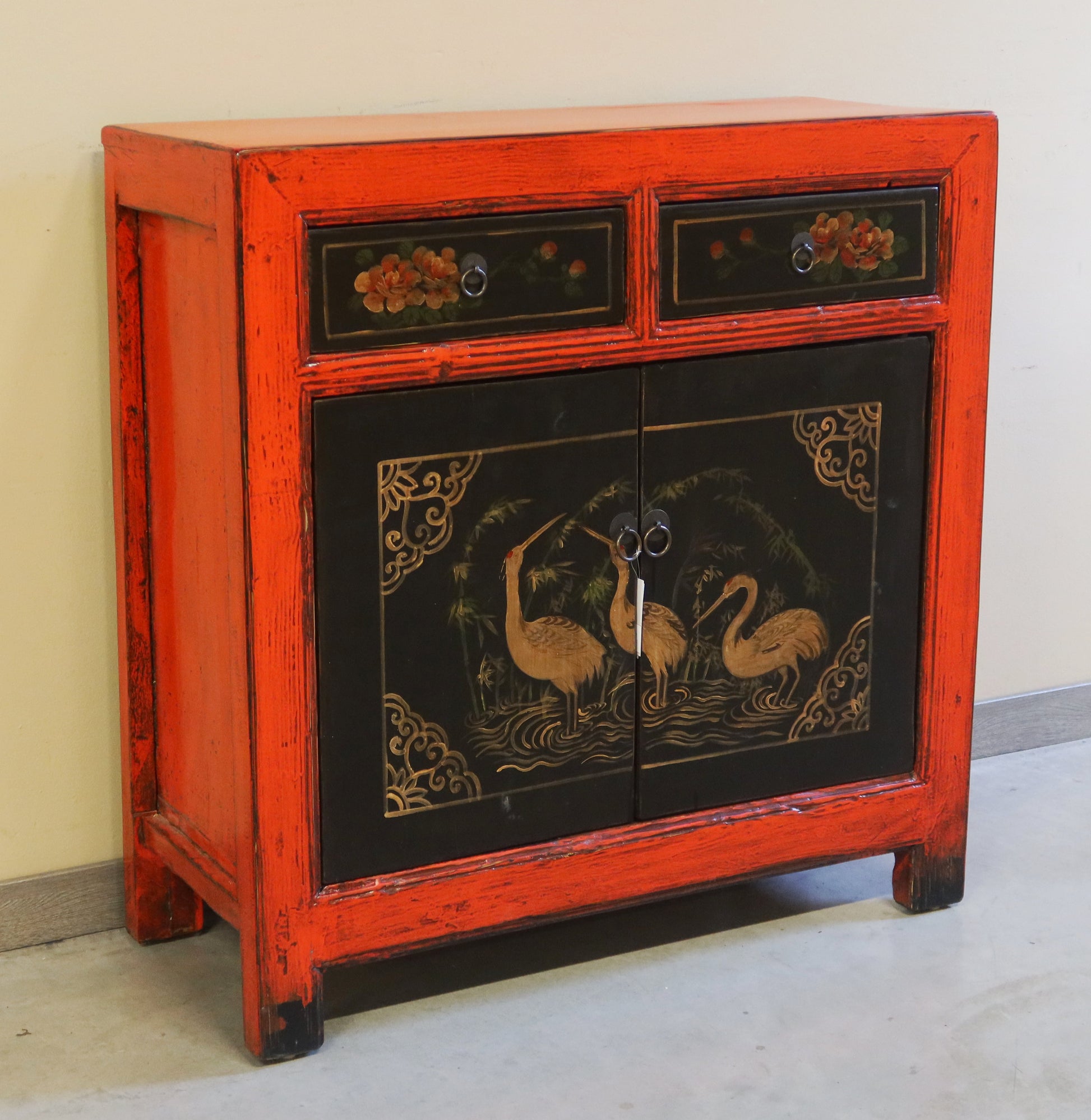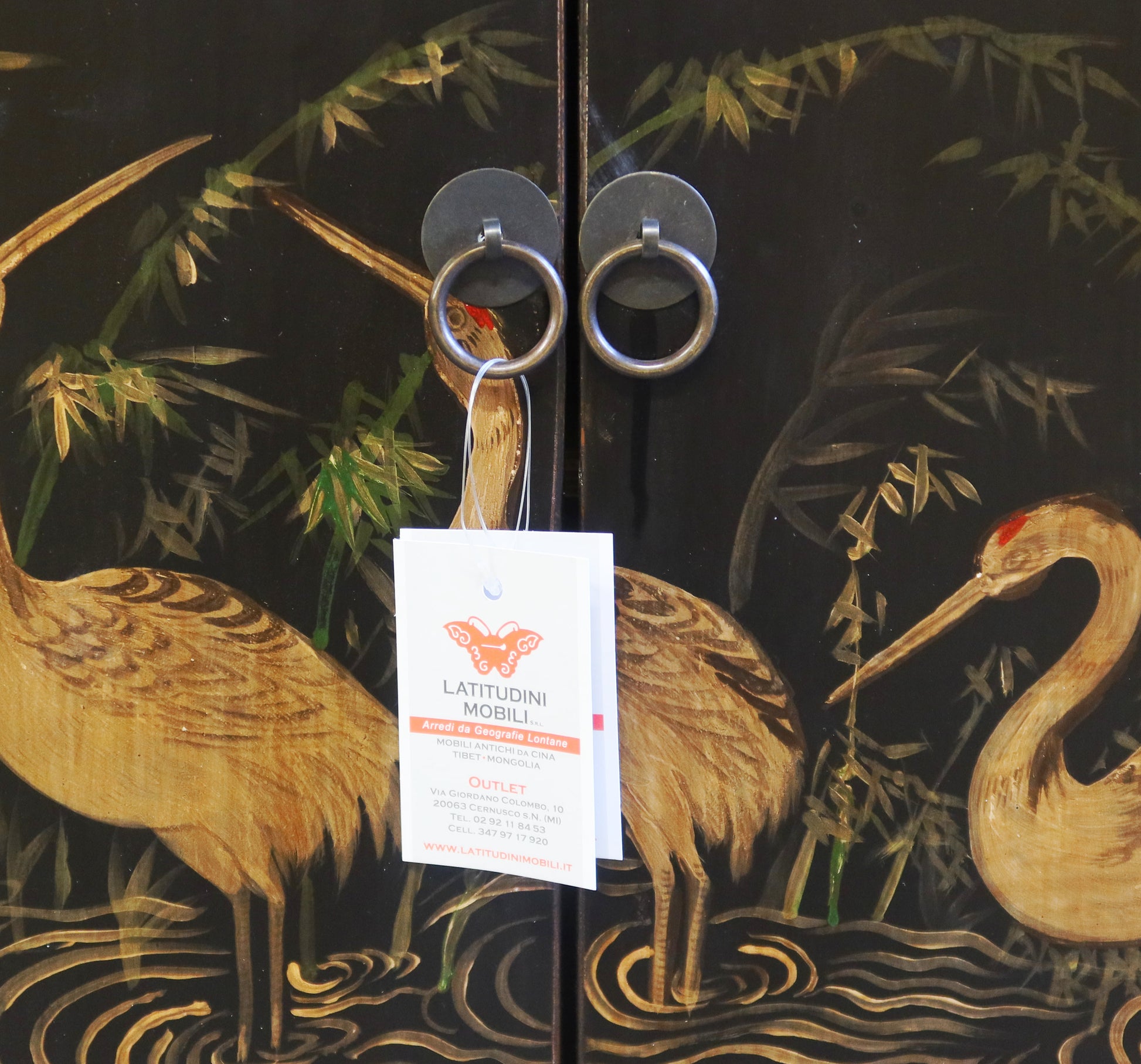 Credenzino ad un vano chiuso da doppia anta e due cassetti, con struttura in lacca aramncio caratterizzato da un bel decoro vivace di gru, uccelli eleganti con collo slanciato, dipinti in toni chiari su fondo nero. Ricordiamo che nella cultura cinese la gru rappresenta longevità, pace e prosperità.