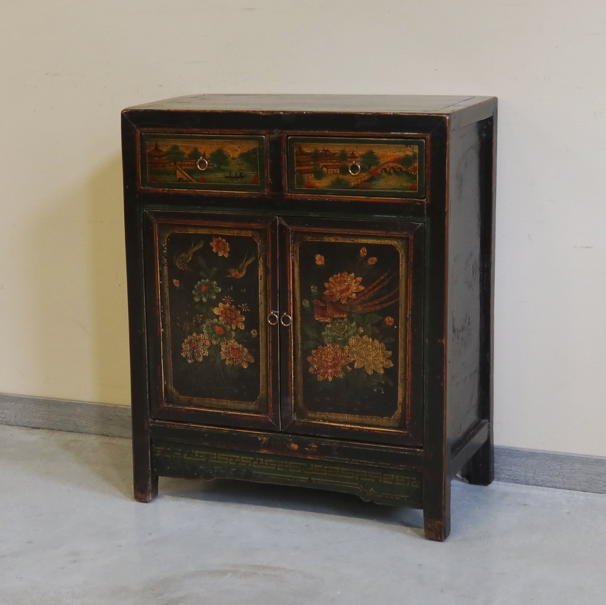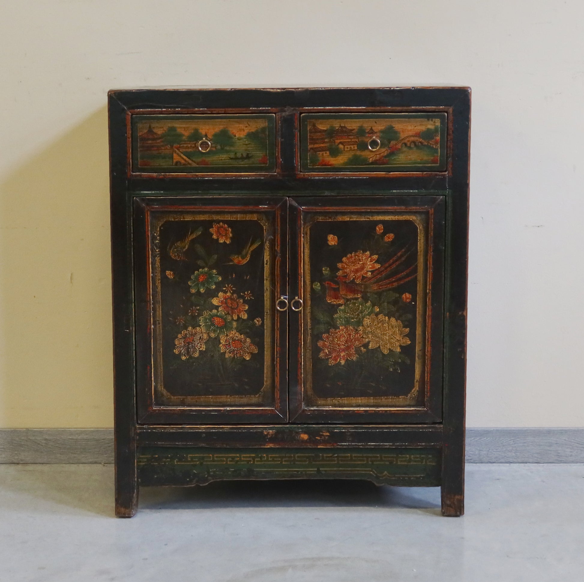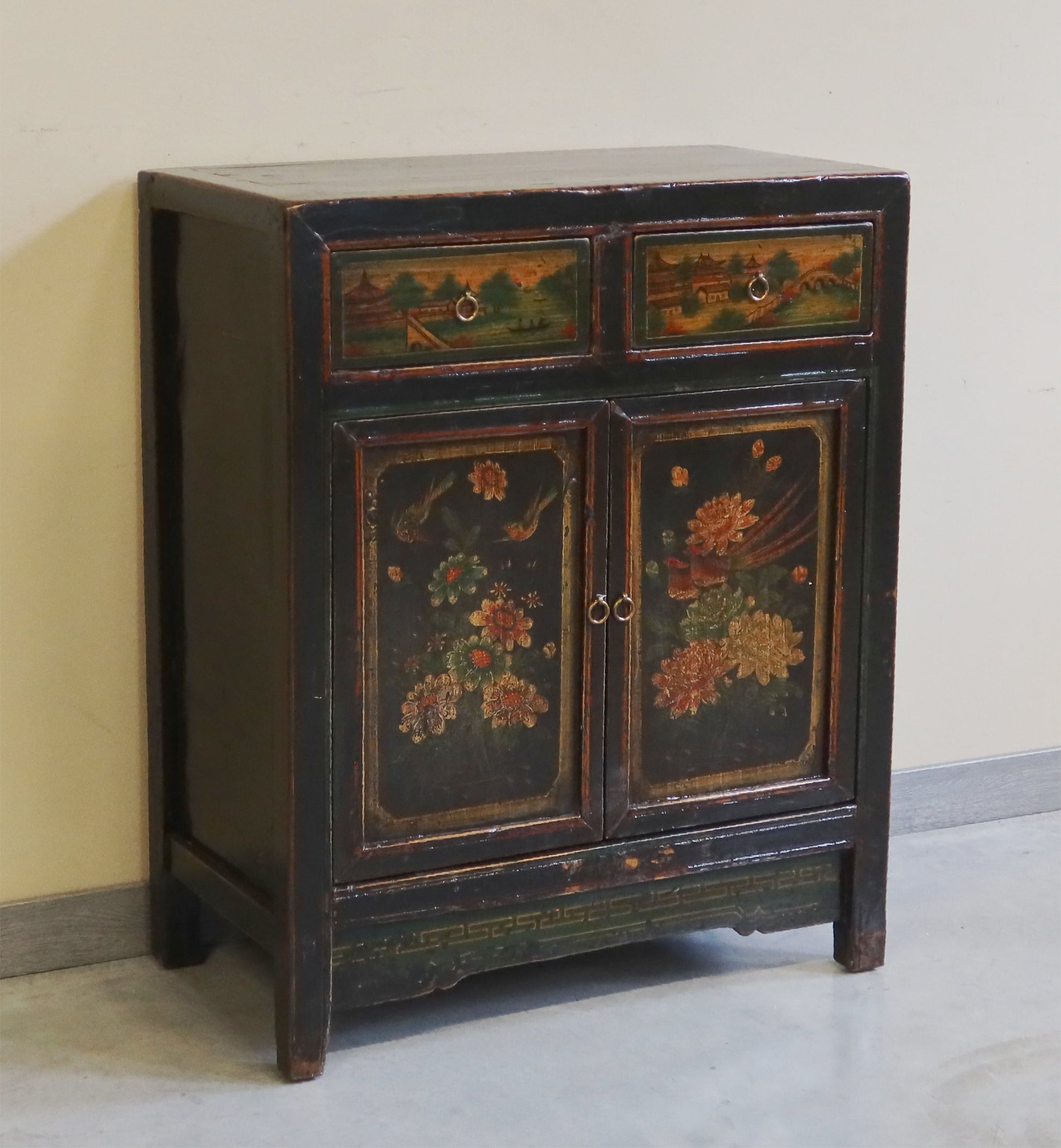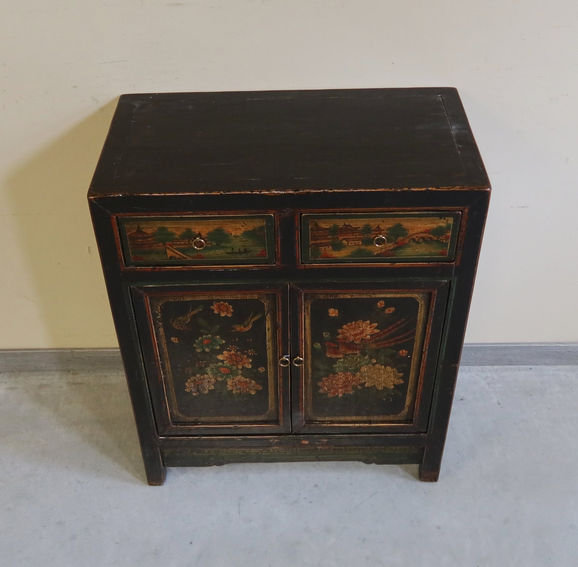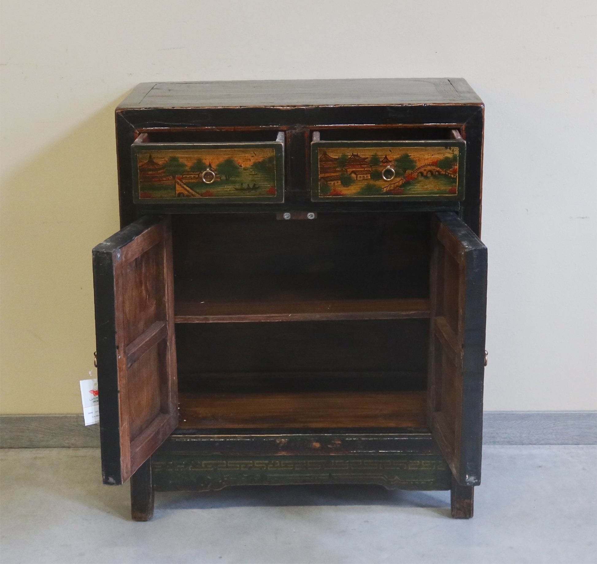 Credenzina ad un vano chiuso da due ante e due cassetti caratterizzato da un bel decoro pacato.