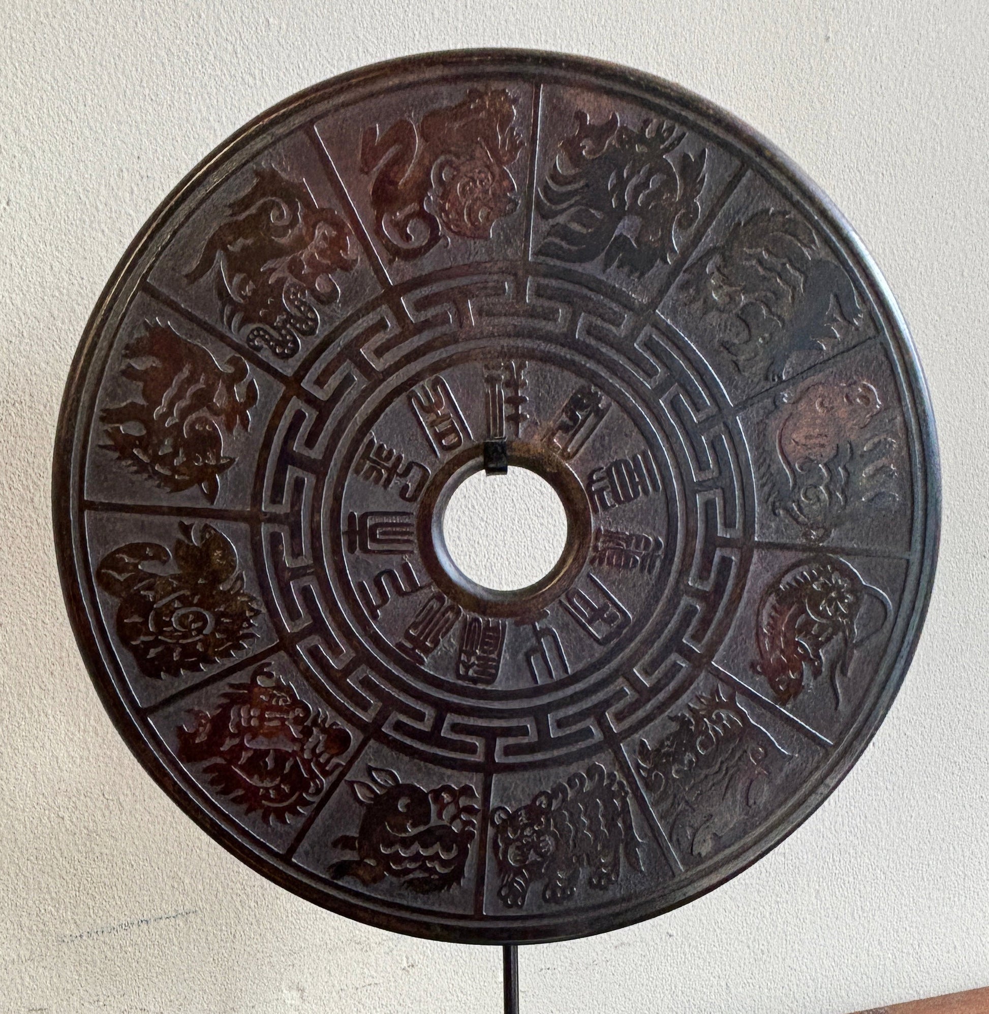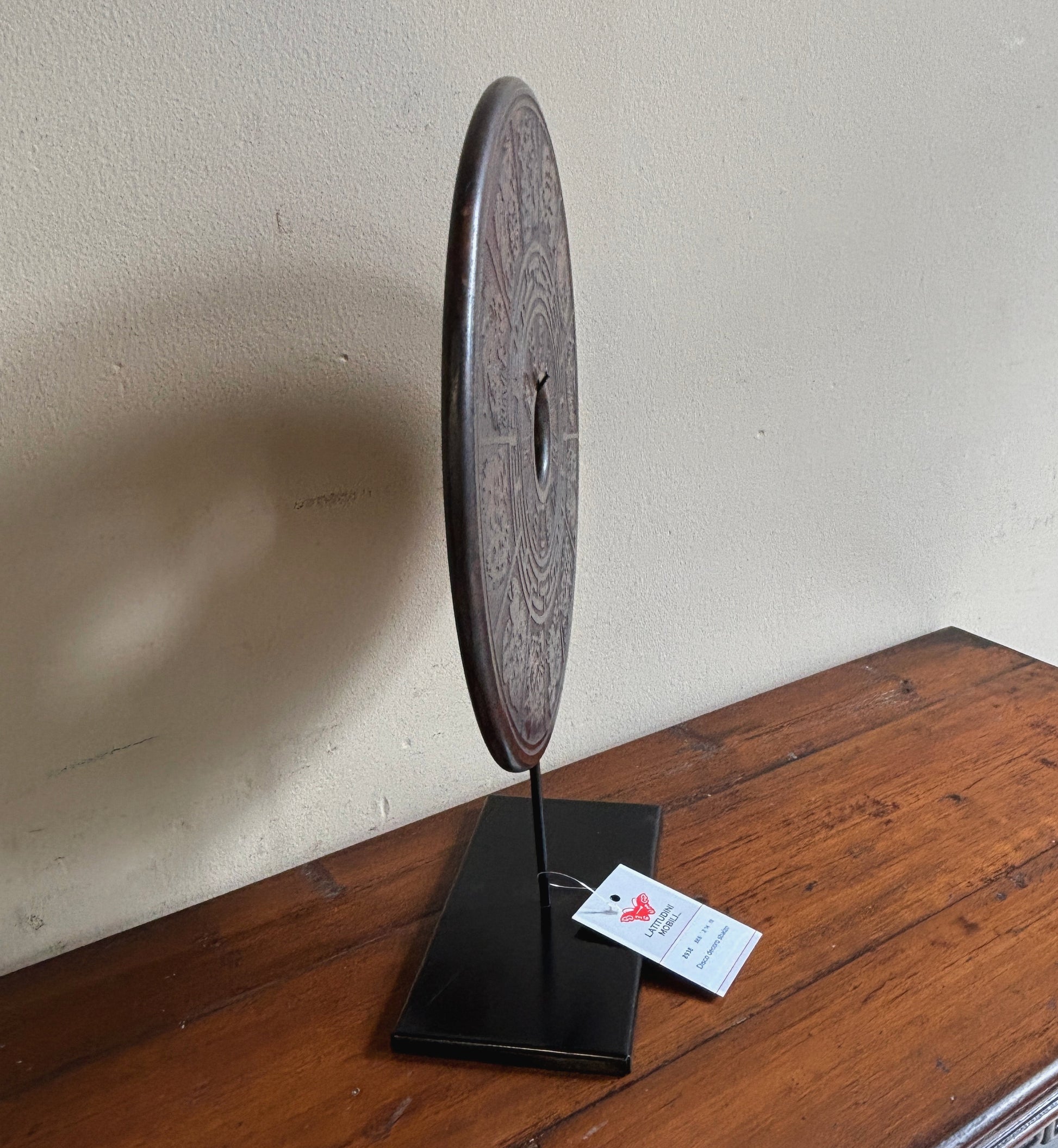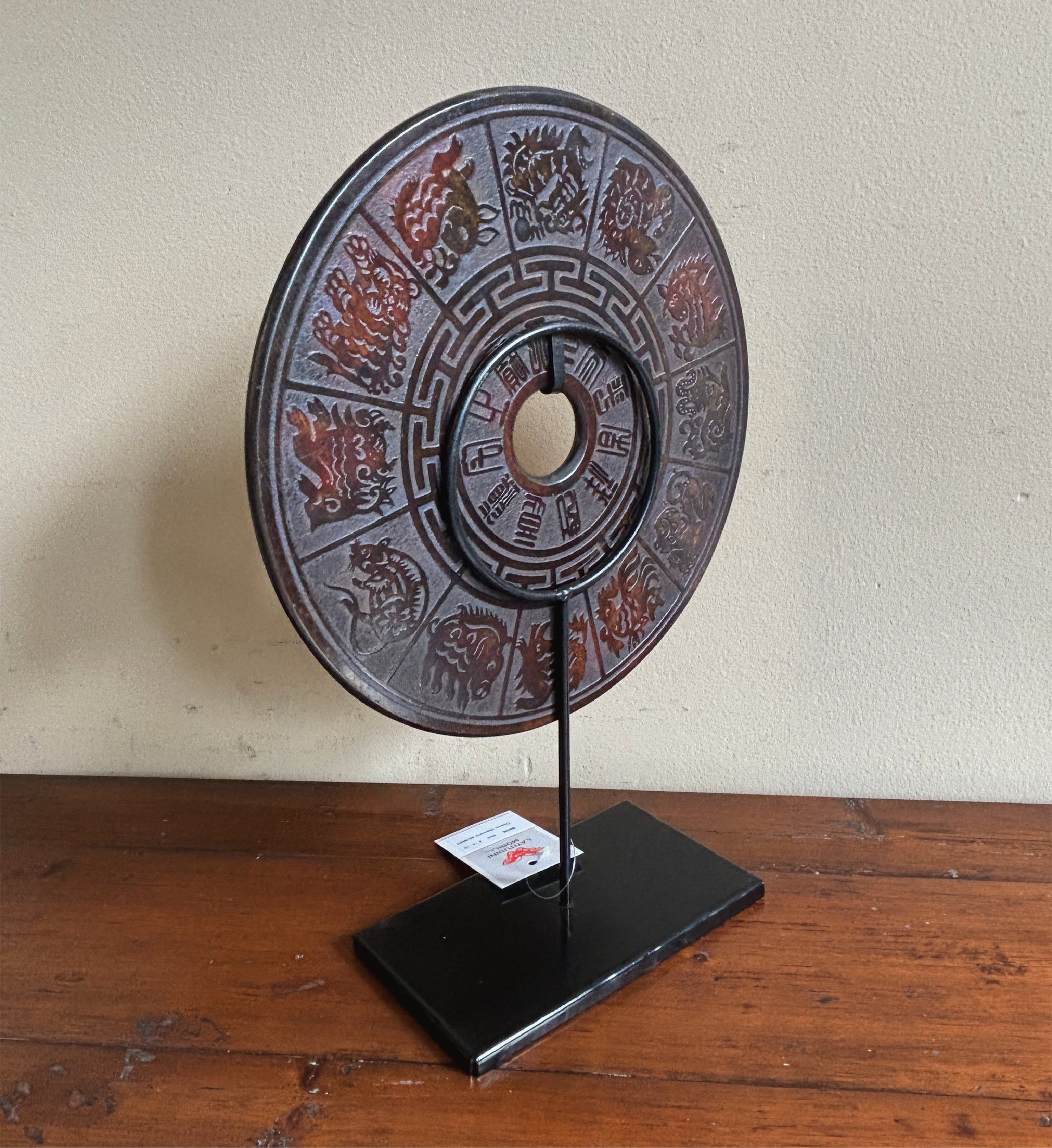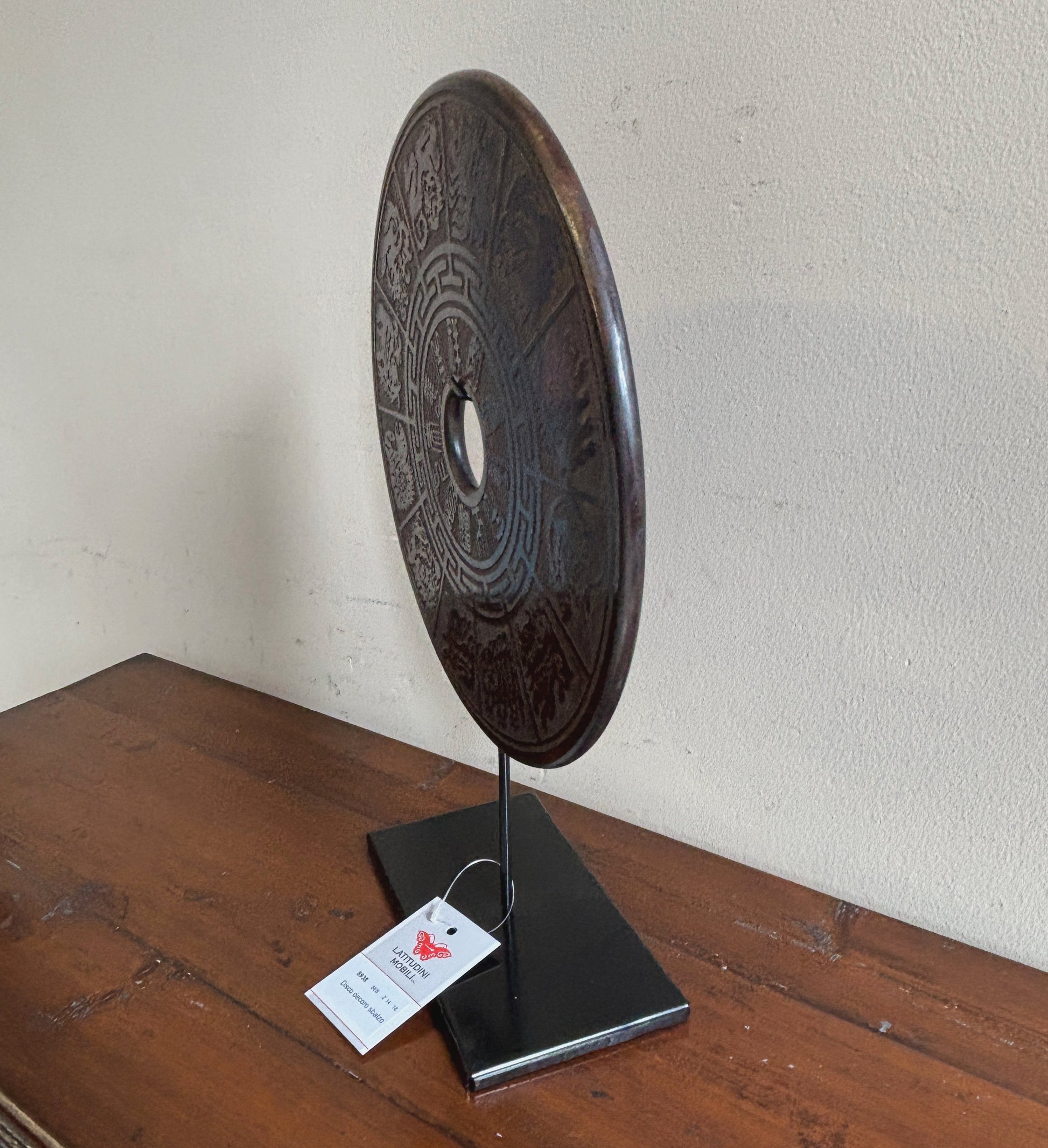 Le dimensioni indicate sulla scheda sono quelle del disco in pietra senza piedistallo: il piedistallo sul quale appoggia alza il disco di una decina di centimetri. L'altezza totale del piedestallo è di cm. 42